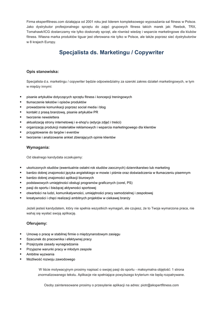 Firma ekspertfitness.com działająca od 2001 roku jest liderem kompleksowego wyposażania sal fitness w Polsce. Jako dystrybutor profesjonalnego sprzętu do zajęć grupowych fitness takich marek jak: Reebok, TRX, Tomahawk/ICG dostarczamy nie tylko doskonały sprzęt, ale również wiedzę i wsparcie marketingowe dla klubów fitness. Własna marka produktów tiguar jest oferowana nie tylko w Polsce, ale także poprzez sieć dystrybutorów w 8 krajach Europy. Specjalista ds. Marketingu / Copywriter Opis stanowiska: Specjalista d.s. marketingu / copywriter będzie odpowiedzialny za szeroki zakres działań marketingowych, w tym w między innymi:          pisanie artykułów dotyczących sprzętu fitness i koncepcji treningowych tłumaczenie tekstów i opisów produktów prowadzenie komunikacji poprzez social media i blog kontakt z prasą branżową, pisanie artykułów PR tworzenie newslettera aktualizację strony internetowej i e-shop'u (edycja zdjęć i treści) organizację produkcji materiałów reklamowych i wsparcia marketingowego dla klientów przygotowanie do targów i eventów tworzenie i analizowanie ankiet zbierających opinie klientów Wymagania: Od idealnego kandydata oczekujemy:        ukończonych studiów (ewentualnie ostatni rok studiów zaocznych) dziennikarstwo lub marketing bardzo dobrej znajomości języka angielskiego w mowie i piśmie oraz doświadczenia w tłumaczeniu pisemnym bardzo dobrej znajomości aplikacji biurowych podstawowych umiejętności obsługi programów graficznych (corel, PS) pasji do sportu i bieżącej aktywności sportowej otwartości na ludzi, komunikatywności, umiejętności pracy samodzielnej i zespołowej kreatywności i chęci realizacji ambitnych projektów w ciekawej branży Jeżeli jesteś kandydatem, który nie spełnia wszystkich wymagań, ale czujesz, że to Twoja wymarzona praca, nie wahaj się wysłać swoją aplikację. Oferujemy:       Umowę o pracę w stabilnej firmie o międzynarodowym zasięgu Szacunek do pracownika i efektywnej pracy Przejrzyste zasady wynagradzania Przyjazne warunki pracy w młodym zespole Ambitne wyzwania Możliwość rozwoju zawodowego W liście motywacyjnym prosimy napisać o swojej pasji do sportu - maksymalna objętość: 1 strona znormalizowanego tekstu. Aplikacje nie spełniające powyższego kryterium nie będą rozpatrywane. Osoby zainteresowane prosimy o przesyłanie aplikacji na adres: [email protected]