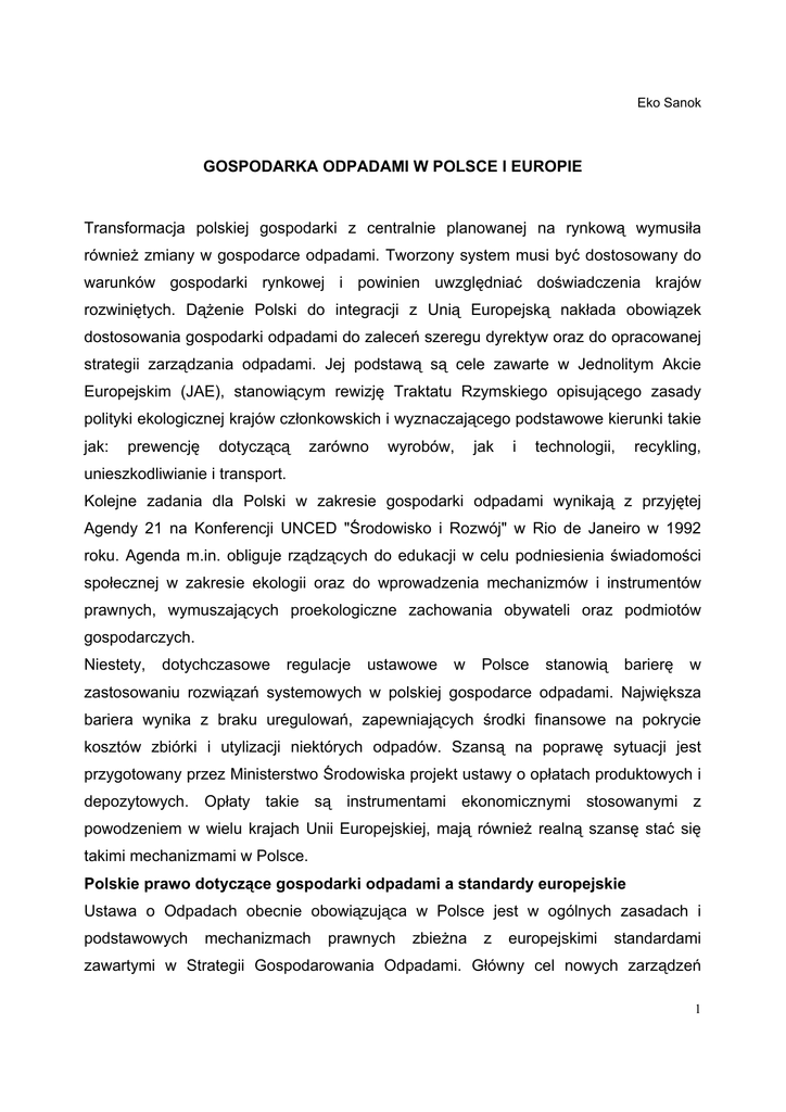 Eko Sanok GOSPODARKA ODPADAMI W POLSCE I EUROPIE Transformacja polskiej gospodarki z centralnie planowanej na rynkową wymusiła również zmiany w gospodarce odpadami. Tworzony system musi być dostosowany do warunków gospodarki rynkowej i powinien uwzględniać doświadczenia krajów rozwiniętych. Dążenie Polski do integracji z Unią Europejską nakłada obowiązek dostosowania gospodarki odpadami do zaleceń szeregu dyrektyw oraz do opracowanej strategii zarządzania odpadami. Jej podstawą są cele zawarte w Jednolitym Akcie Europejskim (JAE), stanowiącym rewizję Traktatu Rzymskiego opisującego zasady polityki ekologicznej krajów członkowskich i wyznaczającego podstawowe kierunki takie jak: prewencję dotyczącą zarówno wyrobów, jak i technologii, recykling, unieszkodliwianie i transport. Kolejne zadania dla Polski w zakresie gospodarki odpadami wynikają z przyjętej Agendy 21 na Konferencji UNCED "Środowisko i Rozwój" w Rio de Janeiro w 1992 roku. Agenda m.in. obliguje rządzących do edukacji w celu podniesienia świadomości społecznej w zakresie ekologii oraz do wprowadzenia mechanizmów i instrumentów prawnych, wymuszających proekologiczne zachowania obywateli oraz podmiotów gospodarczych. Niestety, dotychczasowe regulacje ustawowe w Polsce stanowią barierę w zastosowaniu rozwiązań systemowych w polskiej gospodarce odpadami. Największa bariera wynika z braku uregulowań, zapewniających środki finansowe na pokrycie kosztów zbiórki i utylizacji niektórych odpadów. Szansą na poprawę sytuacji jest przygotowany przez Ministerstwo Środowiska projekt ustawy o opłatach produktowych i depozytowych. Opłaty takie są instrumentami ekonomicznymi stosowanymi z powodzeniem w wielu krajach Unii Europejskiej, mają również realną szansę stać się takimi mechanizmami w Polsce. Polskie prawo dotyczące gospodarki odpadami a standardy europejskie Ustawa o Odpadach obecnie obowiązująca w Polsce jest w ogólnych zasadach i podstawowych mechanizmach prawnych zbieżna z europejskimi standardami zawartymi w Strategii Gospodarowania Odpadami. Główny cel nowych zarządzeń 1 Eko Sanok europejskich to ograniczenie składowania odpadów, jako metody ich utylizacji, przy równoczesnym promowaniu wszelkich działań prewencyjnych (zapobieganie powstawania i odpowiednie wykorzystanie odpadów). Teoretycznie polityce gospodarki odpadami w naszym kraju przyświecają te same cele, w praktyce jednak składowanie głównie ze względów finansowych, pozostaje główna metodą utylizacji odpadów. Regulacje Unii Europejskiej i Polski w tym zakresie różnią się w szczegółach. Dotyczy to np. braku w polskim prawie podziału odpadów na biodegradacyjne i inercyjne (nie podlegające istotnym zmianom fizycznym, chemicznym czy biologicznym, a więc w zasadzie nie zagrażające środowisku), jak również zakazów składowania odpadów w zależności od ich składu oraz właściwości. Polska ustawa nie precyzuje również cech odpadów (szczególnie jest to istotne w przypadku odpadów niebezpiecznych). W prawie Unii Europejskiej wprowadzone zostały obostrzenia w zakresie składowania konkretnych rodzajów odpadów (w tym głównie biodegradacyjnych, ich masa ma być sukcesywnie ograniczana, w roku 2010 nie będzie mogła przekraczać 25% masy z roku 1993). Dodatkowo odpady: płynne, zużyte, niektóre niebezpieczne (np. szpitalne, korozyjne, palne) nie będą mogły być składowane. Odpady niebezpieczne zostały zdefiniowane w załącznikach do dyrektywy o odpadach niebezpiecznych (91/689/EEC), dodatkowo sformułowano ich listę w postaci Europejskiego Katalogu Odpadów. Prawo europejskie w sposób bardzo szczegółowy określa zasady udzielania pozwoleń na prowadzenie składowisk odpadów, nakazując kompetentnym władzom regularne wizje lokalne przed ostateczna decyzją o budowie składowiska. Obowiązki prowadzącego składowisko są szerokie, obejmują m.in. obowiązek kontrolowania emisji gazów składowiskowych oraz ich gromadzenia w celu spalania lub wykorzystania, zasady przyjmowania odpadów na składowisko, obowiązek opracowania i wdrożenia specjalnego planu monitoringu składowiska (także przy jego likwidacji). Obowiązki kontroli składowiska obowiązują aż do momentu całkowitego wygaśnięcia jego szkodliwości na środowisko (po dokonaniu prawidłowej rekultywacji). W prawie polskim zakres obowiązków gospodarującego składowiskiem (wysypiskiem) jest określony stosunkowo pobieżnie. Ich uszczegółowienie ma następować dopiero na etapie pozwoleń na budowę pozostających w gestii indywidualnych decyzji 2 Eko Sanok administracyjnych. Podobnie niezbyt szczegółowo opisano obowiązki zarządzającego składowiskiem na etapie jego likwidacji. Przykłady systemów gospodarki odpadami w Europie Gospodarka odpadami w Niemczech Polityka gospodarki odpadami w Niemczech jest objęta kompleksowym programem rządowym i ma charakter zintegrowanej i prewencyjnej w dziedzinie ochrony środowiska. Podstawą jest bezwzględne przestrzegana zasada (często określana skrótem PPP od angielskiego zwrotu "pollutter pays principle"), mówiąca że konsekwencje finansowe ponosi sprawca zanieczyszczenia - "zanieczyszczający płaci". Zasada ta w pełni odpowiada warunkom gospodarki rynkowej, ponieważ rozwiązania z zakresu ochrony środowiska muszą być nie tylko skuteczne ekologicznie, ale również efektywne ekonomicznie. Publiczne środki finansowe są angażowane wówczas, gdy sprawca zanieczyszczenia nie może być jednoznacznie ustalony lub gdy trzeba szybko usunąć zagrożenie ekologiczne. Program rządowy obejmujący gospodarkę odpadami w Niemczech oparty jest na następujących dziesięciu regułach: 1. Koszt wynikające z tytułu zanieczyszczenie środowiska ponosi sprawca, którym może być producent lub użytkownik wyrobu. 2. Sprawca zanieczyszczenia środowiska odpadami, zgodnie z prawem karnym, traktowany jest na równi z podpalaczem lub złodz