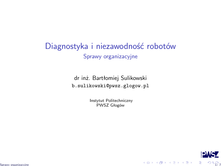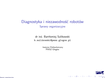 Diagnostyka i niezawodność robotów Sprawy organizacyjne dr inż. Bartłomiej Sulikowski [email protected] Instytut Politechniczny PWSZ Głogów Sprawy organizacyjne 1/ 7 Spis treści I Wprowadzenie I Warunki zaliczenia I Plan przedmiotu I Literatura do przedmiotu Sprawy organizacyjne 2/ 7 dr inż. Bartłomiej Sulikowski I e-mail [email protected] I konsultacje: Poniedziałki OD 8:45 DO 9:45 lub w przerwie między zajęciami I Niedziele „zjazdowe” w przerwie między zajęciami Przed przyjściem na konsultacje proszę o maila Sprawy organizacyjne 3/ 7 dr inż. Bartłomiej Sulikowski I e-mail [email protected] I konsultacje: Poniedziałki OD 8:45 DO 9:45 lub w przerwie między zajęciami I Niedziele „zjazdowe” w przerwie między zajęciami Przed przyjściem na konsultacje proszę o maila I Sprawy organizacyjne Prezentacje do wykładów będą udostępnione 3/ 7 Zasady zaliczenia przedmiotu I pisemny egzamin/sprawdzian wiadomości (?) podczas sesji egzaminacyjnej (poprawka pisemna w sesji poprawkowej), I Zakres materiału: wykład + laboratorium I na ocenę może mieć wpływ obecność na wykładach, I nie ma możliwości przepisania ocen z laboratorium. Sprawy organizacyjne 4/ 7 Plan wykładów 1. Wiadomości wstępne 2. Pojęcia podstawowe diagnostyki, niezawodności i bezpieczeństwa 3. Niezawodność obiektów prostych i złożonych 4. Diagnostyka przemysłowa 5. Badania diagnostyczne maszyn (robotów) Sprawy organizacyjne 5/ 7 Literatura 1. Inżynieria niezawodności. Poradnik. T 2. red. J. Midgalski, ATR, Bydgoszcz, Zetom, Warszawa, 1992 2. Diagnostyka maszyn - Zasady ogólne. Przykłady zastosowań. Cempel Cz., MCNEMT, Radom, 1992 3. Eksploatacja systemów technicznych, Kaźmierczak J., Wyd. Politechniki Śląskiej, 2000 4. Podstawy eksploatacji maszyn i urządzeń, WSiP, Legutko S., Warszawa, 2004 5. Diagnostyka techniczna elektrycznych urządzeń przemysłowych, Żółtowski B., Józefik W, Wyd. ATR, Bydgoszcz, 1996 6. zaufane źródła internetowe 7. i wiele innych Sprawy organizacyjne 6/ 7 Sprawy organizacyjne Jeśli nie ma pytań, to dziękuję za uwagę! 7/ 7