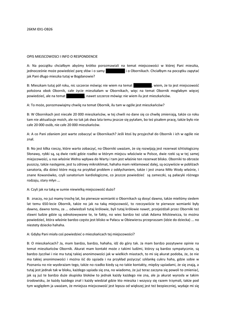 26KM IDI1-OB26 OPIS MIEJSCOWOSCI I INFO O RESPONDENCIE A: Na początku chciałbym abyśmy krótko porozmawiali na temat miejscowości w której Pani mieszka, jednocześnie może powiedzieć parę słów i o samy Bogdanowie i o Obornikach. Chciałbym na początku zapytać jak Pani długo mieszka tutaj w Bogdanowie? B: Mieszkam tutaj pół roku, nic szczerze mówiąc nie wiem na temat Bogdanowa, wiem, że to jest miejscowość położona obok Obornik, całe życie mieszkałam w Obornikach, więc na temat Obornik mogłabym więcej powiedzieć, ale na temat Bogdanowa, nawet szczerze mówiąc nie wiem ilu jest mieszkańców. A: To może, porozmawiajmy chwilę na temat Obornik, ilu tam w ogóle jest mieszkańców? B: W Obornikach jest niecałe 20 000 mieszkańców, w tej chwili no dane się co chwilę zmieniają, także co roku tam nie aktualizuje moich, ale no tak jak dwa lata temu jeszcze się pytałam, bo też pisałem pracę, także było nie całe 20 000 osób, nie całe 20 000 mieszkańców. A: A co Pani zdaniem jest warte zobaczyć w Obornikach? Jeśli ktoś by przyjechał do Obornik i ich w ogóle nie znał. B: No jest kilka rzeczy, które warto zobaczyć, no Oborniki uważam, że się rozwijają jest rezerwat ichtiologiczny Słonawy, rybki są, są dwie rzeki gdzie rzadko w którym miejscu właściwie w Polsce, dwie rzeki są w tej samej miejscowości, u nas właśnie Wełna wpływa do Warty i tam jest właśnie ten rezerwat blisko. Oborniki to obrzeże puszczy, także następnie, jest tu zdrowy mikroklimat, hahaha mam reklamować dalej, są oczywiście w pobliżach sanatoria, dla dzieci które mają na przykład problem z oddychaniem, także i jest znana Miło Wody właśnie, i znane Kowanówko, czyli sanatorium kardiologiczne, co jeszcze powiedzieć są zameczki, są pałacyki różnego rodzaju, stary młyn ... A: Czyli jak na taką w sumie niewielką miejscowość dużo? B: znaczy, no już mamy trochę lat, bo pierwsze wzmianki o Obornikach są dosyć dawno, także mieliśmy siedem lat temu 650-lecie Obornik, także no jak na taką miejscowość, to rzeczywiście te pierwsze wzmianki były dawno, dawno temu, za ... odwiedzali tutaj królowie, byli tutaj królowie nawet, przejeżdżali przez Oborniki też sławni ludzie gdzie są odnotowywane te, te fakty, no wiec bardzo też szlak Adama Mickiewicza, to można powiedzieć, która właśnie bardzo często jest blisko w Pałacu w Obiewierzu przepraszam (idzie do dziecka) ... no niestety dziecko hahaha. A: Gdyby Pani miała coś powiedzieć o mieszkańcach tej miejscowości? B: O mieszkańcach? Ja, mam bardzo, bardzo, hahaha, idź do góry tak. Ja mam bardzo pozytywne opinie na temat mieszkańców Obornik. Akurat mam kontakt może z takimi ludźmi, którzy są bardzo sympatycznie, są bardzo życzliwi i nie ma tutaj takiej anonimowości jak w wielkich miastach, to mi się akurat podoba, że, że nie ma takiej anonimowości i można iść do sąsiada i na przykład pożyczyć szklankę cukru haha, gdzie sobie w Poznaniu no nie wyobrażam tego, także no rzadko kiedy są no takie kontakty, między sąsiadami, że się znają, a tutaj jest jednak tak w bloku, każdego sąsiada się zna, no wiadomo, że już teraz zaczyna się powoli to zmieniać, jak są już te bardzo duże skupiska bloków to jednak każdy każdego nie zna, ale ja akurat wyrosła w takim środowisku, że każdy każdego znał i każdy wiedział gdzie kto mieszka i wszyscy się razem trzymali, także pod tym względem ja uważam, że mniejsza miejscowość jest lepsza od większej jest też bezpieczniej, wydaje mi się na wychowywanie, dla wychowywania dzieci, nie zdarzają się jakieś super jakieś wandalizmy i wiadomo, że od czasu do czasu zdarza się jakiś przypadek, ale nie słychać tego naokoło, nie otacza nas to być może tak bezpośrednio i nie odczuwamy tego. W ten sposób, także my jako my czujemy się bezpiecznie, a tutaj, nie wyobrażałabym sobie życia z dziećmi, wyjście, nie wiem wieczorną porą z dzieckiem, czy z mężem i zaczepianie i tak dalej, także ja uważam, że akurat mniejsza, mniejsza miejscowość pod tym względem jest lepsza. A: Czy jest coś szczególnego co by wyróżniało Oborniki z jednej strony jako miejscowość, a z drugiej ich mieszkańców na przykład od innych takich średnich miejscowości. B: Oczywiście, że jest ja się tutaj urodziłam, haha, zawsze dla mnie będzie priorytetem tutaj Oborniki niż inna miejscowość, o tutaj się zżyłam znam ludzi, znam okolice i wrosłam w ten klimat, także ja sobie nie wyobrażam mieszkać gdzie indziej. A: Rozumiem. Proszę w kilku słowach opowiedzieć o swojej rodzinie, z ilu składa się osób, co państwo wszyscy robicie. B: Moja rodzina składa się w tej chwili z trzech osób, męża, który jest blacharzem samochodowym, pracuje w „Autolamie”, naczy tu w drodze, Jelonek to chyba... A: A Jelonek. B: Jelonek, Jelonek tam, moja córeczka Ewelinka ma trzy latka, no jest jeszcze jedno maleństwo, ale dopiero w brzuszku więc jeszcze ma nie całe pół roku na wyklucie się, że tak powiem haha. A: Będzie synek, czy córeczka? B: Nie, jeszcze za wcześnie jest by oceniać płeć dziecka, no i ja. (Dziecko woła) słucham cię? Przepraszam ... A: Pani obecnie pozostaje w domu tak? B: Nie, pracuję, pracuję, ale akurat w tym momencie mam zwolnienie z racje tego, że się gorzej czuję, ale normalnie pracuję, pracuję w szkole podstawowej niedaleko tutaj stąd, jestem sekretarzem szkoły. A: Jak długo Pani już pracuje? B: Dwa lata ponad. A: Jest Pani zadowolona z pracy? B: Tak, tak, tak, haha, chociaż wiadomo mogłyby być lepsze pieniążki i nie na pół eteatu. Pracuję na pół etatu żeby być więcej z córką no i wiadomo że to się wiąże z mniejszymi pieniążkami. MAPA A: Ta żółta kartka jest mapą Pani celów życiowych ... (woła córka) ... proszę aby Pani wykleiła wszystkie cele życiowe jakie sobie Pani wyobraża teraz, jeśli jakiś cel nie znajdu