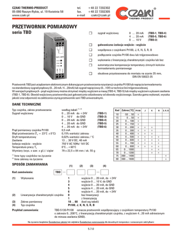 CZAKI THERMO-PRODUCT 05-090 Raszyn-Rybie, ul. 19 Kwietnia 58 www.czaki.pl tel. +48 22 7202302 fax. +48 22 7202305 e-mail [email protected] PRZETWORNIK POMIAROWY seria TBD sygnał wyjściowy 0 ... 20 mA 4 ... 20 mA 0 ... 10 V (TBD-1, TBD-4) (TBD-5, TBD-6) (TBD-3) galwaniczna izolacja wejście - wyjście współpraca z czujnikami Pt100, J, K, N, S, R, B podłączenie czujnika Pt100 dwu lub trójprzewodowo wykonania z linearyzacją charakterystyki czujnika lub bez automatyczna kompensacja temperatury zimnych końców termoelementu pomiarowego obudowa przystosowana do montażu na szynie 35 mm, DIN EN 50022-35 Przetwornik TBD jest urządzeniem elektronicznym dokonującym przetworzenia rezystancji czujnika Pt100 lub napięcia termoelementu na standardowy sygnał prądowy (0...20 mA / 4...20mA) lub sygnał napięciowy (0...10V) w technice linii trójprzewodowej. W wersjach prądowych - prąd wyjściowy można otrzymać między wyjściem a masą (TBD-4, TBD-5) lub między wyjściem a plusem zasilania (TBD-1, TBD-6). Obwód wejściowy przetwornika jest galwanicznie odizolowany od obwodu wyjściowego. Szeroka gama wykonań, wysoka jakość oraz odporność na zakłócenia czynią przetworniki serii TBD uniwersalnymi. DANE TECHNICZNE Typ czujnika, zakres przetwarzania Sygnał wyjściowy Prąd pomiarowy czujnika Pt100 Błąd przetwarzania (TO = 23°C ±5°C) Dryft temperaturowy Zasilanie Izolacja wejście - wyjście Temperatura pracy TO Wymiary (wys. x szer. x gł.) / ciężar (1) (2) według tabeli (1), (2) 0 ... 20 mA do +24V 0 ... 10 V do GND 0 ... 20 mA do GND 4 ... 20 mA do GND 4 ... 20 mA do +24V 0,5 mA 0,15% wartości zakresu 0,02% wartości zakresu / °C 13 ... 30 V DC, 40 mA 750 V AC 50Hz/ 1kV DC 0°C...+60°C 79 x 22,5 x 84 mm / ok. 55 g Kod Zakres [°C] (TBD-1) (TBD-3) (TBD-4) (TBD-5) (TBD-6) Inne typy czujników na życzenie Inne zakresy na życzenie SPOSÓB ZAMAWIANIA Kod zamówienia: (1) (3) -50 ... 50 0 ... 50 0 ... 100 0 ... 150 0 ... 200 0 ... 300 0 ... 400 0 ... 500 0 ... 600 0 ... 700 0 ... 800 0 ... 1000 0 ... 1200 300 ... 1400 300 ... 1600 Pt100 J K N + + + + + + + + + + + + + + + + + + + + + + + + + + + + + + + + + S, R, B (4) TBD (1) Wykonanie (2) Linearyzacja charakterystyki czujnika (3) (4) Zakres pomiarowy Typ czujnika Przykład zamawiania: (2) 10 15 20 25 30 35 40 45 50 55 60 65 70 75 80 1 wyjście 0 ... 20 mA, do +24V 3 wyjście 0 ... 10 V, do GND 4 wyjście 0 ... 20 mA, do GND 5 wyjście 4 ... 20 mA, do GND 6 wyjście 4 ... 20 mA, do +24V 0 bez linearyzacji 1 z linearyzacją 10 ... 80 (kod wg tabeli) Pt100, J, K, N, S, R, B TBD-5130-Pt100 oznacza przetwornik współpracujący z czujnikiem temperatury Pt100 o zakresie 0...200°C, z linearyzacją charakterystyki czujnika, z wyjściem 4...20 mA odniesionym do minusa zasilania (GND). Na życzenie bezpłatne Świadectwo jakości lub odpłatne Świadectwo wzorcowania dla dowolnych temperatur z oznaczonymi odchyłkami 5.7.0 + +