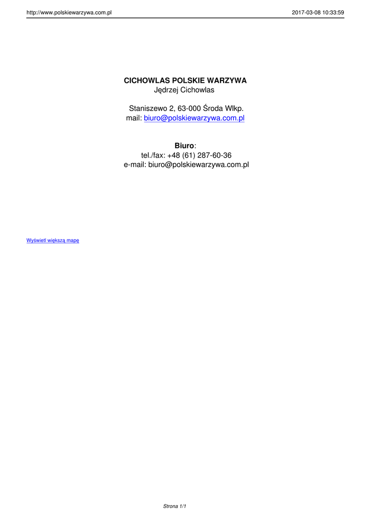 http://www.polskiewarzywa.com.pl 2017-03-08 10:33:59 CICHOWLAS POLSKIE WARZYWA Jędrzej Cichowlas Staniszewo 2, 63-000 Środa Wlkp. mail: [email protected] Biuro: tel./fax: +48 (61) 287-60-36 e-mail: [email protected] Wyświetl większą mapę Strona 1/1