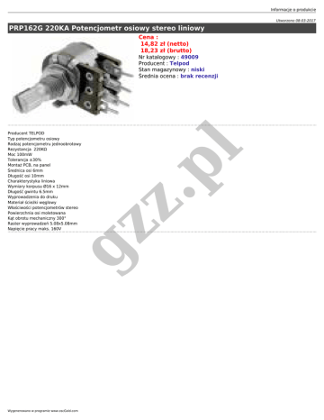 Informacje o produkcie Utworzono 08-03-2017 PRP162G 220KA Potencjometr osiowy stereo liniowy Cena : 14,82 zł (netto) 18,23 zł (brutto) gz z Producent TELPOD Typ potencjometru osiowy Rodzaj potencjometru jednoobrotowy Rezystancja 220KΩ Moc 100mW Tolerancja ±30% Montaż PCB, na panel Średnica osi 6mm Długość osi 10mm Charakterystyka liniowa Wymiary korpusu Ø16 x 12mm Długość gwintu 6.5mm Wyprowadzenia do druku Materiał ścieżki węglowy Właściwości potencjometrów stereo Powierzchnia osi moletowana Kąt obrotu mechaniczny 300° Raster wyprowadzeń 5.08x5.08mm Napięcie pracy maks. 160V .p l Nr katalogowy : 49009 Producent : Telpod Stan magazynowy : niski Średnia ocena : brak recenzji Wygenerowano w programie www.oscGold.com
