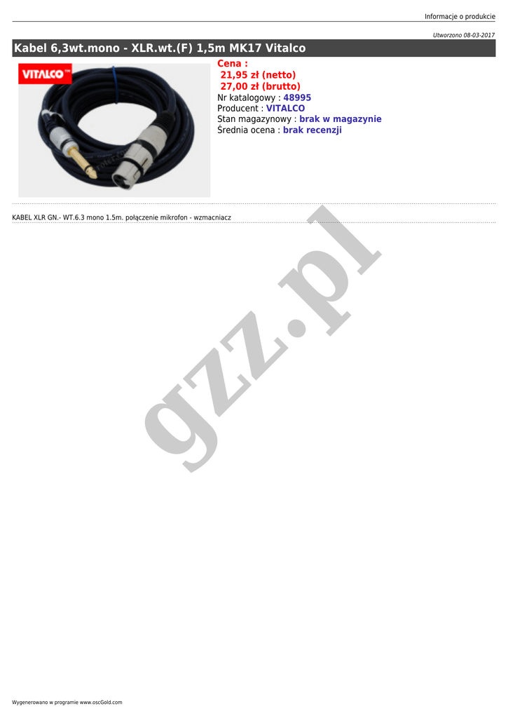 Informacje o produkcie Utworzono 08-03-2017 Kabel 6,3wt.mono - XLR.wt.(F) 1,5m MK17 Vitalco Cena : 21,95 zł (netto) 27,00 zł (brutto) Nr katalogowy : 48995 Producent : VITALCO Stan magazynowy : brak w magazynie Średnia ocena : brak recenzji gz z .p l KABEL XLR GN.- WT.6.3 mono 1.5m. połączenie mikrofon - wzmacniacz Wygenerowano w programie www.oscGold.com