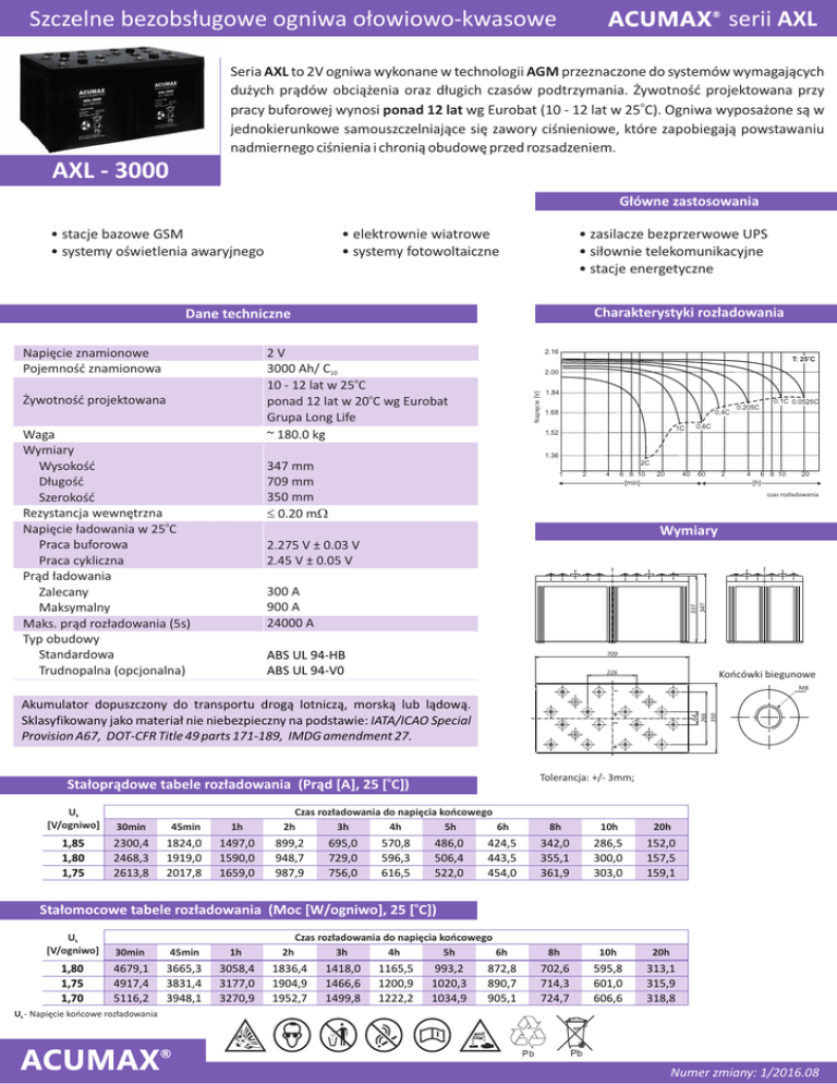 Szczelne bezobsługowe ogniwa ołowiowo-kwasowe serii AXL Seria AXL to 2V ogniwa wykonane w technologii AGM przeznaczone do systemów wymagających dużych prądów obciążenia oraz długich czasów podtrzymania. Żywotność projektowana przy pracy buforowej wynosi ponad 12 lat wg Eurobat (10 - 12 lat w 25oC). Ogniwa wyposażone są w jednokierunkowe samouszczelniające się zawory ciśnieniowe, które zapobiegają powstawaniu nadmiernego ciśnienia i chronią obudowę przed rozsadzeniem. AXL - 3000 Główne zastosowania • stacje bazowe GSM • systemy oświetlenia awaryjnego • elektrownie wiatrowe • systemy fotowoltaiczne • zasilacze bezprzerwowe UPS • siłownie telekomunikacyjne • stacje energetyczne Charakterystyki rozładowania Dane techniczne 2V 3000 Ah/ C10 o 10 - 12 lat w 25 C o ponad 12 lat w 20 C wg Eurobat Grupa Long Life ~ 180.0 kg Żywotność projektowana Waga Wymiary Wysokość Długość Szerokość Rezystancja wewnętrzna o Napięcie ładowania w 25 C Praca buforowa Praca cykliczna Prąd ładowania Zalecany Maksymalny Maks. prąd rozładowania (5s) Typ obudowy Standardowa Trudnopalna (opcjonalna) 2.16 o T: 25 C 2.00 Napięcie [V] Napięcie znamionowe Pojemność znamionowa 1.84 0.4C 1.68 1C 1.52 0.205C 0.1C 0.0525C 0.6C 1.36 347 mm 709 mm 350 mm £ 0.20 mW 2C 1 2 4 6 8 10 [min] 20 40 60 2 4 6 8 10 [h] 20 czas rozładowania Wymiary 2.275 V ± 0.03 V 2.45 V ± 0.05 V 337 347 300 A 900 A 24000 A ABS UL 94-HB ABS UL 94-V0 709 226 Końcówki biegunowe M8 64 266 350 Akumulator dopuszczony do transportu drogą lotniczą, morską lub lądową. Sklasyfikowany jako materiał nie niebezpieczny na podstawie: IATA/ICAO Special Provision A67, DOT-CFR Title 49 parts 171-189, IMDG amendment 27. Tolerancja: +/- 3mm; o Stałoprądowe tabele rozładowania (Prąd [A], 25 [ C]) Uk [V/ogniwo] 30min 45min 1h 1,85 1,80 1,75 2300,4 2468,3 2613,8 1824,0 1919,0 2017,8 1497,0 1590,0 1659,0 Czas rozładowania do napięcia końcowego 2h 3h 4h 5h 6h 8h 10h 20h 570,8 596,3 616,5 342,0 355,1 361,9 286,5 300,0 303,0 152,0 157,5 159,1 899,2 948,7 987,9 695,0 729,0 756,0 486,0 506,4 522,0 424,5 443,5 454,0 o Stałomocowe tabele rozładowania (Moc [W/ogniwo], 25 [ C]) Uk [V/ogniwo] 30min 45min 1h 2h 1,80 1,75 1,70 4679,1 4917,4 5116,2 3665,3 3831,4 3948,1 3058,4 3177,0 3270,9 1836,4 1904,9 1952,7 Czas rozładowania do napięcia końcowego 3h 4h 5h 6h 1418,0 1466,6 1499,8 1165,5 1200,9 1222,2 993,2 1020,3 1034,9 872,8 890,7 905,1 8h 10h 20h 702,6 714,3 724,7 595,8 601,0 606,6 313,1 315,9 318,8 Uk - Napięcie końcowe rozładowania Pb Numer zmiany: 1/2016.08