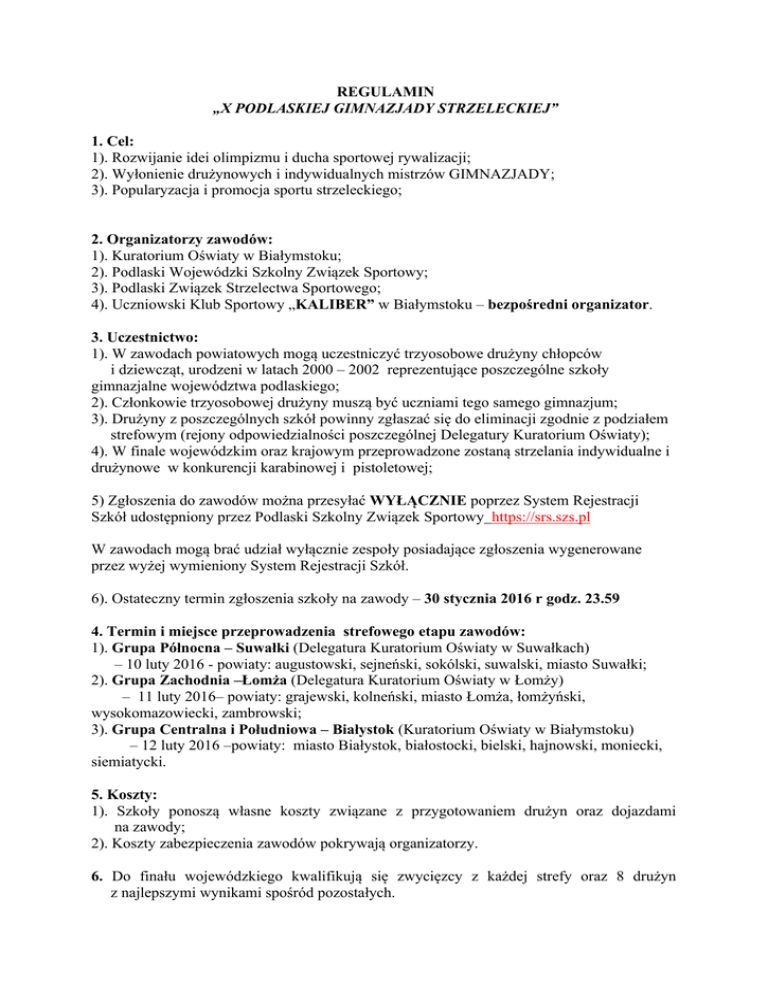 REGULAMIN „X PODLASKIEJ GIMNAZJADY STRZELECKIEJ” 1. Cel: 1). Rozwijanie idei olimpizmu i ducha sportowej rywalizacji; 2). Wyłonienie drużynowych i indywidualnych mistrzów GIMNAZJADY; 3). Popularyzacja i promocja sportu strzeleckiego; 2. Organizatorzy zawodów: 1). Kuratorium Oświaty w Białymstoku; 2). Podlaski Wojewódzki Szkolny Związek Sportowy; 3). Podlaski Związek Strzelectwa Sportowego; 4). Uczniowski Klub Sportowy „KALIBER” w Białymstoku – bezpośredni organizator. 3. Uczestnictwo: 1). W zawodach powiatowych mogą uczestniczyć trzyosobowe drużyny chłopców i dziewcząt, urodzeni w latach 2000 – 2002 reprezentujące poszczególne szkoły gimnazjalne województwa podlaskiego; 2). Członkowie trzyosobowej drużyny muszą być uczniami tego samego gimnazjum; 3). Drużyny z poszczególnych szkół powinny zgłaszać się do eliminacji zgodnie z podziałem strefowym (rejony odpowiedzialności poszczególnej Delegatury Kuratorium Oświaty); 4). W finale wojewódzkim oraz krajowym przeprowadzone zostaną strzelania indywidualne i drużynowe w konkurencji karabinowej i pistoletowej; 5) Zgłoszenia do zawodów można przesyłać WYŁĄCZNIE poprzez System Rejestracji Szkół udostępniony przez Podlaski Szkolny Związek Sportowy https://srs.szs.pl W zawodach mogą brać udział wyłącznie zespoły posiadające zgłoszenia wygenerowane przez wyżej wymieniony System Rejestracji Szkół. 6). Ostateczny termin zgłoszenia szkoły na zawody – 30 stycznia 2016 r godz. 23.59 4. Termin i miejsce przeprowadzenia strefowego etapu zawodów: 1). Grupa Północna – Suwałki (Delegatura Kuratorium Oświaty w Suwałkach) – 10 luty 2016 - powiaty: augustowski, sejneński, sokólski, suwalski, miasto Suwałki; 2). Grupa Zachodnia –Łomża (Delegatura Kuratorium Oświaty w Łomży) – 11 luty 2016– powiaty: grajewski, kolneński, miasto Łomża, łomżyński, wysokomazowiecki, zambrowski; 3). Grupa Centralna i Południowa – Białystok (Kuratorium Oświaty w Białymstoku) – 12 luty 2016 –powiaty: miasto Białystok, białostocki, bielski, hajnowski, moniecki, siemiatycki. 5. Koszty: 1). Szkoły ponoszą własne koszty związane z przygotowaniem drużyn oraz dojazdami na zawody; 2). Koszty zabezpieczenia zawodów pokrywają organizatorzy. 6. Do finału wojewódzkiego kwalifikują się zwycięzcy z każdej strefy oraz 8 drużyn z najlepszymi wynikami spośród pozostałych. 7. Finał wojewódzki odbędzie się w Białymstoku - 25 lutego 2016 r. 8. Finał krajowy VIII Ogólnopolskiej Gimnazjady Strzeleckiej odbędzie się w Bydgoszczy woj. kujawsko-pomorskie w marcu 2016 roku. Wezmą w nim udział zwycięskie drużyny w karabinie i pistolecie z finału wojewódzkiego; 9. Konkurencje strzeleckie – zasady eliminacji: 1). Eliminacje strefowe: karabin pneumatyczny – 15 min – czas przygotowawczy i strzały próbne + 20 strzałów ocenianych w postawie stojącej. Czas strzelania 30 minut; 2). Finał wojewódzki i krajowy: karabin pneumatyczny: – 15 min – czas przygotowawczy i strzały próbne + 30 strzałów ocenianych w postawie stojącej. Czas strzelania 40 minut; 10. Broń, amunicja i sprzęt strzelecki: 1). Eliminacje strefowe, finał wojewódzki i krajowy –zapewnia organizator bezpośredni; 2). Dopuszczalne będzie używanie na każdym etapie własnej broni i sprzętu strzeleckiego. 11. Klasyfikacja i nagrody: 1). Klasyfikacja prowadzona jest w kategorii zespołowej i indywidualnej, oddzielnie wśród chłopców i dziewcząt na każdym poziomie organizacyjnym; 2). Nagrody w eliminacjach strefowych – dyplomy od I-VI m, 3). Nagrody w finale wojewódzkim: Zespołowo: miejsca I – III puchary, medale i dyplomy dla szkół miejsca IV – VI dyplomy dla szkół miejsca I – III statuetki, dyplomy Indywidualnie: oraz IV – VI dyplomy 12. Informacje dodatkowe: Kontakty: z organizatorem bezpośrednim: z koordynatorem wojewódzkim: Uczniowski Klub Sportowy „Kaliber“ Kuratorium Oświaty w Białymstoku 15-879 Białystok ul. Stołeczna 21 15-950 Białystok, ul. Rynek Kościuszki 9 tel/fax (085)-874-98-16 tel. (085)-748-48-20, fax. (085)-748-48-49 http://www.ukskaliber.pl http://www.kuratorium.bialystok.pl e-mail: [email protected] koordynator Jolanta Jarczewska [email protected]