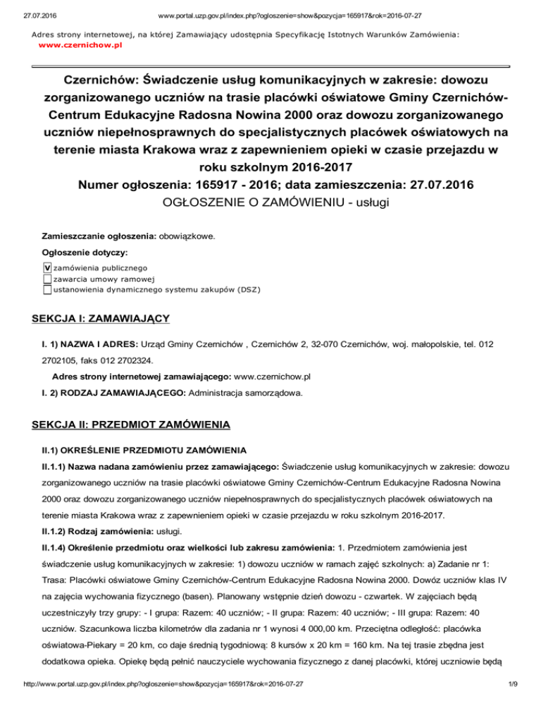 27.07.2016 www.portal.uzp.gov.pl/index.php?ogloszenie=show&pozycja=165917&rok=20160727 Adres strony internetowej, na której Zamawiający udostępnia Specyfikację Istotnych Warunków Zamówienia: www.czernichow.pl Czernichów: Świadczenie usług komunikacyjnych w zakresie: dowozu zorganizowanego uczniów na trasie placówki oświatowe Gminy Czernichów Centrum Edukacyjne Radosna Nowina 2000 oraz dowozu zorganizowanego uczniów niepełnosprawnych do specjalistycznych placówek oświatowych na terenie miasta Krakowa wraz z zapewnieniem opieki w czasie przejazdu w roku szkolnym 20162017 Numer ogłoszenia: 165917 2016; data zamieszczenia: 27.07.2016 OGŁOSZENIE O ZAMÓWIENIU usługi Zamieszczanie ogłoszenia: obowiązkowe. Ogłoszenie dotyczy: V zamówienia publicznego zawarcia umowy ramowej ustanowienia dynamicznego systemu zakupów (DSZ) SEKCJA I: ZAMAWIAJĄCY I. 1) NAZWA I ADRES: Urząd Gminy Czernichów , Czernichów 2, 32070 Czernichów, woj. małopolskie, tel. 012 2702105, faks 012 2702324. Adres strony internetowej zamawiającego: www.czernichow.pl I. 2) RODZAJ ZAMAWIAJĄCEGO: Administracja samorządowa. SEKCJA II: PRZEDMIOT ZAMÓWIENIA II.1) OKREŚLENIE PRZEDMIOTU ZAMÓWIENIA II.1.1) Nazwa nadana zamówieniu przez zamawiającego: Świadczenie usług komunikacyjnych w zakresie: dowozu zorganizowanego uczniów na trasie placówki oświatowe Gminy CzernichówCentrum Edukacyjne Radosna Nowina 2000 oraz dowozu zorganizowanego uczniów niepełnosprawnych do specjalistycznych placówek oświatowych na terenie miasta Krakowa wraz z zapewnieniem opieki w czasie przejazdu w roku szkolnym 20162017. II.1.2) Rodzaj zamówienia: usługi. II.1.4) Określenie przedmiotu oraz wielkości lub zakresu zamówienia: 1. Przedmiotem zamówienia jest świadczenie usług komunikacyjnych w zakresie: 1) dowozu uczniów w ramach zajęć szkolnych: a) Zadanie nr 1: Trasa: Placówki oświatowe Gminy CzernichówCentrum Edukacyjne Radosna Nowina 2000. Dowóz uczniów klas IV na zajęcia wychowania fizycznego (basen). Planowany wstępnie dzień dowozu czwartek. W zajęciach będą uczestniczyły trzy grupy: I grupa: Razem: 40 uczniów; II grupa: Razem: 40 uczniów; III grupa: Razem: 40 uczniów. Szacunkowa liczba kilometrów dla zadania nr 1 wynosi 4 000,00 km. Przeciętna odległość: placówka oświatowaPiekary = 20 km, co daje średnią tygodniową: 8 kursów x 20 km = 160 km. Na tej trasie zbędna jest dodatkowa opieka. Opiekę będą pełnić nauczyciele wychowania fizycznego z danej placówki, której uczniowie będą http://www.portal.uzp.gov.pl/index.php?ogloszenie=show&pozycja=165917&rok=20160727 1/9 27.07.2016 www.portal.uzp.gov.pl/index.php?ogloszenie=show&pozycja=165917&rok=20160727 uczestniczyć w zajęciach. 2) dowozu uczniów niepełnosprawnych do specjalistycznych placówek oświatowych na terenie miasta Krakowa wraz z zapewnieniem opieki w czasie przejazdu w roku szkolnym 20162017. b) Zadanie nr 2: Trasa: CzernichówKraków dowóz uczniów niepełnosprawnych do specjalistycznych placówek oświatowych. Szacunkowa liczba kilometrów dla zadania nr 2 wynosi 120 000,00 km. Cechy charakterystyczne zadania: dowóz 4 uczniów (2 z Kamienia, 1 z Rybnej, 1 z Wołowic) do placówki w Krakowie, ul. Praska 64; dowóz 1 ucznia z Kamienia do placówki w Krakowie, ul. Milana 15; dowóz 1 ucznia z Kłokoczyna do placówki w Krakowie, ul. Spadochroniarzy 1; dowóz 3 (1 z Rybnej, 2 z Czernichowa) uczniów do placówki w Krakowie, ul. Zakątek 2; dowóz 2 uczniów(1 z Przegini Duchownej, 1 z Dąbrowy Szlacheckiej) do placówki w Krakowie, ul. Szujskiego 2; dowóz 1 ucznia z Przegini Duchownej do placówki w Krakowie, os. Wysokie 7; dowóz 1 ucznia z Kamienia do placówki w Krakowie ul. Szopkarzy 8; dowóz 3 uczniów (1 z Nowej Wsi Szlacheckiej, 2 z Przegini Duchownej) do placówki w Krakowie, ul. Dobczycka 20; dowóz 1 ucznia z Czernichowa do placówki w Krakowie, ul. Zamojskiego 100; dowóz 3 uczniów (2 z Wołowic, 1 z Przegini Duchownej) do placówki w Krakowie, ul. Niecała 8; dowóz 1 ucznia z Rybnej do placówki w Krakowie, ul. Wietora 7; dowóz 1 ucznia z Rybnej do placówki w Krakowie, ul. Lipińskiego 2; dowóz 1 ucznia z Rusocic do placówki w Krakowie, ul. Tyniecka 6; dowóz 1 ucznia z Zagacia do placówki w Krakowie, ul. Topolowa 19; dowóz 1 ucznia z Rybnej do placówki w Krakowie, ul. Kijowska 3; dowóz 1 ucznia z Rybnej do placówki w Przegini Duchownej 70. 2. Usługi transportu publicznego muszą być realizowane taborem spełniającym warunki określone zawarte w Rozporządzeniu Ministra Infrastruktury z dnia 31 grudnia 2002 r. w sprawie warunków technicznych pojazdów oraz zakresu ich niezbędnego wyposażenia (tekst jedn. Dz. U. z 2015 r., poz. 305 z późn. zm.). 3. Zamawiający zastrzega, iż w każdym z zadań liczba uczniów podana w ust. 1 może ulec zmianie. Ostateczna liczba będzie znana po 15 września 2016 r. 4. Zamawiający zastrzega sobie możliwość wprowadzenia zmian zakresu zamówienia oraz wprowadzenia zmian do przedstawionych rozkładów jazdy oraz tras w przypadkach wynikających ze zmian organizacyjnych poszczególnych placówek oświatowych. 5. Wykonawca wskaże w ofercie części zamówienia, które zamierza powierzyć podwykonawcom. 6. Szczegółowy opis realizacji zadania nr 2: 1) w czasie przejazdu Wykonawca zapewni w każdym samochodzie opiekę sprawowaną przez osobę posiadającą wymagane uprawnienia do przewozu dzieci niepełnosprawnych, określone odrębnymi przepisami; 2) dowóz dzieci niepełnosprawnych będzie uzgadniany z rodzicami/prawnymi opiekunami dziecka. Kontakt z rodzicami/prawnymi opiekunami będzie podany przewoźnikowi po rozstrzygniętym postępowaniu przetargowym. Szczegółowy harmonogram dowozu dziecka z domu do szkoły i ze szkoły do domu będzie ustalony z Zamawiającym. Dzieci będą odbierane od rodziców/opiekunów prawnych spod domu o ustalonej wcześniej godzinie i po dowiezieniu na zajęcia będą przekazane pod opiekę nauczyciela lub in
