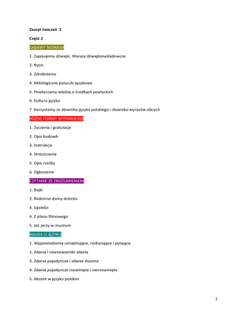 Zeszyt ćwiczeń 5 Część 2 ZABAWY SŁOWEM 1. Zapisujemy dźwięki. Wyrazy dźwiękonaśladowcze 2. Rytm 3. Zdrobnienia 4. Mitologiczne potyczki językowe 5. Powtarzamy wiedzę o środkach poetyckich 6. Kultura języka 7. Korzystamy ze słownika języka polskiego i słownika wyrazów obcych RÓŻNE FORMY WYPOWIEDZI 1. Życzenia i gratulacje 2. Opis budowli 3. Instrukcja 4. Streszczenie 5. Opis rzeźby 6. Ogłoszenie CZYTANIE ZE ZROZUMIENIEM 1. Bajki 2. Rodzinne domy dziecka 3. Sąsiedzi 4. Z planu filmowego 5. Jeż Jerzy w muzeum NAUKA O JĘZYKU 1. Wypowiedzenie oznajmujące, rozkazujące i pytające 2. Zdania i równoważniki zdania 3. Zdanie pojedyncze i zdanie złożone 4. Zdanie pojedyncze rozwinięte i nierozwinięte 5. Akcent w języku polskim 1 ORTOGRAFIA 1. Pisownia wyrazów z rz, ż, ch, h – inne reguły 2. Interpunkcja zdania złożonego 3. Interpunkcja w zdaniu pojedynczym 4. Wymowa a zapis głosek 5. Cytat 2
