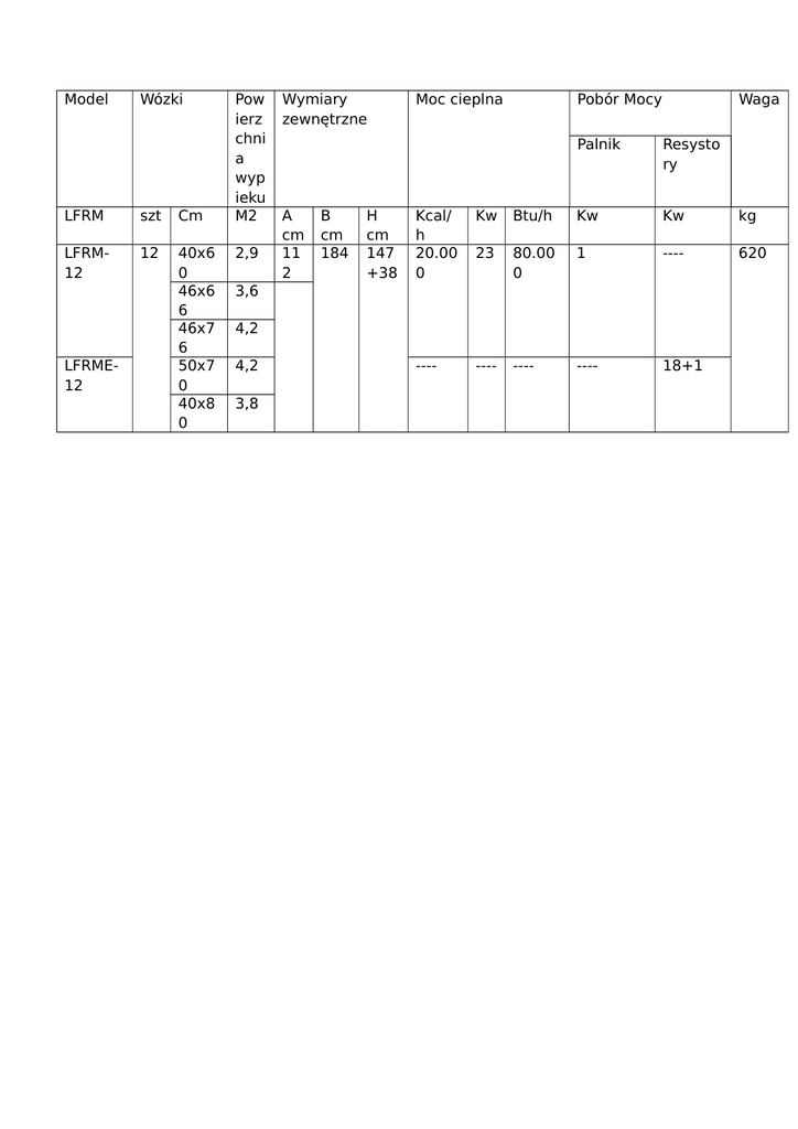 Model Wózki LFRM szt Cm LFRM12 12 40x6 0 46x6 6 46x7 6 50x7 0 40x8 0 LFRME12 Pow ierz chni a wyp ieku M2 2,9 Wymiary zewnętrzne A cm 11 2 B cm 184 H cm 147 +38 Moc cieplna Pobór Mocy Waga Palnik Resysto ry Kcal/ h 20.00 0 Kw Btu/h Kw Kw kg 23 80.00 0 1 ---- 620 ---- ---- ---- ---- 18+1 3,6 4,2 4,2 3,8