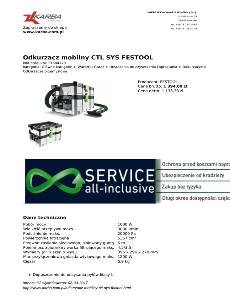 KARBA B.Karczewski i Wspólnicy Sp.J. ul. Fabryczna 14 53-609 Wrocław tel. +48 71 724-24-65 Zapraszamy do sklepu www.karba.com.pl tel. +48 71 718-20-03 Odkurzacz mobilny CTL SYS FESTOOL kod produktu: FT584173 kategoria: Główne kategorie > Warsztat Garaż > Urządzenia do czyszczenia i sprzątania > Odkurzacze > Odkurzacze przemysłowe Producent: FESTOOL Cena brutto: 1 394,00 zł Cena netto: 1 133,33 zł Dane techniczne Pobór mocy Wielkość przepływu maks. Podciśnienie maks. Powierzchnia filtracyjna Przewód zasilania sieciowego, izolowany gumą Pojemność zbiornika / worka filtrującego maks. Wymiary (dł. x szer. x wys.) Moc przyłączeniowa gniazda wtykowego maks. Ciężar 1000 W 3000 l/min 20000 Pa 5357 cm² 5m 4,5/3,5 l 396 x 296 x 270 mm 1200 W 6,9 kg Dopuszczenie do odsysania pyłów klasy L strona: 1/2 wydrukowano: 08-03-2017 http://www.karba.com.pl/odkurzacz-mobilny-ctl-sys-festool.html Niezwykle mały, lekki i poręczny w formacie systenera, zapewnia maks. mobilność Komfortowy transport za pomocą uchwytu lub paska Zintegrowany schowek na wąż, przewody i dysze sprawia, że wszystko jest na miejscu Wszystko zawsze szybko w zasięgu ręki, nie zajmuje wiele miejsca i nie gubi się Łączenie z T-LOC w systemie systenerów w celu optymalnej organizacji miejsca pracy Bardzo ciche dzięki najniższemu poziomowi ciśnienia akustycznego 67 dB Funkcja ssania i dmuchania Najważniejsze zastosowania Do pyłów o najw. dopuszcz. wart. na stanow. pracy (MAK) > 1 mg/m³ Idealne w czasie prac montażowych w różnych miejscach i do prac serwisowych Odsysanie elektronarzędzi dzięki zintegrowanej automatyce włączania/wyłączania Nadaje się doskonale do drobnych prac szlifierskich, do cięcia i wiercenia Idealny do oczyszczania końcowego Zakres dostawy worek filtrujący, zamontowany wąż ssący Ø 27 x 3 m-AS z kątową tuleją obrotową po stronie ssącej schowek na wąż Sys-Dock z funkcją T-LOC ssawka do obić D 36 PD ssawka do szczelin D 36 FD-150 pasek do przenoszenia SYS-CT w kartonie Wymagana rejestracja na stronie producenta strona: 2/2 wydrukowano: 08-03-2017 http://www.karba.com.pl/odkurzacz-mobilny-ctl-sys-festool.html