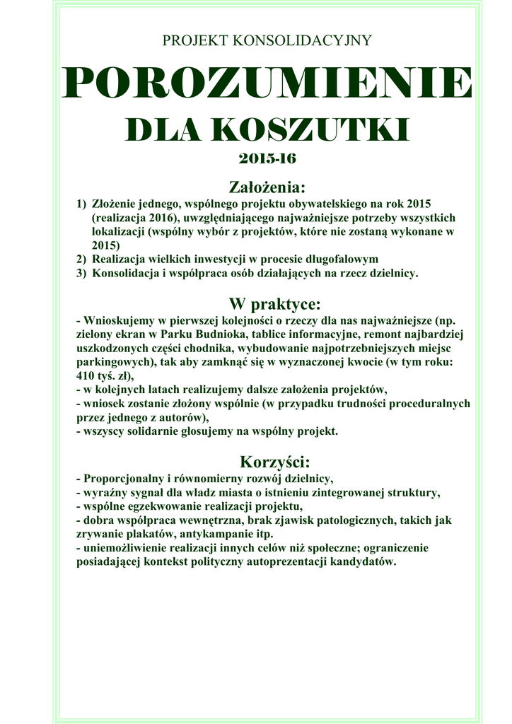 PROJEKT KONSOLIDACYJNY POROZUMIENIE DLA KOSZUTKI 2015-16 ZałoŜenia: 1) ZłoŜenie jednego, wspólnego projektu obywatelskiego na rok 2015 (realizacja 2016), uwzględniającego najwaŜniejsze potrzeby wszystkich lokalizacji (wspólny wybór z projektów, które nie zostaną wykonane w 2015) 2) Realizacja wielkich inwestycji w procesie długofalowym 3) Konsolidacja i współpraca osób działających na rzecz dzielnicy. W praktyce: - Wnioskujemy w pierwszej kolejności o rzeczy dla nas najwaŜniejsze (np. zielony ekran w Parku Budnioka, tablice informacyjne, remont najbardziej uszkodzonych części chodnika, wybudowanie najpotrzebniejszych miejsc parkingowych), tak aby zamknąć się w wyznaczonej kwocie (w tym roku: 410 tyś. zł), - w kolejnych latach realizujemy dalsze załoŜenia projektów, - wniosek zostanie złoŜony wspólnie (w przypadku trudności proceduralnych przez jednego z autorów), - wszyscy solidarnie głosujemy na wspólny projekt. Korzyści: - Proporcjonalny i równomierny rozwój dzielnicy, - wyraźny sygnał dla władz miasta o istnieniu zintegrowanej struktury, - wspólne egzekwowanie realizacji projektu, - dobra współpraca wewnętrzna, brak zjawisk patologicznych, takich jak zrywanie plakatów, antykampanie itp. - uniemoŜliwienie realizacji innych celów niŜ społeczne; ograniczenie posiadającej kontekst polityczny autoprezentacji kandydatów.