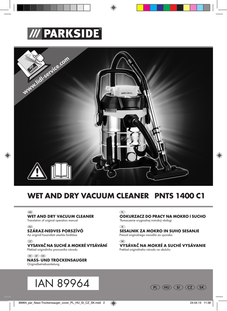 WET AND DRY VACUUM CLEANER PNTS 1400 C1 W ET AND DRY VACUUM CLEANER ODKURZACZ DO PRACY NA MOKRO I SUCHO ZÁRAZ-NEDVES PORSZÍVÓ S Az originál használati utasítás fordítása P revod originalnega navodila za uporabo Translation of original operation manual VYSAVAČ NA SUCHÉ A MOKRÉ VYSÁVÁNÍ P řeklad originálního provozního návodu Tłumaczenie oryginalnej instrukcji obsługi S ESALNIK ZA MOKRO IN SUHO SESANJE V YSÁVAČ NA MOKRÉ A SUCHÉ VYSÁVANIE P reklad originálneho návodu na obsluhu N ASS- UND TROCKENSAUGER Originalbetriebsanleitung IAN 89964 89964_par_Nass-Trockensauger_cover_PL_HU_SI_CZ_SK.indd 2 24.04.13 11:38 B efore reading, unfold the page containing the illustrations and familiarise yourself with all functions of the device. P rzed przeczytaniem proszę rozłożyć stronę z ilustracjami, a następnie proszę zapoznać się z wszystkimi funkcjami urządzenia. O lvasás előtt kattintson az ábrát tartalmazó oldalra és végezetül ismerje meg a készülék mindegyik funkcióját. P red branjem odprite stran s slikami in se nato seznanite z vsemi funkcijami naprave. P řed čtením si otevřete stranu s obrázky a potom se seznamte se všemi funkcemi přístroje. P red čítaním si odklopte stranu s obrázkami a potom sa oboznámte so všetkými funkciami prístroja. K lappen Sie vor dem Lesen die Seite mit den Abbildungen aus und machen Sie sich anschließend mit allen F unktionen des Gerätes vertraut. GB PL HU SI CZ SK DE / AT / CH Translation of original operation manual Tłumaczenie oryginalnej instrukcji obsługi Az originál használati utasítás fordítása Prevod originalnega navodila za uporabo Překlad originálního provozního návodu Preklad originálneho návodu na obsluhu Originalbetriebsanleitung 89964_par_Nass-Trockensauger_cover_PL_HU_SI_CZ_SK.indd 3 Page Strona Oldal Stran Strana Strana Seite 24.04.13 11:38 1 2 3 4 5 6 21 16 15 7 8 22 23 14 9 13 10 24 12 11 17 18 25 19 26 20 GB Contents Introduction Introduction..................................4 Application...................................4 General description.......................5 Delivery Contents..............................5 Overview.........................................5 Description of operation.....................6 Technical data...............................6 Safety information........................6 Symbols used in the instructions..........6 General notes on safety ....................6 Assembly................................... 7 Operation.....................................8 Switching on/off...............................8 Dry vacuuming.................................8 Wet vacuuming................................9 Blow Function...................................9 Cleaning/Maintenance..................9 Trouble shooting.........................10 Storage.......................................10 Disposal/Environmental protection...................................10 Replacement parts/Accessories...11 Guarantee..................................12 Repair Service.............................13 Service-Center.............................13 Service Branch............................13 Translation of the original EC declaration of conformity............80 Exploded Drawing......................83 Congratulations on the purchase of your new device. With it, you have chosen a high quality product. During production, this equipment has been checked for quality and subjected to a final inspection. The functionality of your equipment is therefore guaranteed. It cannot be ruled out that residual quantities of water or lubricants will remain on or in the equipment/hose lines in isolated cases. This is not a fault or defect and it represents no cause for concern. 4 The operating instructions constitute part of this product. They contain important information on safety, use and disposal. Before using the product, familiarise yourself with all of the operating and safety instructions. Use the product only as described and for the applications specified. Keep this manual safely and in the event that the product is passed on, hand over all documents to the third party. Application The appliance is intended for domestic wet and dry vacuuming in, for example, the house, work room, car or garage. This equipment is not suitable for commercial use. Commercial use will invalidate the guarantee. Vacuuming of flammable or explosive materials or those which endanger health is prohibited. The manufacturer will not be held responsible for injuries resulting from use which does not comply with the directions, or from incorrect use. GB General description The illustration of the principal functioning parts can be found on the front and back foldout pages. Delivery Contents Unpack the equipment and check that it is complete. The equipment is supplied with the motor head on (see 3). To take off the motor head and remove the accessories, release the locking lever ( 14) and fold down the bow handle tie bars ( 2) towards the suction nozzle ( 8). - - - - - - - - - - - - - - - Motor housing Stainless steel container Bow handle Cable holder 4 steering castors with attachment ports for accessories Telescopic suction pipe Suction hose Handle with air regulation Foam filter Fluted filter with filter cover (already mounted) Paper filter bag Switchable household nozzle Crevice nozzle 8 cross-head screws Instruction Manual Dispose of the packaging material in a proper manner. Overview Housing 1 Bow handle 2 Bow handle tie bars 3 Motor housing 4 Cable holder 5 Mains power cable 6 On/off switch 7 Vent holes 8 Suction connection 9 Stainless steel container 10 Drainage outlet 11 4 steering castors 12 Anti-static chain (not visible) 13 4 attachment ports for accessories 14 Locking lever 15 Blow connection 16 2 attachment ports 17 Telescopic suction pipe Accessories 18 Vacuum tube holder 19 Suction hose 20 Handle with air regulation Filter 21 Foam filter for wet vacuuming 22Filter cover 23 Fluted filter for dry va