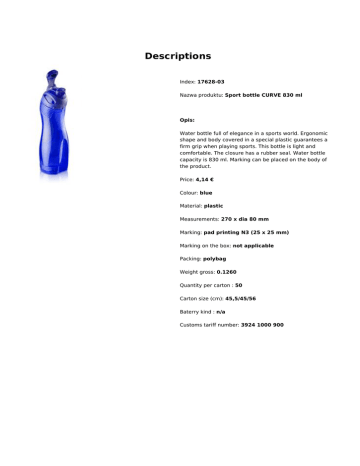 Descriptions Index: 17628-03 Nazwa produktu: Sport bottle CURVE 830 ml Opis: Water bottle full of elegance in a sports world. Ergonomic shape and body covered in a special plastic guarantees a firm grip when playing sports. This bottle is light and comfortable. The closure has a rubber seal. Water bottle capacity is 830 ml. Marking can be placed on the body of the product. Price: 4,14 € Colour: blue Material: plastic Measurements: 270 x dia 80 mm Marking: pad printing N3 (25 x 25 mm) Marking on the box: not applicable Packing: polybag Weight gross: 0.1260 Quantity per carton : 50 Carton size (cm): 45,5/45/56 Baterry kind : n/a Customs tariff number: 3924 1000 900 Powered by TCPDF (www.tcpdf.org)