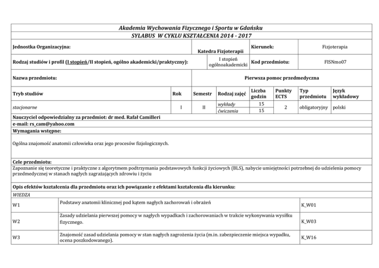 Akademia Wychowania Fizycznego i Sportu w Gdańsku SYLABUS W CYKLU KSZTAŁCENIA 2014 - 2017 Jednostka Organizacyjna: Kierunek: Katedra Fizjoterapii Fizjoterapia I stopień Kod przedmiotu: ogólnoakademicki Rodzaj studiów i profil (I stopień/II stopień, ogólno akademicki/praktyczny): Nazwa przedmiotu: FISNmo07 Pierwsza pomoc przedmedyczna Tryb studiów Rok stacjonarne I Semestr II Rodzaj zajęć wykłady ćwiczenia Liczba godzin 15 15 Punkty ECTS 2 Typ przedmiotu Język wykładowy obligatoryjny polski Nauczyciel odpowiedzialny za przedmiot: dr med. Rafał Camilleri e-mail: [email protected] Wymagania wstępne: Ogólna znajomość anatomii człowieka oraz jego procesów fizjologicznych. Cele przedmiotu: Zapoznanie się teoretyczne i praktyczne z algorytmem podtrzymania podstawowych funkcji życiowych (BLS), nabycie umiejętności potrzebnej do udzielenia pomocy przedmedycznej w stanach nagłych zagrażających zdrowiu i życiu Opis efektów kształcenia dla przedmiotu oraz ich powiązanie z efektami kształcenia dla kierunku: WIEDZA W1 W2 W3 Podstawy anatomii klinicznej pod kątem nagłych zachorowań i obrażeń Zasady udzielania pierwszej pomocy w nagłych wypadkach i zachorowaniach w trakcie wykonywania wysiłku fizycznego. Znajomość zasad udzielania pomocy w stan nagłych zagrożenia życia (m.in. zabezpieczenie miejsca wypadku, ocena poszkodowanego). K_W01 K_W03 K_W16 W4 Znajomość układów organizmu człowieka i wpływu wysiłku fizycznego na ich funkcjonowanie. K_W02 U1 Umiejętność oceny elementów składowych układów istotnych dla podtrzymanaia podstawowych czynności życiowych K_U01 U2 Umiejętność oceny przetrenowania organizmu i możliwości jego zapobiegania. Umiejętność interpretacji zmian w funkcjonowaniu organizmu mogących prowadzić do stanów zagrażającyh jego zdrowiu bądź życiu . K_U03 U3 Umiejętność oceny układu kostno-mięśniowo-stawowego w celu zapobiegania ewentualnych urazom w trakcie wykonywania aktywności fizycznej. K_U07 UMIEJĘTNOŚCI Umiejętność udzielania pomocy medycznej w przypadkach niewymagających pomocy lekarskiej U4 K_U15 KOMPETENCJE K1 Udzielanie pierwszej pomocy przedmedycznej i kierowanie przedmedyczną akcją ratunkową K_K08 K2 Znajomość zasad etyki, uregulowań prawnych co do postępowania w stanach zagrażających zdrowiu i życiu. K_K03 Kryteria i metody oceny osiągniętych efektów kształcenia: W1-W2 W3-W4 kolokwium ze znajomości przedmiotu -5 pytań w formie opisowej na ocenę- 3 odpowiedzi prawidłowe –ocena dost, 4- db, 5-bdb. dyskusja - odpowiedź ustna – ocena eksperta U1 U2-U4 praktyczny sprawdzian umiejętności udzielania pomocy medycznej na fantomie- ocena eksperta przygotowanie autorskich prezentacji przez studentów-wg tematyki ćwiczeń w formie multimedialnej- ocena eksperta K1 sprawdzian umiejętności co do kierowania akcją ratunkową w symulowanej sytuacji zagrożenia życia- ocena eksperta K2 dyskusja-odpowiedź ustna- ocena eksperta Aby uzyskać zaliczenie przedmiotu na ocenę dostateczną student musi osiągnąć wszystkie wymienione w programie efekty kształcenia. Metody i formy realizacji przedmiotu: Ćwiczenia, prezentacje, ćwiczenia na fantomie, wykłady, dyskusje Treści kształcenia: Wykłady: 1. Medycyna jako nauka i działalność praktyczna 2. Epidemiologia urazów sportowych. 3. Urazy z przeciążenia- wielki problem sportowy 4. Przeciążenia układu ruchu w aspekcie sportowej i rekreacyjnej aktywności ruchowej 5. Medycyna wysokościowa. 6. Medycyna nurkowania. 7. Urazy głowy i kręgosłupa 8. Zespół przetrenowania 9. Doping w sporcie 10. Urazy klatki piersiowej. 11. Nagła śmierć sportowca pochodzenia sercowego. 12. Rytmy dobowe, jet lag, zmiany stref czasowych a zdrowie. 13. Wstrząs. 14. Zawał mięśnia sercowego. 15. Astma oskrzelowa i wysiłkowa. Ćwiczenia: Szczegółowe treści ćwiczeń 1. Schemat udzielania pierwszej pomocy medycznej i resuscytacji krążeniowo- oddechowej (algorytm BLS). Rozpoznawanie objawów zatrzymania oddechu, krążenia, postępowanie u chorych nieprzytomnych, podstawy anatomii klinicznej związane z udzielaniem pierwszej pomocy. 2. Ćwiczenia z resuscytacji krążeniowo- oddechowej na fantomie. 3. Odmrożenia, oparzenia termiczne, oparzenia chemiczne, porażenie prądem elektrycznym. Budowa skóry, ocena rozległości oparzeń, skutki oparzeń i odmrożeń, działanie prądu elektrycznego na organizm człowieka, napięcie, natężenie i gęstość prądu, czynniki sprzyjające porażeniu, postępowanie. 4. Rodzaje ran i ich zaopatrzenie, krwotoki, desmurgia. Pierwsza pomoc w ranach i krwotokach, opatrunek uciskowy, rodzaje opatrunków i sposoby zakładania. 5. Urazy narządu ruchu. Urazy odwracalne i nieodwracalne, mikrourazy i ich skutki. Rodzaje stłuczeń, skręceń i zwichnięć stawów, złamań kości. Postępowanie. 6. Urazy głowy. Rodzaje zaburzeń świadomości, wstrząśnienie mózgu, stłuczenie mózgu, 7. Urazy kręgosłupa, stłuczenia, skręcenia i zwichnięcia stawów kręgosłupa, złamanie kręgosłupa, dyskopatie. Objawy i postępowanie. 8. Urazy jamy brzusznej. Rola otrzewnej, skutki urazów, ryzyko wstrząsu, rozpoznanie objawów niepokojących, postępowanie. 9. Choroby układu krążenia. Miażdżyca, choroba niedokrwienna serca, zawał mięśnia serca, udar mózgu. Objawy i postępowanie. Czynniki ryzyka zależne i niezależne od człowieka. 10. Niewydolność krążenia, wstrząs. Przyczyny, objawy, postępowanie we wstrząsie. 11. Choroby układu oddechowego. Choroba przeziębieniowa, astma oskrzelowa alergiczna i wysiłkowa. Odma opłucnowa. Objawy i postępowanie. 12. Choroby układu pokarmowego, ostre stany brzuszne. Rola otrzewnej, częste choroby układu pokarmowego, choroba wrzodowa, zapalenie wyrostka robaczkowego, kolki, wirusowe zapalenie wątroby. Zatrucia pokarmowe, salmonelloza, gronkowiec. Objawy, postępowanie, zapobieganie. 13. Zatrucia. Zatrucie alkoholem etylowym, metylowym, psychotropami,