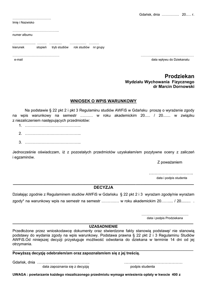 Gdańsk, dnia …………… 20..… r. ………………………………. Imię i Nazwisko ……………………………………... numer albumu …………............ ……… …........... ………….… ………. kierunek stopień tryb studiów rok studiów nr grupy ……………………………………… e-mail …………………………………………… data wpływu do Dziekanatu Prodziekan Wydziału Wychowania Fizycznego dr Marcin Dornowski WNIOSEK O WPIS WARUNKOWY Na podstawie § 22 pkt 2 i pkt 3 Regulaminu studiów AWFiS w Gdańsku proszę o wyrażenie zgody na wpis warunkowy na semestr .……… w roku akademickim 20..... / 20....... w związku z niezaliczeniem następujących przedmiotów: 1. …………………………………….. 2. …………………………………….. 3. …………………………………….. Jednocześnie oświadczam, iż z pozostałych przedmiotów uzyskałam/em pozytywne oceny z zaliczeń i egzaminów. Z poważaniem ………………………….. data i podpis studenta ______________________________________________________________________________ DECYZJA Działając zgodnie z Regulaminem studiów AWFiS w Gdańsku § 22 pkt 2 i 3 wyrażam zgodę/nie wyrażam zgody* na warunkowy wpis na semestr na semestr .……….… w roku akademickim 20…….... / 20......... . ………………………………. data i podpis Prodziekana _____________________________________________________________________________________ UZASADNIENIE Przedłożone przez wnioskodawcę dokumenty oraz stwierdzone fakty stanowią podstawę/ nie stanowią podstawy do wydania zgody na wpis warunkowy. Podstawa prawna § 22 pkt 2 i 3 Regulaminu Studiów AWFiS.Od niniejszej decyzji przysługuje możliwość odwołania do dziekana w terminie 14 dni od jej otrzymania. ______________________________________________________________________________ Powyższą decyzję odebrałem/am oraz zapoznałam/em się z jej treścią. Gdańsk, dnia ……………………………….. data zapoznania się z decyzją …………………………………… podpis studenta UWAGA : powtarzanie każdego niezaliczonego przedmiotu wymaga wniesienia opłaty w kwocie 400 z