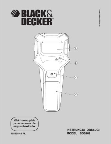 www.blackanddecker.eu Elektronarzędzie przeznaczone dla majsterkowiczów. 555555-49 PL INSTRUKCJA OBSŁUGI MODEL BDS202 2 3 4 POLSKI Dodatkowe wskazówki bezpieczeństwa pracy baterii Uwaga! Baterie mogą eksplodować lub wyciec, co grozi doznaniem urazu ciała lub zaprószeniem ognia. Stosuj się do poniższych wskazówek. Uwaga! Przed włożeniem baterii sprawdź, czy przyrząd jest wyłączony. Wkładanie baterii do załączonego przyrządu grozi wypadkiem. Uwaga! Niewłaściwe użycie może doprowadzić do wycieku elektrolitu z baterii. Unikaj z nim kontaktu, a gdyby to się nie udało, narażone miejsce zmyj wodą. Gdyby elektrolit prysnął w oczy, dodatkowo zwróć się o pomoc do lekarza. Elektrolit może spowodować podrażnienia lub oparzenia skóry. • Przestrzegaj wszystkich wskazówek i ostrzeżeń zamieszczonych na etykiecie baterii i jej opakowaniu. • Zawsze wkładaj baterie zgodnie z polaryzacją („+” i „-”) zaznaczoną na samej baterii i w przyrządzie. • Uważaj, by nie zewrzeć biegunów baterii. • Nigdy nie próbuj ładować baterii. • Nie mieszaj ze sobą starych ani nowych baterii. Wszystkie baterie wymieniaj w tym samym czasie na nowe takiej samej marki i takiego samego typu. • Trzymaj baterie poza zasięgiem dzieci. • Wyjmuj baterie, gdy przyrząd ma nie być używany przez kilka miesięcy. • W żadnym wypadku nie próbuj otwierać baterii. • Nie składuj baterii w miejscu, w którym temperatura może przekroczyć wartość 40 °C. • Przy likwidacji baterii przestrzegaj wskazówek zamieszczonych w punkcie „Ochrona środowiska”. • Nie wrzucaj baterii do ognia! Zastosowanie zgodne z przeznaczeniem Ten przyrząd firmy Black & Decker służy do wykrywania przewodów pod napięciem (prąd przemienny o napięciu 230 V) i rur metalowych zamurowanych w ścianach. Detektor nie nadaje się do zastosowań przemysłowych. Wskazówki dotyczące bezpieczeństwa • • • Uwaga! Przy korzystaniu z przyrządów bateryjnych dokładnie przestrzegaj wskazówek zawartych w tej instrukcji, a także przepisów bhp, by nie narazić się na pożar, wyciek elektrolitu ani też na doznanie urazu ciała i szkód rzeczowych. Przed użyciem przyrządu dokładnie przeczytaj niniejszą instrukcję. Przechowuj instrukcję na wypadek, gdyby znów była kiedyś potrzebna. Utrzymuj porządek w miejscu pracy! Nieporządek w miejscu pracy grozi wypadkiem. Uwzględniaj wpływy otoczenia! Nie wystawiaj przyrządu na deszcz. Nie używaj go też w wilgotnym ani mokrym otoczeniu. Zadbaj o dobre oświetlenie miejsca pracy. Nie włączaj przyrządu w miejscach, gdzie występuje niebezpieczeństwo pożaru bądź wybuchu, na przykład w pobliżu palnych cieczy lub gazów. Nie dopuszczaj dzieci do miejsca pracy! Nie dopuszczaj dzieci, ani zwierząt do miejsca pracy i pilnuj, by nie dotykały przyrządu. Utrzymuj stabilną podstawę! Utrzymuj stabilną postawę, by nie stracić równowagi w jakiejś pozycji roboczej. Zawsze zachowuj uwagę! Koncentruj się na swojej pracy. Postępuj rozsądnie. Nie używaj przyrządu, gdy jesteś zmęczony. Używaj odpowiednich przyrządów! W niniejszej instrukcji opisano zastosowanie przyrządu zgodne z przeznaczeniem. Uwaga! Używanie innych wkładek i wyposażenia dodatkowego, niż zalecane w tej instrukcji, lub wykonywanie prac niezgodnych z przeznaczeniem produktu może doprowadzić do wypadku. Kontroluj przyrząd pod względem uszkodzeń! Przed użyciem sprawdź przyrząd, czy jest całkowicie sprawny. Nie używaj przyrządu, gdy jakaś jego część jest uszkodzona. Bezpiecznie przechowuj swoje przyrządy! Nieużywane przyrządy i baterie powinny być przechowywane w suchym, niedostępnym dla dzieci miejscu. Naprawy: Przyrząd ten jest zgodny z obowiązującymi przepisami bezpieczeństwa i higieny pracy. Naprawy mogą być wykonywane tyko przez uprawnionych specjalistów przy użyciu oryginalnych części zamiennych; lekceważąc to zalecenie, użytkownik bierze na siebie odpowiedzialność za ew. szkody i straty. Dodatkowe wskazówki bezpieczeństwa pracy detektorów rur i przewodów elektrycznych • Nie używaj przyrządu do wykrywania napięcia przemiennego w nieizolowanych bądź odkrytych przewodach. • Nie używaj przyrządu zamiast woltomierza. • Miej świadomość, że przyrząd nie zawsze prawidłowo wykrywa wszystkie rury i przewody. Przyczyny tego mogą być następujące: słaba bateria grube ściany z cienkimi rurami lub przewodami bardzo grube ściany bardzo głęboko przebiegające przewody elektryczne lub rury ściany wyłożone okładziną metalową bardzo duża wilgotność ekranowane kable • Przed użyciem zawsze sprawdzaj przyrząd, próbując wykryć nim znaną sobie rurę bądź znany przewód elektryczny. • W razie wątpliwości zasięgnij porady u wykwalifikowanego dilera. Uwaga! Za pomocą tego przyrządu nie można wykrywać przewodów odłączonych od sieci prądu przemiennego ani takich, przez które przepływa prąd stały, a także kabli telekomunikacyjnych i komputerowych. Ukryte przewody 5 w przeciwnym kierunku aż do uzyskania dokładnego wyniku. Gdy trzy słupki osiągną maksymalną wysokość, to znaczy że przyrząd znajduje się nad metalowym przedmiotem (rys. E). • Po zlokalizowaniu przedmiotu powtórz test, by upewnić się, że przyrząd działa prawidłowo. (na przykład do lamp ściennych) mogą ewentualnie nie być rozpoznane, gdy nie płynie przez nie prąd. Uwaga! Przyrząd ten umożliwia lokalizowanie wyłącznie rur metalowych. Naklejki na przyrządzie Na przyrządzie znajduje się następująca naklejka z symbolem: Wskazówka: • Trzymaj palce z dala od skanowanego obszaru, gdyż może to zafałszować wyniki pomiaru. • Najdokładniejsze wyniki uzyskuje się, gdy ściana jest płaska. Ostrzeżenie! By zminimalizować ryzyko doznania urazu, przeczytaj i stosuj się do instrukcji obsługi. Elementy przyrządu 1. 2. 3. Zastosowanie jako detektora przewodów elektrycznych (rys.