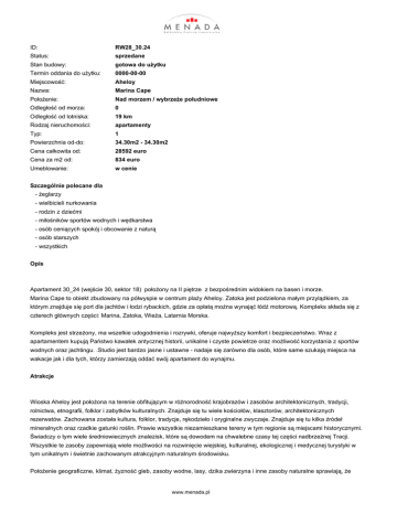 ID: RW28_30.24 Status: sprzedane Stan budowy: gotowa do użytku Termin oddania do użytku: 0000-00-00 Miejscowość: Aheloy Nazwa: Marina Cape Położenie: Nad morzem / wybrzeże południowe Odległość od morza: 0 Odległość od lotniska: 19 km Rodzaj nieruchomości: apartamenty Typ: 1 Powierzchnia od-do: 34.30m2 - 34.30m2 Cena całkowita od: 28592 euro Cena za m2 od: 834 euro Umeblowanie: w cenie Szczególnie polecane dla - żeglarzy - wielbicieli nurkowania - rodzin z dziećmi - miłośników sportów wodnych i wędkarstwa - osób ceniących spokój i obcowanie z naturą - osób starszych - wszystkich Opis Apartament 30_24 (wejście 30, sektor 18) położony na II piętrze z bezpośrednim widokiem na basen i morze. Marina Cape to obiekt zbudowany na półwyspie w centrum plaży Aheloy. Zatoka jest podzielona małym przylądkiem, za którym znajduje się port dla jachtów i łodzi rybackich, gdzie za opłatą można wynająć łódź motorową. Kompleks składa się z czterech głównych części: Marina, Zatoka, Wieża, Latarnia Morska. Kompleks jest strzeżony, ma wszelkie udogodnienia i rozrywki, oferuje najwyższy komfort i bezpieczeństwo. Wraz z apartamentem kupują Państwo kawałek antycznej historii, unikalne i czyste powietrze oraz możliwość korzystania z sportów wodnych oraz jachtingu. .Studio jest bardzo jasne i ustawne - nadaje się zarówno dla osób, które same szukają miejsca na wakacje jak i dla tych, którzy zamierzają oddać swój apartament do wynajmu. Atrakcje Wioska Aheloy jest położona na terenie obfitującym w różnorodność krajobrazów i zasobów architektonicznych, tradycji, rolnictwa, etnografii, folklor i zabytków kulturalnych. Znajduje się tu wiele kościołów, klasztorów, architektonicznych rezerwatów. Zachowana została kultura, folklor, tradycje, rękodzieło i oryginalne zwyczaje. Znajduje się tu kilka źródeł mineralnych oraz rzadkie gatunki roślin. Prawie wszystkie niezamieszkane tereny w tym regionie są miejscami historycznymi. Świadczy o tym wiele średniowiecznych znalezisk, które są dowodem na chwalebne czasy tej części nadbrzeżnej Tracji. Wszystkie te zasoby zapewniają wiele możliwości na rozwinięcie wiejskiej, kulturalnej, ekologicznej i medycznej turystyki w tym unikalnym i świetnie zachowanym atrakcyjnym naturalnym środowisku. Położenie geograficzne, klimat, żyzność gleb, zasoby wodne, lasy, dzika zwierzyna i inne zasoby naturalne sprawiają, że www.menada.pl region gminy Pomorie jest doskonałym połączeniem wschodniobałkańskich podnóży gór, ciepłoty południowego wybrzeża Morza Czarnego i przestronnej górzystej doliny Tundja. Na terytorium gminy znajdują się sztuczne jeziora Achelopi i Pomorie, jak i zarówno wiele innych małych zbiorników wodnych. Rzeka Hadijska i rzeka Aheloy oraz wiele innych małych rzek przepływa przez ten region. Dzięki wspomnianym terenom, region obfituje w różnorodność zwierząt i roślin, dobrze zachowane habitaty oraz populacje dzikiej zwierzyny. Różnorodność gatunkowa ryb i dziczyzny zapewnia wspaniałą podstawę dla rozwoju turystyki łowieckiej połączonej z unikalnym doświadczeniem i zachowaną naturą tego obszaru. Pobliskie jezioro Pomorie jest unikatowym środowiskiem życia różnych gatunków ptaków. Atrakcje turystyczne Cechy Dlaczego Warto ? Unikalna lokalizacja z ciszą i zdrowym powietrzem Prywatna marina Atrakcyjna cena Dobra lokalizacja Studio z widokiem na basen i na morze Cechy: 4 restauracje, kilka barów i kawiarni; 2 baseny z barem; Centrum odnowy biologicznej, Spa 2 korty do squasha; kilka małych sklepów TV kablowa w każdym apartamencie; Alejki z bowlingiem; Centrum fitness; Place zabaw dla dzieci; Centrum z Wieżą jest na północno-wschodnim rogu kompleksu i zawiera właśnie w soim obszarze drogę dla pieszych, Spa, fitness. Lokalizacja: w pobliżu wioska Aheloy, Region Bourgas; na małym przylądku, nad brzegiem morza, mała przystań już istnieje na końcu przylądka Usługi Opłata za zarządzanie: 12 E/m2 pow. całkowitej rocznie Z nami nie musisz się martwić o utrzymanie apartamentu w ciągu roku. Dla naszych Klientów zapewniamy utrzymanie nieruchomości, ochronę 24 h przez cały rok, oświetlenie, bezpieczeństwo elektryczne i wodne, naprawy, sprzątanie i czyszczenie części wspólnych, zieleni, czyszczenie apartamentu czy też płatności rachunków. Dodatkowo istnieje możliwość osiągania dochodów z wynajmu zakupionego apartamentu - ponieważ oferujemy pomoc przy wynajmie. www.menada.pl Obsługa posprzedażowa Zasady płatności Plan płatności: do uzgodnienia ze sprzedającym. Kurs stały przyjęty do rozliczeń przez sprzedającego to 1 EUR = 4 PLN Koszty: Należy pamiętać, iż oprócz ceny za nieruchomość dochodzi koszt związany z opłatą notarialną u Notariusza (jest to maksymalnie 3,5 - 4,5 % wartości zakupu). www.menada.pl