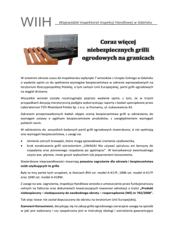 WIIH Wojewódzki Inspektorat Inspekcji Handlowej w Gdańsku Coraz więcej niebezpiecznych grilli ogrodowych na granicach W ostatnim okresie czasu do Inspektoratu wpłynęło 7 wniosków z Urzędu Celnego w Gdańsku o wydanie opinii co do spełnienia wymogów bezpieczeństwa w zakresie wprowadzanych na terytorium Rzeczypospolitej Polskiej, a tym samym Unii Europejskiej, partii grilli ogrodowych na węgiel drzewny. Wszystkie wnioski zostały rozstrzygnięte poprzez wydanie opinii, z tym, że w trzech przypadkach decyzją merytoryczną podjęto wykorzystując raporty z badań sporządzone przez Laboratorium TÜV Rheinland Polska Sp. z o.o. w Poznaniu, ul. Łukaszewicza 43. Zakresem przeprowadzonych badań objęto ocenę bezpieczeństwa grilli w odniesieniu do wymagań ustawy o ogólnym bezpieczeństwie produktów, z uwzględnieniem wymagań polskich norm. W odniesieniu do wszystkich badanych partii grilli ogrodowych stwierdzono, iż nie spełniają one wymagań bezpieczeństwa, z uwagi na: istnienie ostrych krawędzi, które mogą spowodować zranienie użytkownika, brak oznakowania grilli ostrzeżeniem „UWAGA! Nie używać spirytusu ani benzyny do rozpalania oraz ponownego rozpalania po zgaśnięciu”. W konsekwencji ewentualnego użycia ww. płynów, może grozić wybuchem lub poparzeniem konsumenta. Stwierdzone nieprawidłowości stwarzają poważne zagrożenie dla zdrowia i bezpieczeństwa osób użytkujących te grille. Były to trzy partie tych urządzeń, w ilościach 854 szt. model A-K17F, 1896 szt. model A-K17F oraz 1040 szt. model A-K18W. Z uwagi na ww. zagrożenia, Inspekcja Handlowa wniosła o umieszczenie przez funkcjonariuszy celnych na fakturze oraz dokumetach towarzyszących towarowi adnotacji o treści „Produkt niebezpieczny – niedopuszony do swobodnego obrotu – rozporządzenie (WE) nr 765/2008”. Tak więc towar nie został dopuszczony do obrotu na terytorium Unii Europejskiej. Szanowni Konsumenci, decydując się na zakup grilla ogrodowego zwracajcie uwagę na sposób w jaki jest wykonany i czy zaopatrzony jest w instrukcję obsługi i ostrzeżenia gwarantujące bezpieczne użytkowanie, a także, czy są one dobrze widoczne. W przypadku ujawnienia tego rodzaju nieprawidłowości prosimy o niezwłoczne poinformowanie o tym fakcie Inspekcji Handlowej w Gdańsku, z podaniem danych identyfikujących sprzedawcę. Nasz organ niezwłocznie podejmie działania kontrolne. Prosimy o kontakt pod nr telefonu (58) 3415370 lub za pośrednictwem poczty elektronicznej: [email protected]. Dodatkowe informacje dla mediów: Waldemar Kołodziejczyk, p.o. Rzecznika Prasowego Wojewódzkiego Inspektoratu Inspekcji Handlowej w Gdańsku ul. Marii Konopnickiej 4 80 – 240 Gdańsk tel. (58) 3410924 wew. 33 tel. kom. 502255765 email: [email protected]