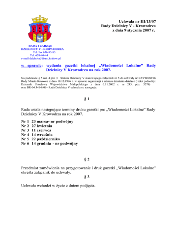 Uchwała nr III/13/07 Rady Dzielnicy V - Krowodrza z dnia 9 stycznia 2007 r. RADA I ZARZĄD DZIELNICY V - KROWODRZA Tel./fax 636-95-95 Tel. 638-40-44 e-mail [email protected] w sprawie: wydania gazetki lokalnej „Wiadomości Lokalne” Rady Dzielnicy V Krowodrza na rok 2007. Na podstawie § 5 ust. 4 pkt. 3 Statutu Dzielnicy V stanowiącego załącznik nr 5 do uchwały nr LXVII/660/96 Rady Miasta Krakowa z dnia 18.12.1996 r. w sprawie organizacji i zakresu działania dzielnic ( tekst jednolity: Dziennik Urzędowy Województwa Małopolskiego z dnia 6.11.2002 r. nr 243, poz. 3278) oraz BR-04.341-9/06– Rada Dzielnicy V uchwala co następuje: §1 Rada ustala następujące terminy druku gazetki pn: „Wiadomości Lokalne” Rady Dzielnicy V Krowodrza na rok 2007. Nr 1 Nr 2 Nr 3 Nr 4 Nr 5 Nr 6 23 marca- nr podwójny 27 kwietnia 11 czerwca 14 września 22 października 14 grudnia - nr podwójny §2 Przedmiot zamówienia na przygotowanie i druk gazetki „Wiadomości Lokalne” określa załącznik do uchwały. §3 Uchwała wchodzi w życie z dniem podjęcia. Uchwała nr III/13/07 Rady Dzielnicy V - Krowodrza z dnia 9 stycznia 2007 r. RADA I ZARZĄD DZIELNICY V - KROWODRZA Tel./fax 636-95-95 Tel. 638-40-44 e-mail [email protected] w sprawie: wydania gazetki lokalnej „Wiadomości Lokalne” Rady Dzielnicy V Krowodrza na rok 2007.