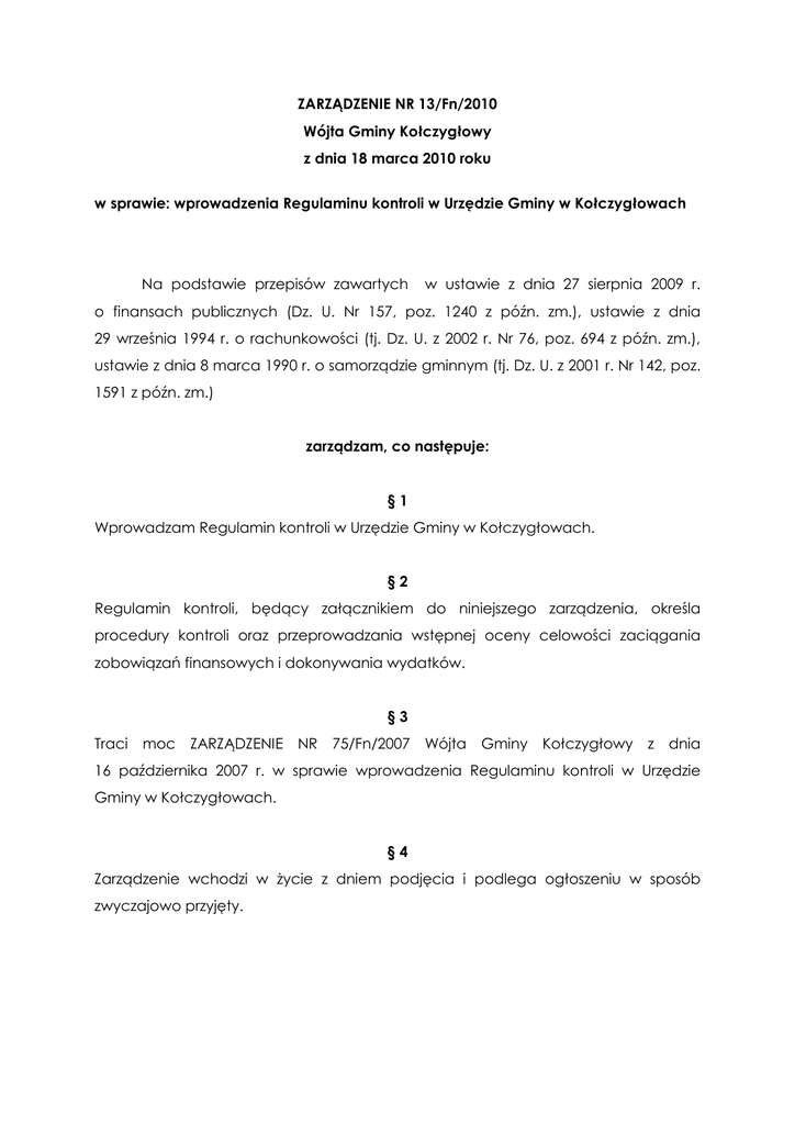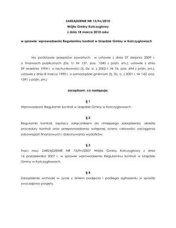 ZARZĄDZENIE NR 13/Fn/2010 Wójta Gminy Kołczygłowy z dnia 18 marca 2010 roku w sprawie: wprowadzenia Regulaminu kontroli w Urzędzie Gminy w Kołczygłowach Na podstawie przepisów zawartych w ustawie z dnia 27 sierpnia 2009 r. o finansach publicznych (Dz. U. Nr 157, poz. 1240 z późn. zm.), ustawie z dnia 29 września 1994 r. o rachunkowości (tj. Dz. U. z 2002 r. Nr 76, poz. 694 z późn. zm.), ustawie z dnia 8 marca 1990 r. o samorządzie gminnym (tj. Dz. U. z 2001 r. Nr 142, poz. 1591 z późn. zm.) zarządzam, co następuje: §1 Wprowadzam Regulamin kontroli w Urzędzie Gminy w Kołczygłowach. §2 Regulamin kontroli, będący załącznikiem do niniejszego zarządzenia, określa procedury kontroli oraz przeprowadzania wstępnej oceny celowości zaciągania zobowiązań finansowych i dokonywania wydatków. §3 Traci moc ZARZĄDZENIE NR 75/Fn/2007 Wójta Gminy Kołczygłowy z dnia 16 października 2007 r. w sprawie wprowadzenia Regulaminu kontroli w Urzędzie Gminy w Kołczygłowach. §4 Zarządzenie wchodzi w życie z dniem podjęcia i podlega ogłoszeniu w sposób zwyczajowo przyjęty. Załącznik do Zarządzenia Nr 13/Fn/2010 Wójta Gminy Kołczygłowy z dnia 18 marca 2010r. REGULAMIN w sprawie ustalenia procedur kontroli oraz przeprowadzania wstępnej oceny celowości zaciągania zobowiązań finansowych i dokonywania wydatków §1. Przedmiot kontroli finansowej 1. Kontrola finansowa w jednostce, obejmuje: 1) przeprowadzanie wstępnej oceny celowości zaciągania zobowiązań finansowych i dokonywania wydatków; 2) badanie i porównanie stanu faktycznego ze stanem wymaganym w zakresie dotyczącym procesów pobierania i gromadzenia środków publicznych, zaciągania zobowiązań finansowych i dokonywania wydatków ze środków publicznych, udzielania zamówień publicznych oraz zwrotu środków publicznych; 3) prowadzenie gospodarki finansowej oraz stosowanie procedur dotyczących procesów, o których mowa wyżej. 2. Do zadań kontroli finansowej należy także kontrola gospodarowania majątkiem gminy. 3. Kontrola finansowa prowadzona jest na bieżąco w formie kontroli wstępnej lub powykonawczej, w związku z wykonywaniem zadań gospodarki finansowej. Ponadto prowadzone są okresowe czynności sprawdzające i analizy realizacji wybranych zadań z zakresu gospodarki finansowej i gospodarowania mieniem. 4. Ilekroć w dalszej części instrukcji jest mowa bez bliższego określenia o: 1) wójcie – należy przez to rozumieć Wójta Gminy Kołczygłowy, 2) skarbniku – należy przez to rozumieć skarbnika Gminy Kołczygłowy, 3) informatyku – należy przez to rozumieć osobę zobowiązaną do sprawnego funkcjonowania systemu informatycznego w urzędzie, 4) urzędzie – należy przez to rozumieć Urząd Gminy w Kołczygłowach, 5) pracowniku merytorycznym – należy przez to rozumieć pracownika zatrudnionego w Urzędzie Gminy w Kołczygłowach. §2. Uprawnienia i obowiązki do prowadzenia kontroli finansowej 1. Wójt jest odpowiedzialny za całość gospodarki finansowej, w tym za wykonywanie obowiązków w zakresie kontroli finansowej. 2. Wójt może powierzyć określone obowiązki w zakresie gospodarki finansowej pracownikom urzędu. Przyjęcie obowiązków przez te osoby powinno być potwierdzone dokumentem w formie odrębnego imiennego upoważnienia albo wskazania w regulaminie organizacyjnym urzędu. 3. Skarbnikowi, wójt powierza obowiązki i odpowiedzialność w zakresie: a) dokonywania wstępnej kontroli zgodności operacji gospodarczych i finansowych z planem finansowym; b) dokonywania wstępnej kontroli kompletności i rzetelności dokumentów dotyczących operacji gospodarczych i finansowych. 4. Obowiązki i uprawnienia do prowadzenia kontroli finansowej komórek organizacyjnych jednostki określa niniejszy regulamin oraz inne unormowania. §3. Wymagania zawodowe i obowiązki pracowników 1. Przy wykonywaniu zadań i czynności składających się na gospodarkę finansową oraz kontrolę finansową pracownicy zobowiązani są przestrzegać przepisów prawa, unormowań niniejszej instrukcji, kierując się zasadami uczciwości i zaangażowania w wykonywanie obowiązków. 2. Obowiązkiem każdego pracownika wykonującego czynności w ramach gospodarki finansowej jest informowanie przełożonych o stwierdzonych nieprawidłowościach i zagrożeniach wystąpienia nieprawidłowości. 3. Pracownicy zobowiązani są do podnoszenia swoich kwalifikacji zawodowych celem zapewnienia pełnej realizacji powierzonych im zadań z zakresu gospodarki finansowej i kontroli finansowej. W miarę posiadanych możliwości finansowych i wykorzystania czasu pracy wójt i bezpośredni przełożeni pracowników zapewniają warunki podnoszenia kwalifikacji zawodowych m.in. poprzez dostarczanie aktualnych przepisów prawa, opracowań, literatury i umożliwianie uczestnictwa w kursach specjalistycznych oraz przez szkolenia na stanowisku pracy. 4. Bezpośredni przełożeni pracowników wykonujących czynności z zakresu gospodarki finansowej, zlecając wykonywanie nowych. zadań pracownikowi, przeprowadzają instruktaż w zakresie sposobu wykonania zleconych czynności. §4. System informacji finansowej 1. Realizacja zadań gospodarki finansowej, zamówień publicznych i gospodarowania mieniem odbywa się przy bieżącym przekazywaniu informacji i danych, pomiędzy stanowiskami pracy, niezbędnych do wykonania poszczególnych czynności objętych wymienionymi zadaniami. 2. Obieg informacji finansowej i dotyczącej gospodarowania mieniem regulują "Instrukcja obiegu informacji i dokumentów" iinnewewnę1rznezarządzenia. 3. Weryfikacja sprawności funkcjonowania systemu informacji finansowej prowadzona jest okresowo w miarę potrzeb wynikających ze zmian organizacyjnych, zmian związanych z realizacją zadań oraz zmian przepisów prawa. §5. Funkcjonowanie i kontrola systemu informatycznego 1. Informatyk prowadzący obsługę systemu informatycznego jest zobowiązany do zapewnienia sprawneg