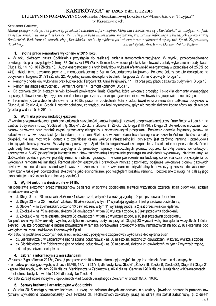 „KARTKÓWKA” nr 1/2015 z dn. 17.12.2015 BIULETYN INFORMACYJNY Spółdzielni Mieszkaniowej Lokatorsko-Własnościowej "Przyjaźń" w Krzeszowicach Szanowni Państwo, Mamy przyjemność po raz pierwszy przekazać biuletyn informacyjny, który ma roboczą nazwę „Kartkówka” ze względu na fakt, że będzie mieścił się na jednej kartce. W biuletynie będą umieszczane najważniejsze, krótkie informacje z bieżących spraw naszej Spółdzielni. Będziemy się starali, aby „Kartkówka” stała się cyklicznym informatorem wydarzeń dotyczących Sp-ni. Zapraszamy do lektury. Zarząd Spółdzielni: Janina Dębska, Wiktor Sajdera. 1. Istotne prace remontowe wykonane w 2015 roku. W roku bieżącym nasza Spółdzielnia przystąpiła do realizacji zadania termomodernizacyjnego. W wyniku przeprowadzonego przetargu, do prac przystąpiły 2 firmy: FB Gołuszka i FB Warik. Kompleksowe docieplenia ścian elewacji zostały wykonane na budynkach: Długa 12, 14, 16, 18 i Żbicka 18. Audyt energetyczny dla tych budynków wykazał efektywność energetyczną w przedziale od 25,5% do 44% i dzięki temu uzyskano premię termomodernizacyjną z Banku Gospodarstwa Krajowego. Po dwie ściany zostały docieplone na budynkach: Targowa 31, 33 i Żbicka 22. Po jednej ścianie docieplono budynki: Targowa 29, Armii Krajowej 5 i Długa 10. Remonty chodników wykonano przy budynkach: Targowa 33, Armii Krajowej 9, 11 i 13 oraz przy placu zabaw za budynkiem Długa 10. Remont instalacji elektrycznej: ul. Armii Krajowej 14. Remont kominów: Długa 10. Od czerwca 2015r. bieżący serwis kotłowni powierzono firmie GigaWat, która wykonała przegląd i określiła elementy wymagające naprawy; kotłownie zostały przygotowane do obecnego sezonu zimowego; ujawniane nieprawidłowości są naprawiane na bieżąco. Informujemy, że wstępnie planowane na 2015r. prace na docieplenie ściany południowej wraz z remontem balkonów budynków w Długa 8, ul. Żbicka 4, ul. Stopki 1 zostały odłożone, ze względu na brak wykonawcy, gdyż nie zostały złożone żadne oferty na ich remont (przetarg w dniu 15.06.2015r). 2. Wymiana pionów instalacji gazowej W wyniku przeprowadzonych prób ciśnieniowych szczelności pionów instalacji gazowej przeprowadzonej przez firmę Rotor w lipcu b.r. na sześciu budynkach naszej Spółdzielni, tj. Stopki1, Żbicka 8, Żbicka18, Żbicka 22, Długa 8 III-VIkl. i Długa 21 stwierdzono nieszczelności pionów gazowych oraz montaż części gazomierzy niezgodny z obowiązującymi przepisami. Ponieważ obecnie fragmenty pionów są zabudowane w tzw. szachtach (za toaletami), co uniemożliwia sprawdzenie stanu technicznego oraz szczelności rur pionów na całej długości, nie ma możliwości dotarcia z czujnikiem celem wykrycia nieszczelności, konieczny jest zarówno remont i przebudowa istniejących pionów gazowych. W związku z powyższym, Spółdzielnia zorganizowała w sierpniu br. zebrania informacyjne z mieszkańcami tych budynków oraz niezwłocznie przystąpiła do procedury naprawy nieszczelnych pionów, poprzez: korektę planów remontowych, sporządzenie SIWZ (specyfikacja istotnych warunków zamówienia) i ogłoszenie przetargu na wyłonienie wykonawcy. Nadmieniamy, że Spółdzielnia posiada gotowe projekty remontu instalacji gazowych i ważne pozwolenie na budowę, co skraca czas przystąpienia do wykonania remontu tej instalacji. Remont pionów gazowych i prawidłowy montaż gazomierzy obejmuje wykonanie pionów gazowych usytuowanych na klatkach schodowych wraz z gazomierzami oraz wykonaniem indywidualnych przyłączy gazowych do kuchenek rozwiązanie takie jest powszechnie stosowane jako ekonomiczne, pod względem kosztów remontu i bezpieczne z uwagi na dalszą jego eksploatację i możliwości kontrolne w przyszłości. 3. Wyniki ankiet na docieplenie w 2016r. Na podstawie złożonych przez mieszkańców deklaracji w sprawie docieplenia elewacji wszystkich czterech ścian budynków, zostają przedstawione wyniki: ul. Długa 8 – na 70 mieszkań, złożono 31 oświadczeń, w tym 29 wyrażają zgodę, a 2 jest przeciwna dociepleniu ul. Długa 23 – na 25 mieszkań, złożono 18 oświadczeń, w tym 17 wyrażają zgodę, a 1 jest przeciwna dociepleniu, ul. Stopki 1 – na 25 mieszkań, złożono 13 oświadczeń, w tym 11 wyrażają zgodę, a 2 jest przeciwna dociepleniu, ul. Żbicka 4 – na 75 mieszkań, złożono 31 oświadczeń, w tym 26 wyrażają zgodę, a 5 jest przeciwna dociepleniu, ul. Żbicka 8 – na 75 mieszkań, złożono 35 oświadczeń, w tym 25 wyrażają zgodę, a 10 jest przeciwna dociepleniu. Na podstawie wyników ankiety, wynika, że tylko mieszkańcy budynku przy ul. Długiej 23 wyrazili wolę docieplenia wszystkich 4 ścian elewacji. Dalsze procedowanie będzie prowadzone w ramach opracowania projektów planów remontowych na rok 2016 i oceniane pod względem zakresu i możliwości finansowych Sp-ni. Ponadto, na podstawie złożonych deklaracji, mieszkańcy pozytywnie zaopiniowali wykonanie docieplenia ścian os. Sienkiewicza 6 w Zabierzowie (jedna ściana południowa) - na 30 mieszkań, złożono 24 oświadczeń i wszyscy wyrażają zgodę os. Sienkiewicza 7 w Zabierzowie (jedna ściana południowa) - na 30 mieszkań, złożono 21 oświadczeń, w tym 17 wyrażają zgodę, a 4 jest przeciwna dociepleniu. 4. Zebrania informacyjne z mieszkańcami W okresie 2-go półrocza 2015r., Zarząd przeprowadził 10 zebrań informacyjno-wyjaśniających z mieszkańcami, a dotyczących: - remontów pionów gazowych, w dniach 18.VIII, 19.VIII i 24.VIII, dla budynków: Stopki1, Żbicka18, Żbicka 8, Żbicka 22, Długa 8 i Długa 21 - spraw bieżących, w dniach 29.IX dla os. Sienkiewicza w Zabierzowie, 06.X dla os. Centrum i 20.X dla os. Jurajskiego w Krzeszowicach - docieplenia budynku, w dniu 01.XII dla budynku Żbicka 4 Ponadto Zarząd uczestniczył w 2 spotkaniach Rad Osiedli Jurajskiego i Centrum w dniach 08.IX i 10.IX. 5. Sprawy kadrowe i organizacyjne w Spó