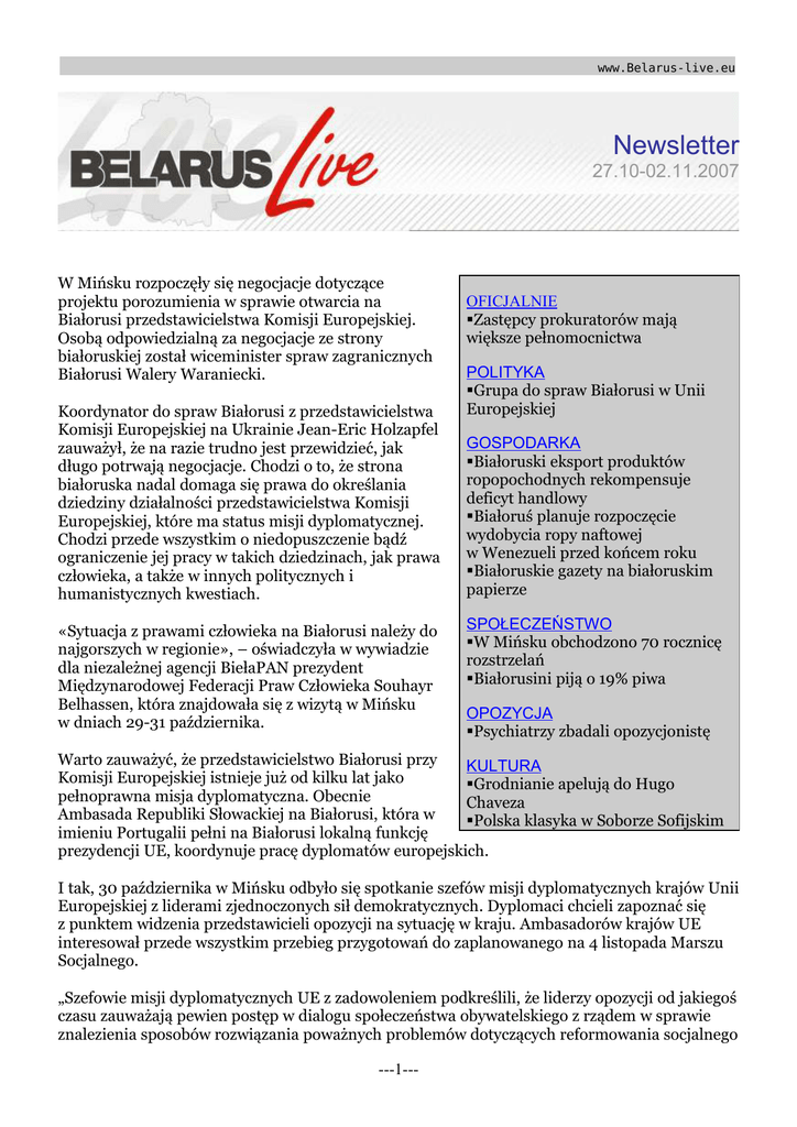 www.Belarus-live.eu Newsletter 27.10-02.11.2007 W Mińsku rozpoczęły się negocjacje dotyczące projektu porozumienia w sprawie otwarcia na Białorusi przedstawicielstwa Komisji Europejskiej. Osobą odpowiedzialną za negocjacje ze strony białoruskiej został wiceminister spraw zagranicznych Białorusi Walery Waraniecki. Koordynator do spraw Białorusi z przedstawicielstwa Komisji Europejskiej na Ukrainie Jean-Eric Holzapfel zauważył, że na razie trudno jest przewidzieć, jak długo potrwają negocjacje. Chodzi o to, że strona białoruska nadal domaga się prawa do określania dziedziny działalności przedstawicielstwa Komisji Europejskiej, które ma status misji dyplomatycznej. Chodzi przede wszystkim o niedopuszczenie bądź ograniczenie jej pracy w takich dziedzinach, jak prawa człowieka, a także w innych politycznych i humanistycznych kwestiach. «Sytuacja z prawami człowieka na Białorusi należy do najgorszych w regionie», – oświadczyła w wywiadzie dla niezależnej agencji BiełaPAN prezydent Międzynarodowej Federacji Praw Człowieka Souhayr Belhassen, która znajdowała się z wizytą w Mińsku w dniach 29-31 października. OFICJALNIE Zastępcy prokuratorów mają większe pełnomocnictwa POLITYKA Grupa do spraw Białorusi w Unii Europejskiej GOSPODARKA Białoruski eksport produktów ropopochodnych rekompensuje deficyt handlowy Białoruś planuje rozpoczęcie wydobycia ropy naftowej w Wenezueli przed końcem roku Białoruskie gazety na białoruskim papierze SPOŁECZEŃSTWO W Mińsku obchodzono 70 rocznicę rozstrzelań Białorusini piją o 19% piwa OPOZYCJA Psychiatrzy zbadali opozycjonistę Warto zauważyć, że przedstawicielstwo Białorusi przy KULTURA Komisji Europejskiej istnieje już od kilku lat jako Grodnianie apelują do Hugo pełnoprawna misja dyplomatyczna. Obecnie Chaveza Ambasada Republiki Słowackiej na Białorusi, która w Polska klasyka w Soborze Sofijskim imieniu Portugalii pełni na Białorusi lokalną funkcję prezydencji UE, koordynuje pracę dyplomatów europejskich. I tak, 30 października w Mińsku odbyło się spotkanie szefów misji dyplomatycznych krajów Unii Europejskiej z liderami zjednoczonych sił demokratycznych. Dyplomaci chcieli zapoznać się z punktem widzenia przedstawicieli opozycji na sytuację w kraju. Ambasadorów krajów UE interesował przede wszystkim przebieg przygotowań do zaplanowanego na 4 listopada Marszu Socjalnego. „Szefowie misji dyplomatycznych UE z zadowoleniem podkreślili, że liderzy opozycji od jakiegoś czasu zauważają pewien postęp w dialogu społeczeństwa obywatelskiego z rządem w sprawie znalezienia sposobów rozwiązania poważnych problemów dotyczących reformowania socjalnego ---1--- www.Belarus-live.eu systemu Białorusi”, – czytamy w oświadczeniu Ambasady Słowacji. Sformułowanie „pewien postęp w dialogu z rządem” dotyczy prawdopodobnie tego, że władza zaczęła udzielać opozycji specjalnych zezwoleń na przeprowadzenie mitingów i zebrań, do czego prawo zapewnia obywatelom obecna Konstytucja Białorusi. Indykatorem ważności akcji „Marsz Socjalny” może być stopień udziału w nim drobnych przedsiębiorców. Uważa się, że właśnie ta kategoria obywateli była motorem rewolucji pomarańczowej na Ukrainie. Związki Przedsiębiorców Białorusi przeprowadziły w ciągu roku kilka dosyć dużych akcji protestacyjnych i stale organizują – jeśli tylko zezwalają na to władze lokalne – pikiety w sprawie zmiany zasad rozporządzenia Nr 760. Warto zauważyć, że Sąd Najwyższy odmówił sprawdzenia zgodności tego rozporządzenia prezydenta z Konstytucją. Nie można jednak powiedzieć, że przedsiębiorcy białoruscy prezentują zgodność i aktywność w określeniu swego losu. Widocznie wielu z nich uważa, że bardziej efektywnymi są inne sposoby rozwiązania problemu. Jeden z nich – to rejestracja pracowników najemnych w charakterze indywidualnych przedsiębiorców (IP). Kolejny – to przeniesienie biznesu do krajów sąsiedzkich, praca według szarych schematów, nieoficjalne zatrudnianie pracowników („na czarno”). Według wielu ekspertów, wszystkie te działania – zamiast sprzyjania powstaniu bardziej cywilizowanych zasad pracy przedsiębiorców – przywrócą komercjalne zasady z początku lat 1990-tych, które cechował brak socjalnej i prawnej ochrony osób zajmujących się drobnym biznesem, wzrost zapotrzebowania na usługi grup przestępczych oraz wzrost obrotów gotówkowych. Oprócz tego likwidacja działalności wielu przedsiębiorców indywidualnych doprowadzi do wzrostu liczby osób oficjalnie niezatrudnionych w gospodarce kraju, których ilość i tak sięga już 1 mln. na 4,5 mln. osób w wieku produkcyjnym. Istotnym wydarzeniem na Białorusi, jak sądzono, powinno stać się forum 3 listopada „W przyszłość – bez komunizmu” z udziałem naukowców, ofiar represji komunistycznych i działaczy kultury, przedstawicieli duchowieństwa oraz gości zagranicznych. Po tym, jak dyrekcja Domu Kultury „MAZ” (Mińskiej Fabryki Samochodów) nie udzieliła zgody na przeprowadzenie forum w sali DK organizatorzy zmuszeni zostali do poszukania innych możliwości. Jak oświadczył przewodniczący komitetu organizacyjnego do spraw forum Aleś Michalewicz, powód odmowy został zmyślony i forum tak czy inaczej odbędzie się, chociaż pewnie w mniejszej skali. Powyższe forum – to reakcja na przeprowadzenie 4 listopada w Mińsku – przy osobistym wsparciu A. Łukaszenki – międzynarodowego spotkania przedstawicieli partii komunistycznych. Właśnie w Mińsku komuniści z całego świata rozpoczynają uroczystości z okazji 90-lecia rewolucji październikowej. Uroczystości mają zakończyć się 7 listopada w Moskwie. Pewien rezonans w wewnątrzpolitycznym życiu Białorusi powinno wywołać także inne przedstawienie. 1 listopada w Mińsku został otwarty I Zjazd Naukowców Białorusi, w którym bierze udział 2,5 tys. delegatów