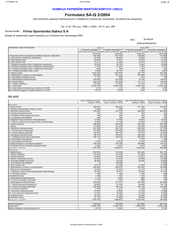 TC DĘBICA SA w tys. zł SA-Q 2/2004 KOMISJA PAPIERÓW WARTOŚCIOWYCH I GIEŁD Formularz SA-Q 2/2004 (dla emitentów papierów wartościowych o działalności wytwórczej, budowlanej, handlowej lub usługowej) - Dz. U. Nr 139, poz. 1569 i z 2002 r. Nr 31, poz. 280 Zarząd Spółki Firma Oponiarska Dębica S.A podaje do wiadomości raport kwartalny za 2 kwartał roku obrotowego 2004 dnia 04-08-04 (data przekazania) WYBRANE DANE FINANSOWE I. Przychody netto ze sprzedaży produktów, towarów i materiałów II. Zysk (strata) z działalności operacyjnej III. Zysk (strata) brutto IV. Zysk (strata) netto V. Przepływy pieniężne netto z działalności operacyjnej VI. Przepływy pieniężne netto z działalności inwestycyjnej VII. Przepływy pieniężne netto z działalności finansowej VIII. Przepływy pieniężne netto, razem IX. Aktywa razem X. Zobowiązania i rezerwy na zobowiązania XI. Zobowiązania długoterminowe XII. Zobowiązania krótkoterminowe XIII. Kapitał własny XIV. Kapitał zakładowy XV. Liczba akcji XVI. Zysk (strata) na jedną akcję zwykłą (w zł / EUR) XVIII. Wartość księgowa na jedną akcję (w zł / EUR) w tys. zł w tys. EUR 2 kwartały narastająco / 2 kwartały narastająco / 2 kwartały narastająco / 2 kwartały narastająco / 2004 okres od 04-01-01 do 2003 okres od 03-01-01 do 2004 okres od 04-01-01 do 2003 okres od 03-01-01 do 04-06-30 03-06-30 04-06-30 03-06-30 762 236 647 745 160 652 151 500 92 938 65 862 19 550 15 336 87 840 71 047 18 475 16 705 70 911 51 390 14 914 12 021 20 532 48 734 4 520 10 934 -9 779 -21 247 -2 153 -4 767 -823 -760 -181 -170 9 930 26 727 2 186 5 997 1 079 755 1 023 878 237 716 229 724 456 880 422 222 100 586 94 732 2 110 686 464 154 354 963 307 268 78 148 68 941 622 875 601 656 137 131 134 991 110 422 110 422 24 310 24 775 13 802 750 13 802 750 13 802 750 13 802 750 5,14 3,72 1,08 0,87 45,13 43,59 9,94 9,78 BILANS Aktywa I. Aktywa trwałe 1. Wartości niematerialne i prawne, w tym: 2. Rzeczowe aktywa trwałe 4. Inwestycje długoterminowe 4.3. Długoterminowe aktywa finansowe b) w pozostałych jednostkach 5. Długoterminowe rozliczenia międzyokresowe 5.1. Aktywa z tytułu odroczonego podatku dochodowego II. Aktywa obrotowe 1. Zapasy 2. Należności krótkoterminowe 2.1. Od jednostek powiązanych 2.2. Od pozostałych jednostek 3. Inwestycje krótkoterminowe 3.1. Krótkoterminowe aktywa finansowe a) w jednostkach powiązanych b) w pozostałych jednostkach c) środki pieniężne i inne aktywa pieniężne 4. Krótkoterminowe rozliczenia międzyokresowe Aktywa razem Pasywa I. Kapitał własny 1. Kapitał zakładowy 4. Kapitał zapasowy 5. Kapitał z aktualizacji wyceny 6. Pozostałe kapitały rezerwowe 7. Zysk (strata) z lat ubiegłych 8. Zysk (strata) netto II. Zobowiązania i rezerwy na zobowiązania 1. Rezerwy na zobowiązania 1.1. Rezerwa z tytułu odroczonego podatku dochodowego 1.3. Pozostałe rezerwy b) krótkoterminowe 2. Zobowiązania długoterminowe 2.2. Wobec pozostałych jednostek 3. Zobowiązania krótkoterminowe 3.1. Wobec jednostek powiązanych 3.2. Wobec pozostałych jednostek 3.3. Fundusze specjalne 4. Rozliczenia międzyokresowe 4.2. Inne rozliczenia międzyokresowe a) długoterminowe b) krótkoterminowe Pasywa razem Wartość księgowa Liczba akcji Wartość księgowa na jedną akcję (w zł) stan na 04-06-30 koniec kwartału / 2004 stan na 04-03-31 koniec poprz. kwartału / 2004 stan na 03-06-30 koniec kwartału / 2003 stan na 03-03-31 koniec poprz. kwartału / 2003 390 951 4 303 372 420 184 184 184 14 045 14 045 688 804 141 608 357 028 210 938 146 091 188 141 188 141 0 4 397 183 744 2 026 1 079 755 393 808 1 245 377 673 184 184 184 14 706 14 706 695 053 141 276 394 724 233 995 160 730 156 051 156 051 0 13 942 142 108 3 001 1 088 861 377 769 531 360 830 184 184 184 16 224 16 224 646 109 139 793 298 793 183 020 115 773 205 342 205 342 1 775 17 978 185 589 2 181 1 023 878 370 361 421 350 424 184 184 184 19 332 19 332 600 595 138 426 277 729 182 681 95 049 181 353 181 353 1 768 49 405 130 181 3 085 970 955 622 875 110 422 310 604 84 003 46 936 0 70 911 456 880 31 916 30 736 1 180 1 180 2 110 2 110 354 963 62 693 289 080 3 190 67 891 67 891 24 700 43 191 1 079 755 703 024 110 422 310 604 84 003 45 238 109 359 43 398 385 837 30 597 29 417 1 180 1 180 1 354 1 354 277 321 74 106 199 714 3 501 76 565 76 565 24 700 51 865 1 088 861 601 656 110 422 310 601 84 005 45 238 51 390 422 222 41 113 39 933 1 180 1 180 686 686 307 268 60 938 244 162 2 168 73 155 73 155 24 495 48 660 1 023 878 652 147 110 422 309 728 84 808 44 609 77 994 24 585 318 808 41 112 40 703 409 409 734 734 202 066 56 110 142 456 3 501 74 895 74 895 24 495 50 400 970 955 622 875 13 802 750 45,13 703 024 13 802 750 50,93 601 656 13 802 750 43,59 652 147 13 802 750 47,25 Komisja Papierów Wartościowych i Giełd 1 TC DĘBICA SA w tys. zł SA-Q 2/2004 POZYCJE POZABILANSOWE 3. Inne (z tytułu) - zobowiązania pozabilansowe z tytułu długoterminowej umowy najmu nieruchomości - zobowiązania pozabilansowe z tytułu długoterminowej umowy na dostawę gazu Pozycje pozabilansowe, razem stan na 04-06-30 koniec kwartału / 2004 44 578 17 986 26 592 44 578 stan na 04-03-31 koniec poprz. kwartału / 2004 49 483 20 980 28 503 49 483 stan na 03-06-30 koniec kwartału / 2003 27 150 27 150 stan na 03-03-31 koniec poprz. kwartału / 2003 29 656 29 656 27 150 29 656 2 kwartał / 2004 okres od 04-04-01 do 04-06-30 2 kwartał / 2003 okres od 03-04-01 do 03-06-30 368 908 273 638 362 484 6 424 307 082 237 561 301 791 5 291 61 826 10 709 13 144 37 973 642 446 0 196 1 894 0 688 1 206 36 721 2 083 0 0 230 0 71 0 1 782 4 611 306 0 0 0 4 305 34 193 0 0 0 34 193 6 680 4 700 1 980 0 0 2 kwartały narastająco / 2004 okres od 04-01-01 do 04-06-30 762 236 558 882 745 842 16 394 619 617 470 788 606 976 12 641 142 619 23 176 25 886 93 557 1 857 1 376 0 481 2 476 0 755 1 721 92 938 1 321 0 0 754 0 542 0 25 6 419 1 257 0 0 0 5 162 87 840 0 0 0 87 840 16 929 16 209 720 0 0 340 398 225 041 330 