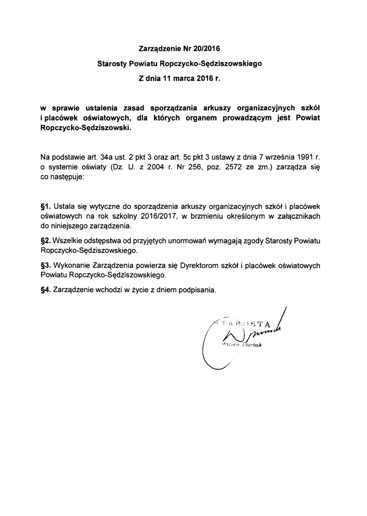 Zarzqdzenie Nr 2012016 Starosty Powiatu Ropczycko-Sqdziszowskiego Z dnia 11 marca 2016 r. w sprawie ustalenia zasad sporzqdzania arkuszy organizacyjnych szkol i placowek oswiatowych, dla ktorych organem prowadzqcym jest Powiat Ropczycko-Sqdziszowski. Na podstawie art. 34a ust. 2 pkt 3 oraz art. 5c pkt 3 ustawy z dnia 7 wrzesnia 1991 r. o systemie oswiaty (Dz. U. z 2004 r. Nr 256, poz. 2572 ze zm.) zarzqdza siq co nastqpuje: 91. Ustala siq wytyczne do sporzqdzenia arkuszy organizacyjnych szkol i placowek oswiatowych na rok szkolny 2016/2017, w brzmieniu okreslonym w zalqcznikach do niniejszego zarzqdzenia. 92. Wszelkie odstqpstwa od przyjetych unormowan wymagajq zgody Starosty Powiatu Ropczycko-Sqdziszowskiego. 93. Wykonanie Zarzqdzenia powierza siq Dyrektorom szkol i placowek oswiatowych Powiatu Ropczycko-Sqdziszowskiego. 94. Zarzqdzenie wchodzi w zycie z dniem podpisania. Zalqcznik Nr 1 do Zarzqdzenia Nr 2012016 Starosty Powiatu Ropczycko-Sqdziszowskiego z dnia 11 marca 2016 r. I. Zasady organizacyjne Dyrektor szkoly ustala plan nauczar~iazgodrrie z $4 Rozporzqdzenia Ministra 1) Edukacji Narodowej z dnia 7 lutego 2012 r. w sprawie ramowych planow nauczania w szkolach publicznych (Dz. U. z 2012r. poz. 204) zwane dalej rozporzqdzeniem. Liczbq oddzialow klas pierwszych i ich minimalna liczebnosc w szkolach okresla 2) zalqcznik nr 2 do niniejszego zarzqdzenia. 3) Zmian w przydziale czynnosci nauczycieli, zwiqzanych ze zmianq liczby uczniow w oddziale (zwiqkszenie, art. 20a ust 3 ustawy o systemie oswiaty -dalej: uos, lub zmniejszenie) skutkujqcq podzialem na grupy , dokonuje dyrektor szkoly nastqpnego miesiqca, w ktorym nastqpila zmiana w liczbie uczniow. 4) Liczbq dzieci i mlodziezy dla poradni psychologiczno-pedagogicznejustala siq jako sumq liczby: dzieci w wieku 0-5 lat wg. GUS na podstawie urodzen w poszczegolnych gminach i uczniow szkol podstawowych, gimnazjow i szkol ponadgimnazjalnych wd. SIO na dzien 31 marca br. 5) Liczbq wychowankow Miqdzyszkolnej Bursy w Ropczycach ustala siq na poziomie ilosci miejsc w Miqdzyszkolnej Bursie. 6) Liczbq uczniow odbywajqcych praktyczna naukq zawodu w Centrum Ksztalcenia Praktycznego w Ropczycach okresla siq na podstawie pisemnych informacji ze szkol, majqcych zamiar zawrzek umowy z CKP w sprawie praktycznej nauki zawodu. 7) Dla kadry kierowniczej szkoly nie przydziela siq godzin ponadwymiarowych oraz godzin doraznych. Dopuszczalna jest tylko sytuacja przydzielania godzin kadrze kierowniczej w przypadku naturalnego przekroczenia pensum. 8) Projekt arkusza organizacyjnego jak rowniez kazdy aneks do zatwierdzonego arkusza, zgodnie z art. 41 ust. 2 uos powinien byc zaopiniowany przez radq pedagogicznq. 9) Zmiany organizacyjne mogq zachodzic w trakcie wakacji i roku szkolnego. W celu dostosowania arkusza organizacji do aktualnej sytuacji szkoly nalezy kazdorazowo sporzqdzic aneks do zatwierdzonego arkusza. Aneks opracowywany jest w 2 egzemplarzach w wersji papierowej nalezy skladac do zatwierdzenia przed zamiarem wprowadzenia zmian w organizacji nauczania , wychowania i opieki. II. Harmonogram sporzqdzania i zatwierdzania arkuszy i aneksow 1. Arkusze organizacji pracy szkollplacowek Dyrektorzy opracowujq w wersji elektronicznej oraz wydrukowane dwa egzemplarze sktadajq wraz z zatqcznikami na dzienniku podawczym Starostwa Powiatowego w Ropczycach do dnia 30 kwietnia br. 2. Wersja papierowa arkusza organizacji pracy szkolylplacowki (tzw. ,,ptachtan) powinna byc podpisana przez Dyrektora oraz gtownego ksiqgowego szkolylplac6wki i zawierac opiniq rady pedagogicznej. 3. Przy sporzqdzaniu arkuszy proszq wpisywac nauczycieli wg. zasady: dyrektor, pozostali cztonkowie kadry kierowniczej, nauczyciele zatrudnieni w petnym wymiarze czasu pracy, nauczyciele niepetnego wymiaru czasu pracy oraz vacaty. 4. Zatqcznikami do a rkusza organizacji sq: 1) Szkolne plany nauczania, 2) Liczba nauczycieli, ktorzy realizujq staze na poszczegolne stopnie awansu zawodowego, ze wskazaniem terminu ztozenia przez nich wniosku o przystqpienie do postqpowan kwalifikacyjnych lub egzaminacyjnych 3) Aktualny wykaz orzeczeri o potrzebie ksztatcenia specjalnego i indywidualnego nauczania 4) Podziat na grupy - wg. zatqczonego wzoru 5) Wykaz kadry pedagogicznej - wydruk z programu komputerowego. 6) Wykaz kadry administracji i obstugi - wg. zatqczonego wzoru. 5. Zatwierdzony arkusz jest podstawq do wprowadzenia zmian w organizacji pracy szkolylplacowki na rok szkolny 2016117. 6. W przypadku zmian, w stosunku do projektu (arkusz majowy) Dyrektor szkolylplacowki do 25 sierpnia 2016 r. przedktada aneks nr 1 w 2 egzemplarzach papierowych. 7. Wszelkie odstqpstwa od ww. zasad i kryteriow nalezy uzgadniak pisemnie ze Starostq Powiatu Ropczycko-Sqdziszowskiego. 8. Zobowiqzuje siq Panstwa Dyrektorow do bezwzglqdnego przestrzegania przepisow prawa oswiatowego i nir~iejszychzasad. 9. Dyrektorzy szk~lplacowekzobowiqzani sq organizowak i prowadzic dziatalnosc dydaktycznq, wychowawczq i opiekunczq oraz obstugq administracyjna, finansowq i gospodarczq w raniach srodkow okreslonych w planie finansowym. Zalqcznik Nr 2 do Zarzqdzenia Nr 2012016 Starosty Powiatu Ropczycko-Sqdziszowskiego z dnia 11 marca 2016 r. liczba oddzialow 1 Ip. I szkola LO technikum minimalna liczba uczniow w klasie zsz 1 2 LOS 3 x x 3ZSR 1 3 1 30 4 ZSAT x 3 1 30 5 ZST x 1 x 30 30 Zalqcznik Nr 3 do Zarzqdzenia Nr 2012016 Starosty Powiatu Ropczycko-Sedziszowskiego z dnia 11 marca 2016 r. Podziat na grupy razem uczniow w grupie nauczyciel uwagi Zalqcznik Nr 4 do Zarzqdzenia Nr 2012016 Starosty Powiatu Ropczycko-Sedziszowskiego z dnia 11 marca 2016 r. WYKAZ PRACOWNIKOW ADMINISTRACJI I OBSLUGI 1 I 1 ( ' Ip. nazwisko i imiq stanowisko pracy rodzaj zawartej umowy o pracq (czas nieokreglony, okreilony, zast 1 wymiar czasu 1 *) w przypadku urnow o pracq zawartych na czas okreslony, zastqpstwo itp. proszq o podanie uplywu terrninu obowiqzywania danej urnowy up- '' ,,C~PI. ;. & EctL 1