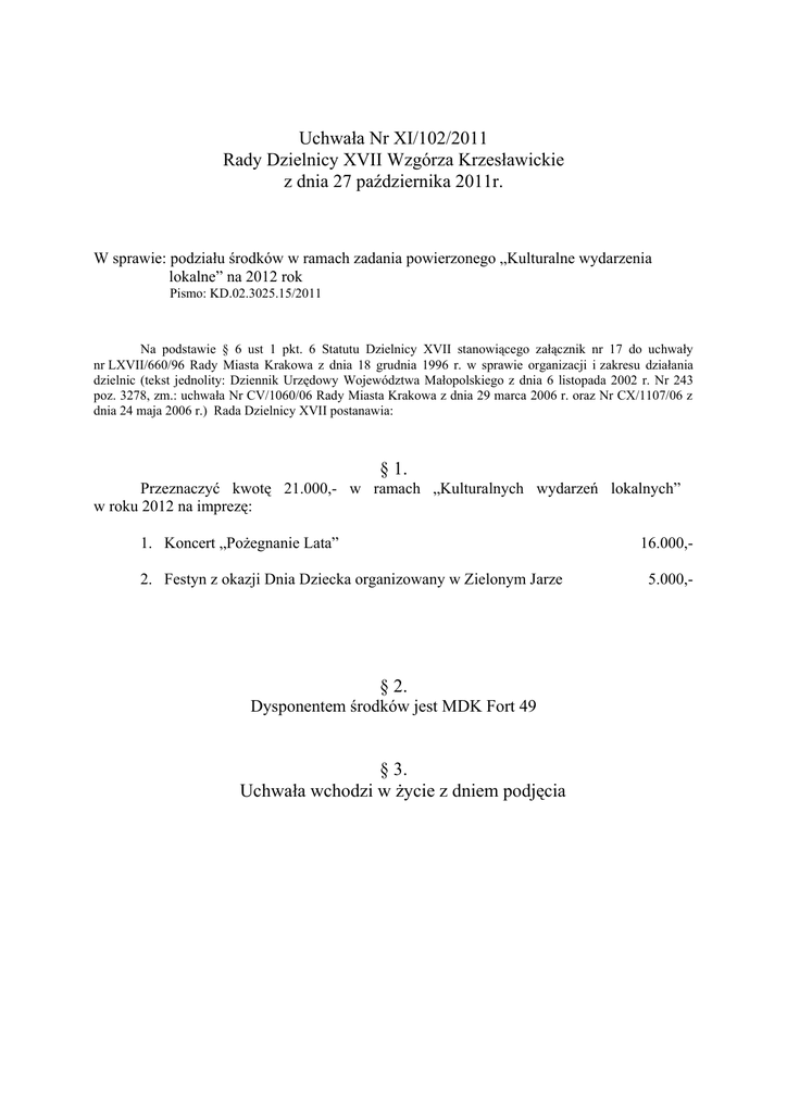 Uchwała Nr XI/102/2011 Rady Dzielnicy XVII Wzgórza Krzesławickie z dnia 27 października 2011r. W sprawie: podziału środków w ramach zadania powierzonego „Kulturalne wydarzenia lokalne” na 2012 rok Pismo: KD.02.3025.15/2011 Na podstawie § 6 ust 1 pkt. 6 Statutu Dzielnicy XVII stanowiącego załącznik nr 17 do uchwały nr LXVII/660/96 Rady Miasta Krakowa z dnia 18 grudnia 1996 r. w sprawie organizacji i zakresu działania dzielnic (tekst jednolity: Dziennik Urzędowy Województwa Małopolskiego z dnia 6 listopada 2002 r. Nr 243 poz. 3278, zm.: uchwała Nr CV/1060/06 Rady Miasta Krakowa z dnia 29 marca 2006 r. oraz Nr CX/1107/06 z dnia 24 maja 2006 r.) Rada Dzielnicy XVII postanawia: § 1. Przeznaczyć kwotę 21.000,- w ramach „Kulturalnych wydarzeń lokalnych” w roku 2012 na imprezę: 1. Koncert „Pożegnanie Lata” 16.000,- 2. Festyn z okazji Dnia Dziecka organizowany w Zielonym Jarze § 2. Dysponentem środków jest MDK Fort 49 § 3. Uchwała wchodzi w życie z dniem podjęcia 5.000,- Uchwała Nr XI/103/2011 Rady Dzielnicy XVII Wzgórza Krzesławickie z dnia 27 października 2011 r. W sprawie: podziału środków w ramach zadania powierzonego „Tworzenie, modernizacja i utrzymanie ogródków jordanowskich (osiedlowych placów zabaw) oraz zieleńców i skwerów wraz z małą architekturą” na rok 2012 Pismo: ZIKiT/Z/0020/11/EP/60085 Na podstawie § 6 ust. 1 pkt. 3 i 4 Statutu Dzielnicy XVII stanowiącego załącznik nr 17 do uchwały nr LXVII/660/96 Rady Miasta Krakowa z dnia 18 grudnia 1996 r. w sprawie organizacji i zakresu działania dzielnic (tekst jednolity: Dziennik Urzędowy Województwa Małopolskiego z dnia 6 listopada 2002 r. Nr 243 poz. 3278, zm.: uchwała Nr CV/1060/06 Rady Miasta Krakowa z dnia 29 marca 2006 r. oraz Nr CX/1107/06 z dnia 24 maja 2006 r.) Rada Dzielnicy XVII postanawia: § 1. Dokonać podziału środków na zadaniu powierzonym „Tworzenie, modernizacja i utrzymanie ogródków jordanowskich (osiedlowych placów zabaw) oraz zieleńców i skwerów wraz z małą architekturą” na rok 2012 w kwocie 245.000 zł w sposób następujący: 1. 2. 3. 4. Bieżące utrzymanie ogródków Sprzątanie terenu „Zielony Jar” po imprezach Pielęgnacja zieleni wysokiej i niskiej, wg wskazań Dzielnicy Doposażenie ogródków jordanowskich wg wskazań Dzielnicy 57.500-, 2.000-, 50.500-, 135.000-, § 2. Dysponentem środków jest Zarząd Infrastruktury Komunalnej i Transportu § 3. Uchwała wchodzi w życie z dniem podjęcia Uchwała Nr XI/104/2011 Rady Dzielnicy XVII Wzgórza Krzesławickie z dnia 27 października 2011 r. w sprawie: przyznania medali z okazji XX-lecia powstania Dzielnic Miasta Krakowa Na podstawie § 4 pkt. 5 lit. ł Statutu Dzielnicy XVII stanowiącego załącznik nr 17 do uchwały nr LXVII/660/96 Rady Miasta Krakowa z dnia 18 grudnia 1996 r. w sprawie organizacji i zakresu działania dzielnic (tekst jednolity: Dziennik Urzędowy Województwa Małopolskiego z dnia 6 listopada 2002 r. Nr 243 poz. 3278, z późn. zm.) Rada Dzielnicy XVII uchwala, co następuje : § 1. Opiniuje się pozytywnie współpracę i wyraża się uznanie dla niżej wymienionych osób zasłużonych dla rozwoju samorządności lokalnej Dzielnicy XVII „Wzgórza Krzesławickie”: 1. Chruściel Renata 2. Dutkowski Edward 3. Jop Jerzy 4. Kawa Jan 5. Madej Stanisław 6. Madejski Józef 7. Mikulska Helena 8. Nowak Franciszek 9. Rajski Stanisław 10. Sendorek Zdzisław 11. Walczak Stanisław 12. Zdziebko Aleksander 13. Ksiądz Jan Głód 14. Ksiądz Jan Krzyżowski 15. Wójcik Krzysztof 16. Teresa i Benedykt Tomczykowie 17. Poseł Ireneusz Raś § 2. Opiniuje się pozytywnie współpracę i wyraża się uznanie dla niżej wymienionych instytucji oraz reprezentujących je osób zasłużonych dla rozwoju samorządności lokalnej Dzielnicy XVII „Wzgórza Krzesławickie”: 1. 2. 3. 4. 5. 6. Towarzystwo Przyjaciół Grębałowa – Prezes Nowak Franciszek Towarzystwo Przyjaciół Luboczy – Prezes Jerzy Wójcik Stowarzyszenie Przyjaciół Kantorowic – Prezes Renata Kucharska Towarzystwo Przyjaciół Krzesławic – Prezes Janusz Zabagło Stowarzyszenie Przyjaciół Łuczanowic – Prezes Mieczysław Rutka Stowarzyszenie Przyjaciół Wadowa – Prezes Janusz Gruchała 7. Stowarzyszenie Sympatyków Zesławic i Okolic „Bez Granic” – Prezes Ewa Mauer 8. Szkoła Podstawowa nr 78 – Dyrektor Dorota Kadula 9. Szkoła Podstawowa Nr 129 – Dyrektor Grażyna Leszko 10. Gimnazjum Nr 43 – Dyrektor Barbara Wójcik 11. Gimnazjum Nr 44 – Dyrektor Małgorzata Hutyra 12. Zespół Szkół Ogólnokształcących Integracyjnych Nr 6 – Dyrektor Bożena Cabaj – Miciak 13. Przedszkole Nr 111 – Dyrektor Małgorzata Dziki 14. Przedszkole Nr 112 – Dyrektor Władysława Pichalska 15. Przedszkole Nr 63 – Dyrektor Marta Soloch 16. Młodzieżowy Dom Kultury Fort 49 – Dyrektor Franciszek Dziadoń 17. Ośrodek Kultury Kraków Nowa Huta – Dyrektor Małgorzata Jezutek 18. Spółdzielnia Mieszkaniowa „Hutnik” – Prezes Janusz Zwierzykowski 19. Spółdzielnia Mieszkaniowa „Zielony Jar” - Prezes Tomasz Baran 20. Polski Związek Emerytów, Rencistów i Inwalidów – Członkini Zarządu Rej. PZERiI Zofia Szelegieniec 21. Klub Sportowy „Grębałowianka„ - Prezes Krzysztof Wiatr 22. Klub Aneks – Kierownik Danuta Radosz 23. Kub Krzesławice – Kierownik Agnieszka Kowalska 24. Klub Dukat – Kierownik Zygmunt Kiszka § 3. Uchwała wchodzi w życie z dniem podjęcia Uchwała Nr XI/105/2011 Rady Dzielnicy XVII Wzgórza Krzesławickie z dnia 27 października 2011 r. W sprawie: wniosków do projektu Miejscowego Planu Zagospodarowania Przestrzennego obszaru „Kantorowicka – Niebyła” Na podstawie § 4 pkt. 4 lit a Statutu Dzielnicy XVII stanowiącego załącznik nr 17 do uchwały nr LXVII/660/96 Rady Miasta Krakowa z dnia 18 grudnia 1996 r. w sprawie organizacji i zakresu działania dzielnic (tekst jednolity: Dziennik Urzędowy Województwa Małopolskiego z dnia 6 listop