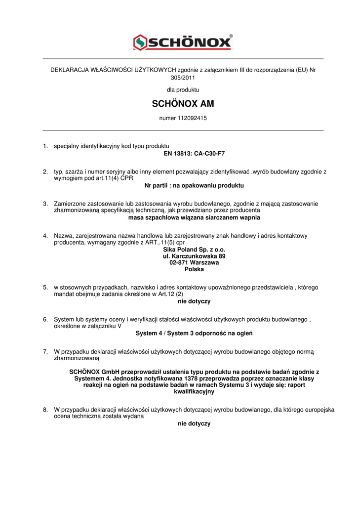 DEKLARACJA WŁAŚCIWOŚCI UŻYTKOWYCH zgodnie z załącznikiem III do rozporządzenia (EU) Nr 305/2011 dla produktu SCHÖNOX AM numer 112092415 1. specjalny identyfikacyjny kod typu produktu EN 13813: CA-C30-F7 2. typ, szarża i numer seryjny albo inny element pozwalający zidentyfikować .wyrób budowlany zgodnie z wymogiem pod art.11(4) CPR Nr partii : na opakowaniu produktu 3. Zamierzone zastosowanie lub zastosowania wyrobu budowlanego, zgodnie z mającą zastosowanie zharmonizowaną specyfikacją techniczną, jak przewidziano przez producenta masa szpachlowa wiązana siarczanem wapnia 4. Nazwa, zarejestrowana nazwa handlowa lub zarejestrowany znak handlowy i adres kontaktowy producenta, wymagany zgodnie z ART..11(5) cpr Sika Poland Sp. z o.o. ul. Karczunkowska 89 02-871 Warszawa Polska 5. w stosownych przypadkach, nazwisko i adres kontaktowy upoważnionego przedstawiciela , którego mandat obejmuje zadania określone w Art.12 (2) nie dotyczy 6. System lub systemy oceny i weryfikacji stałości właściwości użytkowych produktu budowlanego , określone w załączniku V System 4 / System 3 odporność na ogień 7. W przypadku deklaracji właściwości użytkowych dotyczącej wyrobu budowlanego objętego normą zharmonizowaną SCHÖNOX GmbH przeprowadził ustalenia typu produktu na podstawie badań zgodnie z Systemem 4. Jednostka notyfikowana 1378 przeprowadza poprzez oznaczanie klasy reakcji na ogień na podstawie badań w ramach Systemu 3 i wydaje się: raport kwalifikacyjny 8. W przypadku deklaracji właściwości użytkowych dotyczącej wyrobu budowlanego, dla którego europejska ocena techniczna została wydana nie dotyczy 9. Deklarowane właściwości Podstawowa charakterystyka Właściwości Klasa odporności ogniowej Wydzielanie substancji korozyjnych wartość pH przepuszczalność wody przepuszczalność pary wodnej μ wytrzymałość na ściskanie Wytrzymałość na zginanie Odporność na wodę siła przyczepności przy rozciąganiu odporność na wstrząsy izolacja akustyczna absorbcja dźwięku odporność termiczna odporność chemiczna Siła wiązania A1 / A1fl CA ≥7 nie ustalone wyniki nie ustalone wyniki C30 F7 nie ustalone wyniki nie ustalone wyniki nie ustalone wyniki nie ustalone wyniki nie ustalone wyniki nie ustalone wyniki nie ustalone wyniki niedefiniowane Zharmonizowanie specyfikacji technicznej 13813:2002 13813:2002 13813:2002 13813:2002 13813:2002 13813:2002 13813:2002 13813:2002 13813:2002 13813:2002 13813:2002 13813:2002 13813:2002 13813:2002 13813:2002 10. Właściwości użytkowe określonego w pkt 1 i 2 jest zgodna z deklarowanymi właściwościami użytkowymi w pkt 9. Niniejsza deklaracja właściwości użytkowych wydana zostaje na wyłączną odpowiedzialność producenta określonego w pkt 4 Podpisano w imieniu producenta przez Rosendahl, 2014-08-12 Wolfgang Börsting, R&D Manager Felix Meinert, R&D Application Support Zgodnie z art..6(5) rozporządzenia (EU) nr 305/2011 karta charakterystyki, odpowiadające (EU) Nr 1907/2006 ( REACH) aneks II, jest załączona do niniejszej deklaracji zgodności.