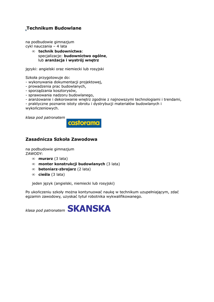 Technikum Budowlane na podbudowie gimnazjum cykl nauczania – 4 lata • technik budownictwa: specjalizacje: budownictwo ogólne, lub aranżacja i wystrój wnętrz języki: angielski oraz niemiecki lub rosyjski Szkoła przygotowuje do: - wykonywania dokumentacji projektowej, - prowadzenia prac budowlanych, - sporządzania kosztorysów, - sprawowania nadzoru budowlanego, - aranżowanie i dekorowanie wnętrz zgodnie z najnowszymi technologiami i trendami, - praktyczne poznanie istoty obrotu i dystrybucji materiałów budowlanych i wykończeniowych. klasa pod patronatem Zasadnicza Szkoła Zawodowa na podbudowie gimnazjum ZAWODY: • murarz (3 lata) • monter konstrukcji budowlanych (3 lata) • betoniarz-zbrojarz (2 lata) • cieśla (3 lata) jeden język (angielski, niemiecki lub rosyjski) Po ukończeniu szkoły można kontynuować naukę w technikum uzupełniającym, zdać egzamin zawodowy, uzyskać tytuł robotnika wykwalifikowanego. klasa pod patronatem SKANSKA