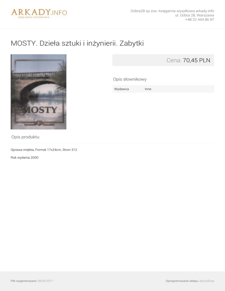 Dobra28 sp zoo. księgarnia wysyłkowa arkady.info ul. Dobra 28, Warszawa +48 22 444 86 97 MOSTY. Dzieła sztuki i inżynierii. Zabytki Cena: 70,45 PLN Opis słownikowy Wydawca Inne Opis produktu Oprawa miękka, Format 17x24cm, Stron 312 Rok wydania 2000 Plik wygenerowano: 08-03-2017 Powered by TCPDF (www.tcpdf.org) Oprogramowanie sklepu: AptusShop