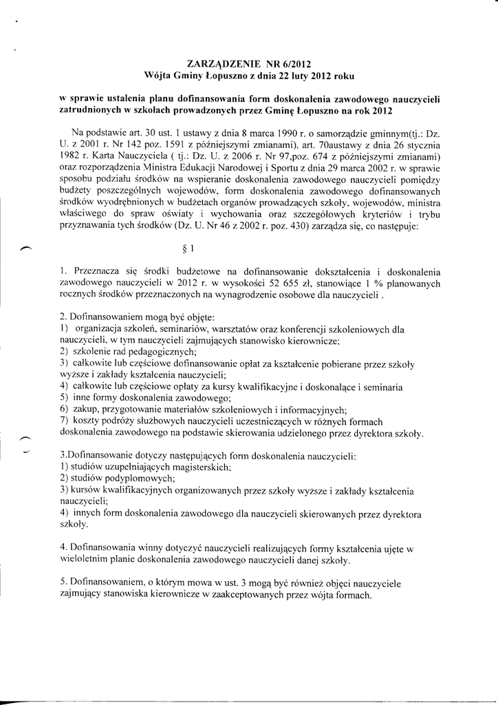 Z A R Z ^ D Z E N I E NR 6/2012 Wojta Gminy Lopuszno z dnia 22 luty 2012 roku w sprawie ustalenia planu dofinansowania form doskonalenia zawodowego nauczycieli zatrudnionych w szkotach prowadzonych przez Gminf Lopuszno na rok 2012 Na podstawie art. 30 ust. 1 ustawy z dnia 8 marca 1990 r. o samorz^dzie gminnym(tj.: Dz. U. z 2001 r. Nr 142 poz. 1591 z pozniejszymi zmianami), art. TOaustawy z dnia 26 stycznia 1982 r. Karta Nauczyciela ( tj.; Dz. U. z 2006 r. Nr 97,poz. 674 z pozniejszymi zmianami) oraz rozporz^dzenia Ministra Edukacji Narodowej i Sportu z dnia 29 marca 2002 r. w sprawie sposobu podzialu srodkow na wspieranie doskonalenia zawodowego nauczycieli pomi^dzy budzety poszczegolnych wojewodow, fonn doskonalenia zawodowego dofmansowanych srodkow wyodr^bnionych w budzetach organow prowadz^cych szkoty, wojewodow, ministra wlasciwego do spraw oswiaty i wychowania oraz szczegolowych kryteriow i trybu przyznawania tych srodkow (Dz. U. Nr 46 z 2002 r. poz. 430) zarz^dza si?, co nast^puje: §1 1. Przeznacza si(? srodki budzetowe na dofinansowanie doksztatcenia i doskonalenia zawodowego nauczycieli w 2012 r. w wysokosci 52 655 zl, stanowi^ce 1 % planowanych rocznych srodkow przeznaczonych na wynagrodzenie osobowe dla nauczycieli . 2. Dofmansowaniem mog^byc obj^te: 1) organizacja szkolen, seminariow, warsztatow oraz konferencji szkoleniowych dla nauczycieli, w tym nauczycieli zajmuj^cych stanowisko kierownicze; 2) szkolenie rad pedagogicznych; 3) calkowite lub cz^sciowe dofinansowanie oplat za ksztalcenie pobierane przez szkoly wyzsze i zaklady ksztalcenia nauczycieli; 4) calkowite lub cz^sciowe oplaty za kursy kwalifikacyjne i doskonal^ce i seminaria 5) inne formy doskonalenia zawodowego; 6) zakup, przygotowanie materialow szkoleniowych i informacyjnych; 7) koszty podrozy sluzbowych nauczycieli uczestnicz^cych w roznych formach doskonalenia zawodowego na podstawie skierowania udzielonego przez dyrektora szkoly. 3. Dofinansowanie dotyczy nast^puj^cych form doskonalenia nauczycieli: 1) studiow uzupetniaj^cych magisterskich; 2) studiow podyplomowych; 3) kursow kwalifikacyjnych organizowanych przez szkoly wyzsze i zaklady ksztalcenia nauczycieli; 4) innych form doskonalenia zawodowego dla nauczycieli skierowanych przez dyrektora szkoly. 4. Dofinansowania winny dotyczyc nauczycieli realizuj^cych formy ksztalcenia uj^te w vvieloletnim planie doskonalenia zawodowego nauczycieli danej szkoty. 5. Dofmansowaniem, o ktorym mowa w ust. 3 mogq bye rowniez obj^ci nauczyciele zajmuj^cy stanowiska kierownicze w zaakceptowanych przez wojta formach. §2 Maksymalna kwota dofinansowania opiat za ksztalcenie nauczyciela w 2012 roku w szkolach i placowkach prowadzonych przez Gmin? Lopuszno wynosi 1500 zl na rok budzetowv. §3 Zatwierdza si(j plan dofinansowania form doskonalenia zawodowego nauczycieli w 2012r. stanowi^cy zat^cznik Nr.l do niniejszego zarz^dzenia. §4 1. Podzialu srodkow przeznaczonych na doksztalcanie i doskonalenie zawodowe nauczycieli dokonuje dyrektor szkoly na podstawie przedlozonych wnioskow nauczycieli do dyrektorow szkol. 2. Ustala si? wzor wniosku , o ktorym mowa w ust. 1 w brzmieniu stanowi^cym zal^cznik nr 2 do zarz^dzenia . §5 Wykonanie zarz<\dzenia powierza si? dyrektorom Lopuszno. szkol prowadzonych przez Gmin? §6 Zarz^dzenie wchodzi w zycie z dniem podpisania . (HVIINY Z6i^m 01eksi?>4c47,i„-,.;Q,^ C icksiewicz Zat^cznik Nr 1 do Zarz^dzenia Nr 6/2012 Wojta Gminy Lopuszno zdnia 22.02.2012 r. Plan dofinansowania form doskonalenia zawodowego nauczycieli narok 2012 L.p. Nazwa szkoly 1. Zespol Szkol im. Jana Pawla II w Lopusznie 2. Zespol Szkol w Gniezdziskach 3. Szkola Podstawowa w Dobrzeszowie Razem Wysokosc srodkow finansowych w zlotych 33 481 11 663 7 511 52 655 Zai^cznik Nr. 2 Do Zarz^dzenia Nr 6/2012 Wojta Gminy Lopuszno zdnia 22.02.2012 r. WNIOSEK O DOFINANSOWANIE DOSKONALENIA Z A W O D O W E G O I. DANE OSOBOWE 1 .Imi? i nazwisko 2.Doktadny adres zamieszkania ,telefon 3. Miejsce pracy 4. Adres miejsca pracy 5. Nauczany przedmiot glowny, wymiar godzin 6. Poziom wyksztalcenia, tytut, ukonczenia szkoly/uczelni i kierunek studiow 11. I N F O R M A C J E O P O D J ^ T Y C H STUDIACH L U B INNEJ F O R M I E DOSKONALENIA 1.Nazwa szkoly wyzszej (instytucji) 2.Siedziba szkoly wyzszej (instytucji), adres 3. Wydzial (nazwa formy) 4. Kierunek studi6w(nie dotyczy form doskonalenia) 5.Specjalnosc( nie dotyczy form doskonalenia) 6. Rodzaj studi6w( nie dotyczy form doskonalenia) 7. Czas trwania studiow, liczba semestrow (czas trwania danej formy) 5. Podac rok studiow, semestr, ktory dotyczy dofinansowania 9.Wysokosc oplaty za semestr (formy doskonalenia) (miejscowosc, data) W zal^czeniu: 1 .Zaswiadczenie z uczelni 2.Faktura oryginal. (podpis nauczyciela)