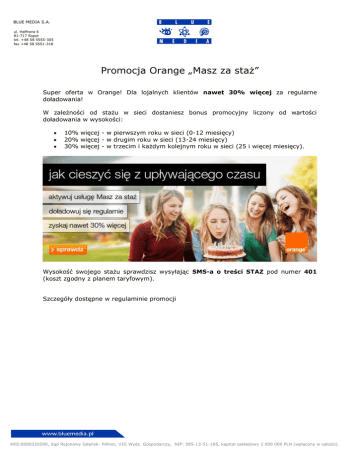 BLUE MEDIA S.A. ul. Haffnera 6 81-717 Sopot tel. +48 58 5555-305 fax +48 58 5551-318 Promocja Orange „Masz za staż” Super oferta w Orange! Dla lojalnych klientów nawet 30% więcej za regularne doładowania! W zależności od stażu w sieci dostaniesz bonus promocyjny liczony od wartości doładowania w wysokości: 10% więcej - w pierwszym roku w sieci (0-12 miesięcy) 20% więcej - w drugim roku w sieci (13-24 miesięcy) 30% więcej - w trzecim i każdym kolejnym roku w sieci (25 i więcej miesięcy). Wysokość swojego stażu sprawdzisz wysyłając SMS-a o treści STAZ pod numer 401 (koszt zgodny z planem taryfowym). Szczegóły dostępne w regulaminie promocji KRS:0000320590, Sąd Rejonowy Gdańsk- Północ, VIII Wydz. Gospodarczy, NIP: 585-13-51-185, kapitał zakładowy 2 000 000 PLN (wpłacony w całości).