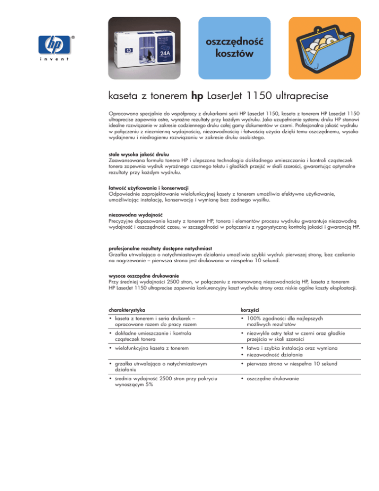 oszczdnoć kosztów kaseta z tonerem hp LaserJet 1150 ultraprecise Opracowana specjalnie do współpracy z drukarkami serii HP LaserJet 1150, kaseta z tonerem HP LaserJet 1150 ultraprecise zapewnia ostre, wyra-ne rezultaty przy ka#dym wydruku. Jako uzupełnienie systemu druku HP stanowi idealne rozwizanie w zakresie codziennego druku całej gamy dokumentów w czerni. Profesjonalna jakoć wydruku w połczeniu z niezmienn wydajnoci, niezawodnoci i łatwoci u#ycia dzi&ki temu oszcz&dnemu, wysoko wydajnemu i niedrogiemu rozwizaniu w zakresie druku osobistego. stale wysoka jakoć druku Zaawansowana formuła tonera HP i ulepszona technologia dokładnego umieszczania i kontroli czsteczek tonera zapewnia wydruk wyra-nego czarnego tekstu i gładkich przejć w skali szaroci, gwarantujc optymalne rezultaty przy ka#dym wydruku. łatwoć uytkowania i konserwacji Odpowiednie zaprojektowanie wielofunkcyjnej kasety z tonerem umo#liwia efektywne u#ytkowanie, umo#liwiajc instalacj&, konserwacj& i wymian& bez #adnego wysiłku. niezawodna wydajnoć Precyzyjne dopasowanie kasety z tonerem HP, tonera i elementów procesu wydruku gwarantuje niezawodn wydajnoć i oszcz&dnoć czasu, w szczególnoci w połczeniu z rygorystyczn kontrol jakoci i gwarancj HP. profesjonalne rezultaty dostpne natychmiast Grzałka utrwalajca o natychmiastowym działaniu umo#liwia szybki wydruk pierwszej strony, bez czekania na nagrzewanie – pierwsza strona jest drukowana w niespełna 10 sekund. wysoce oszczdne drukowanie Przy redniej wydajnoci 2500 stron, w połczeniu z renomowan niezawodnoci HP, kaseta z tonerem HP LaserJet 1150 ultraprecise zapewnia konkurencyjny koszt wydruku strony oraz niskie ogólne koszty eksploatacji. charakterystyka korzyci • kaseta z tonerem i seria drukarek – opracowane razem do pracy razem • 100% zgodnoci dla najlepszych mo#liwych rezultatów • dokładne umieszczanie i kontrola czsteczek tonera • niezwykle ostry tekst w czerni oraz gładkie przejcia w skali szaroci • wielofunkcyjna kaseta z tonerem • łatwa i szybka instalacja oraz wymiana • niezawodnoć działania • grzałka utrwalajca o natychmiastowym działaniu • pierwsza strona w niespełna 10 sekund • rednia wydajnoć 2500 stron przy pokryciu wynoszcym 5% • oszcz&dne drukowanie kaseta z tonerem hp LaserJet 1150 ultraprecise kogo szczególnie zainteresuje kaseta z tonerem HP LaserJet 1150? Idealna dla profesjonalistów w firmach o dowolnej wielkoci, którzy poszukuj rozwizania zapewniajcego niezawodny i niedrogi codzienny druk całej gamy dokumentów w czerni. Zaprojektowana tak#e dla u#ytkowników domowych i osób pracujcych poza biurem, poszukujcych zaawansowanych funkcji druku zapewniajcych du# wartoć za wydane pienidze. specyfikacje produktu p/n opis kod UPC wymiary (dł. x szer. x gł.) masa wydajnoć (przy pokryciu ok. 5%) Q2624A kaseta z tonerem hp LaserJet 1150 ultraprecise 8 08736 42061 7 333 x 142 x 198 mm 1,07 kg 2500 stron Specyfikacje przedstawione w tym dokumencie mog bez uprzedzenia ulec zmianie ©2003 Hewlett-Packard Company Wydrukowano w UE 5981-4902 PLE