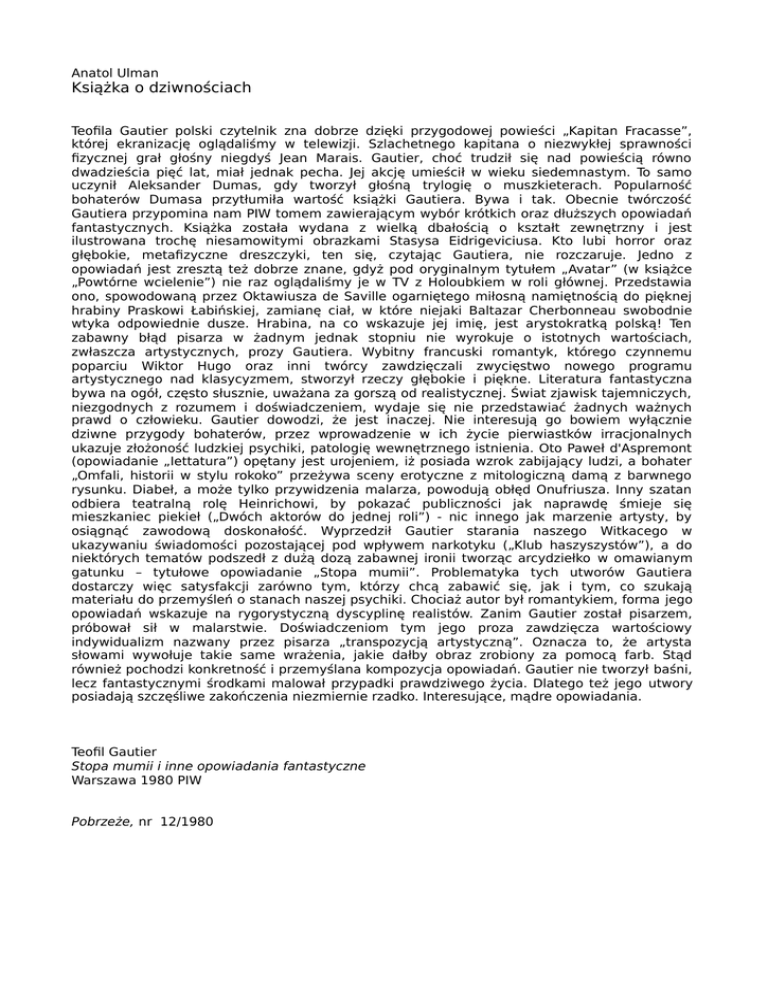 Anatol Ulman Książka o dziwnościach Teofila Gautier polski czytelnik zna dobrze dzięki przygodowej powieści „Kapitan Fracasse”, której ekranizację oglądaliśmy w telewizji. Szlachetnego kapitana o niezwykłej sprawności fizycznej grał głośny niegdyś Jean Marais. Gautier, choć trudził się nad powieścią równo dwadzieścia pięć lat, miał jednak pecha. Jej akcję umieścił w wieku siedemnastym. To samo uczynił Aleksander Dumas, gdy tworzył głośną trylogię o muszkieterach. Popularność bohaterów Dumasa przytłumiła wartość książki Gautiera. Bywa i tak. Obecnie twórczość Gautiera przypomina nam PIW tomem zawierającym wybór krótkich oraz dłuższych opowiadań fantastycznych. Książka została wydana z wielką dbałością o kształt zewnętrzny i jest ilustrowana trochę niesamowitymi obrazkami Stasysa Eidrigeviciusa. Kto lubi horror oraz głębokie, metafizyczne dreszczyki, ten się, czytając Gautiera, nie rozczaruje. Jedno z opowiadań jest zresztą też dobrze znane, gdyż pod oryginalnym tytułem „Avatar” (w książce „Powtórne wcielenie”) nie raz oglądaliśmy je w TV z Holoubkiem w roli głównej. Przedstawia ono, spowodowaną przez Oktawiusza de Saville ogarniętego miłosną namiętnością do pięknej hrabiny Praskowi Łabińskiej, zamianę ciał, w które niejaki Baltazar Cherbonneau swobodnie wtyka odpowiednie dusze. Hrabina, na co wskazuje jej imię, jest arystokratką polską! Ten zabawny błąd pisarza w żadnym jednak stopniu nie wyrokuje o istotnych wartościach, zwłaszcza artystycznych, prozy Gautiera. Wybitny francuski romantyk, którego czynnemu poparciu Wiktor Hugo oraz inni twórcy zawdzięczali zwycięstwo nowego programu artystycznego nad klasycyzmem, stworzył rzeczy głębokie i piękne. Literatura fantastyczna bywa na ogół, często słusznie, uważana za gorszą od realistycznej. Świat zjawisk tajemniczych, niezgodnych z rozumem i doświadczeniem, wydaje się nie przedstawiać żadnych ważnych prawd o człowieku. Gautier dowodzi, że jest inaczej. Nie interesują go bowiem wyłącznie dziwne przygody bohaterów, przez wprowadzenie w ich życie pierwiastków irracjonalnych ukazuje złożoność ludzkiej psychiki, patologię wewnętrznego istnienia. Oto Paweł d'Aspremont (opowiadanie „Iettatura”) opętany jest urojeniem, iż posiada wzrok zabijający ludzi, a bohater „Omfali, historii w stylu rokoko” przeżywa sceny erotyczne z mitologiczną damą z barwnego rysunku. Diabeł, a może tylko przywidzenia malarza, powodują obłęd Onufriusza. Inny szatan odbiera teatralną rolę Heinrichowi, by pokazać publiczności jak naprawdę śmieje się mieszkaniec piekieł („Dwóch aktorów do jednej roli”) - nic innego jak marzenie artysty, by osiągnąć zawodową doskonałość. Wyprzedził Gautier starania naszego Witkacego w ukazywaniu świadomości pozostającej pod wpływem narkotyku („Klub haszyszystów”), a do niektórych tematów podszedł z dużą dozą zabawnej ironii tworząc arcydziełko w omawianym gatunku – tytułowe opowiadanie „Stopa mumii”. Problematyka tych utworów Gautiera dostarczy więc satysfakcji zarówno tym, którzy chcą zabawić się, jak i tym, co szukają materiału do przemyśleń o stanach naszej psychiki. Chociaż autor był romantykiem, forma jego opowiadań wskazuje na rygorystyczną dyscyplinę realistów. Zanim Gautier został pisarzem, próbował sił w malarstwie. Doświadczeniom tym jego proza zawdzięcza wartościowy indywidualizm nazwany przez pisarza „transpozycją artystyczną”. Oznacza to, że artysta słowami wywołuje takie same wrażenia, jakie dałby obraz zrobiony za pomocą farb. Stąd również pochodzi konkretność i przemyślana kompozycja opowiadań. Gautier nie tworzył baśni, lecz fantastycznymi środkami malował przypadki prawdziwego życia. Dlatego też jego utwory posiadają szczęśliwe zakończenia niezmiernie rzadko. Interesujące, mądre opowiadania. Teofil Gautier Stopa mumii i inne opowiadania fantastyczne Warszawa 1980 PIW Pobrzeże, nr 12/1980