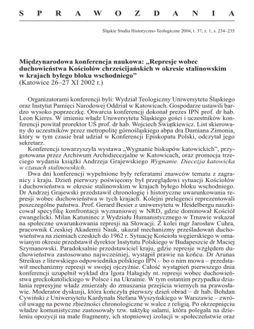 S P R A W O Z D A N I A Śląskie Studia Historyczno-Teologiczne 2004, t. 37, z. 1, s. 234–235 Międzynarodowa konferencja naukowa: „Represje wobec duchowieństwa Kościołów chrześcijańskich w okresie stalinowskim w krajach byłego bloku wschodniego” (Katowice 26–27 XI 2002 r.) Organizatorami konferencji byli: Wydział Teologiczny Uniwersytetu Śląskiego oraz Instytut Pamięci Narodowej Oddział w Katowicach. Gospodarze ustawili bardzo wysoko poprzeczkę. Otwarcia konferencji dokonał prezes IPN prof. dr hab. Leon Kieres. W imieniu władz Uniwersytetu Śląskiego gości i uczestników konferencji powitał prorektor UŚ prof. dr hab. Wojciech Świątkiewicz. List skierowany do uczestników przez metropolitę górnośląskiego abpa dra Damiana Zimonia, który w tym czasie brał udział w Konferencji Episkopatu Polski, odczytał jego sekretarz. Konferencji towarzyszyła wystawa „Wygnanie biskupów katowickich”, przygotowana przez Archiwum Archidiecezjalne w Katowicach, oraz promocja trzeciego wydania książki Andrzeja Grajewskiego Wygnanie. Diecezja katowicka w czasach stalinowskich. Dwa dni konferencji wypełnione były referatami znawców tematu z zagranicy i kraju. Dzień pierwszy poświęcony był przeglądowi sytuacji Kościołów i duchowieństwa w okresie stalinowskim w krajach byłego bloku wschodniego. Dr Andrzej Grajewski przedstawił chronologię i historyczne uwarunkowania represji wobec duchowieństwa w tych krajach. Kolejni prelegenci reprezentowali poszczególne państwa. Prof. Gerard Besier z uniwersytetu w Heidelbergu naszkicował specyfikę konfrontacji wyznaniowej w NRD, gdzie dominował Kościół ewangelicki. Milan Katuninec z Wydziału Humanistycznego w Trnawie wskazał na społeczne uwarunkowania represji na Słowacji. Z kolei mgr Jarosław Cuhra, pracownik Czeskiej Akademii Nauk, ukazał mechanizmy prześladowań duchowieństwa na ziemiach czeskich do 1962 r. Sytuację Kościoła węgierskiego w omawianym okresie przedstawił dyrektor Instytutu Polskiego w Budapeszcie dr Maciej Szymanowski. Paradoksalnie przedstawiciel kraju, gdzie represje względem duchowieństwa zastosowano najwcześniej, wystąpił prawie na końcu. Dr Arunas Streikus z litewskiego odpowiednika polskiego IPN – bo o nim mowa – przedstawił mechanizmy represji w swojej ojczyźnie. Całość wystąpień pierwszego dnia konferencji uzupełnił wykład dra Igora Hałagidy nt. represji wobec duchowieństwa greckokatolickiego w Polsce i na Ukrainie. W tym ostatnim przypadku działania represyjne władz zmierzały do zmuszania przejścia wiernych na prawosławie. Moderator dyskusji, która kończyła pierwszy dzień obrad – dr hab. Bohdan Cywiński z Uniwersytetu Kardynała Stefana Wyszyńskiego w Warszawie – zwrócił uwagę na pewne zbieżności chronologiczne w walce z religią. Po okrzepnięciu władze komunistyczne zastosowały tzw. taktykę salami, która polegała na dzieleniu opozycji na małe fragmenty, ich stopniowej izolacji w społeczeństwie oraz MIĘDZYNARODOWA KONFERENCJA NAUKOWA 235 ostatecznej likwidacji. Dopiero po zniszczeniu zbrojnego podziemia oraz legalnej opozycji przystąpiono do skutecznej rozprawy z Kościołem katolickim postrzeganym jako ostatni bastion opozycji. Drugi dzień konferencji został poświęcony zagadnieniu prześladowania Kościoła w Polsce. Ks. prof. dr hab. Jerzy Myszor przedstawił portret zbiorowy duchowieństwa katolickiego represjonowanego przez władze PRL. Dr Ryszard Gryz z Instytutu Historii Akademii Świętokrzyskiej skoncentrował się na zachowaniach stalinowskiego aparatu partyjno-państwowego w walce z duchowieństwem. Uzupełnieniem tego wystąpienia był komentarz dra Antoniego Dudka (IPN – Warszawa). Analizy tej represyjnej działalności od strony faktów sądowych dokonał Jacek Żurek (IPN – Warszawa). Komentatorem tego wystąpienia był prof. dr hab. Adam Lityński z Wydziału Prawa UŚ. Innym aspektem poruszanej tematyki była eliminacja nauczania religii oraz księży z polskich szkół. Mechanizm tego procesu i sposoby działań represyjnych w tym zakresie przedstawiła prof. dr hab. Hanna Konopka z uniwersytetu w Białymstoku. W tym przypadku cezura czasowa omawianego zagadnienia zamknęła się w datach 1944–1961. Reakcje hierarchii kościelnej na represje wobec duchowieństwa w okresie stalinowskiego terroru zarysował dr Jan Żaryn (IPN – Warszawa). Autor podkreślił znaczenie interwencji władz Kościoła katolickiego na rzecz represjonowanych, ułatwione w tym, że sekretariat prymasa Polski prowadził dokładną ewidencję wszystkich prześladowanych w tym okresie księży. Wystąpienie przedstawiciela Instytutu Politologii Uniwersytetu Szczecińskiego – dra Krzysztofa Kowalczyka, ukazało, jak bardzo zróżnicowany był system represji w zależności od sytuacji politycznej i społecznej panującej w regionie. Szczegółowej analizy tych działań na przykładzie diecezji śląskiej dokonał dr Adam Dziurok, reprezentujący katowicki IPN oraz Uniwersytet Kardynała Stefana Wyszyńskiego w Warszawie. Przedstawił on nieznane dotąd szczegóły akcji Urzędu Bezpieczeństwa wobec duchowieństwa diecezji katowickiej. Na zakończenie podjęto dyskusję podsumowującą dwa dni owocnych spotkań. Obrady konferencji podsumował dziekan Wydziału Teologicznego ks. prof. dr hab. Wincenty Myszor – podkreślił rolę współpracy różnych ośrodków naukowych z terenu Polski, które pomogły dokonać syntezy dotychczasowych, rozproszonych badań na temat represji stalinowskich w krajach byłego bloku wschodniego. Organizatorzy obiecali, że referaty wygłoszone w czasie konferencji zostaną niebawem opublikowane. Sala audytorium Biblioteki Śląskiej przez cały czas trwania posiedzenia była wypełniona. W konferencji wzięli udział przedstawiciele wielu ośrodków naukowych z całej Polski; wzbudziła zainteresowanie wśród młodzieży gimnazjalnej i studentów Uniwersytetu Śląskiego. O konferenc