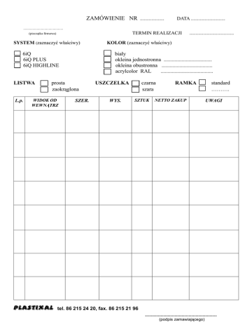ZAMÓWIENIE NR ................... DATA ........................... ............................................... TERMIN REALIZACJI (pieczątka firmowa) SYSTEM (zaznaczyć właściwy) L.p. prosta zaokrąglona WIDOK OD WEWNĄTRZ PLASTIXAL KOLOR (zaznaczyć właściwy) biały okleina jednostronna ................................... okleina obustronna ..................................... acrylcolor RAL ...................................... 6iQ 6iQ PLUS 6iQ HIGHLINE LISTWA ................................... SZER. USZCZELKA WYS. czarna szara SZTUK RAMKA NETTO ZAKUP standard ………. UWAGI tel. 86 215 24 20, fax. 86 215 21 96 ................................................... (podpis zamawiającego)
