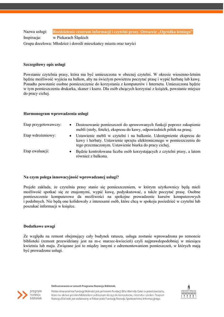 Nazwa usługi: Rozdzielenie centrum informacji i czytelni prasy. Otwarcie „Ogródka letniego” Inspiracja: w Piekarach Śląskich Grupa docelowa: Młodzież i dorośli mieszkańcy miasta oraz turyści Szczegółowy opis usługi Powstanie czytelnia prasy, która ma być umieszczona w obecnej czytelni. W okresie wiosenno-letnim będzie możliwość wyjścia na balkon, aby na świeżym powietrzu poczytać prasę i wypić herbatę lub kawę. Ponadto powstanie osobne pomieszczenie do korzystania z komputerów i Internetu. Umieszczona będzie w tym pomieszczeniu drukarka, skaner i ksero. Dla osób chcących korzystać z książek, powstanie miejsce do pracy cichej. Harmonogram wprowadzenia usługi Etap przygotowawczy: Etap wdrożeniowy: Etap ewaluacji: Dostosowanie pomieszczeń do sprawowanych funkcji poprzez zakupienie mebli (stoły, fotele), ekspresu do kawy, odpowiednich półek na prasę. Ustawienie mebli w czytelni i na balkonie. Udostępnienie ekspresu do kawy i herbaty. Ustawienie sprzętu elektronicznego w pomieszczeniu do tego przeznaczonym. Ustawienie biurka do pracy cichej. Będzie kontrolowana liczba osób korzystających z czytelni prasy, a latem również z balkonu. Na czym polega innowacyjność wprowadzanej usługi? Projekt zakłada, że czytelnia prasy stanie się pomieszczeniem, w którym użytkownicy będą mieli możliwość spotkać się ze znajomymi, wypić kawę, podyskutować, a także poczytać prasę. Osobne pomieszczenie komputerowe da możliwości na spokojne prowadzenie kursów komputerowych i podobnych. Nie będą one kolidowały z interesami osób, które chcą w spokoju posiedzieć w czytelni lub poszukać informacji w książce. Dodatkowe uwagi Ze względu na remont obejmujący cały budynek ratusza, usługa zostanie wprowadzona po remoncie biblioteki (remont przewidziany jest na m-c marzec-kwiecień) czyli najprawdopodobniej w miesiącu kwietniu lub maju. Związane jest to między innymi z odremontowaniem pomieszczeń, w których mają być prowadzone usługi. Materiały i narzędzia niezbędne do wprowadzenia usługi Zakup 2 stolików ogrodowych. Zakup foteli i stolików do czytelni. Zakup ekspresu do kawy. Pomysłodawca usługi Imię i nazwisko: Alina Wołodkiewicz Funkcja/Stanowisko w bibliotece: Dyrektor Nazwa biblioteki: Miejska Biblioteka Publiczna w Olsztynku Adres biblioteki: 11-015 Olsztynek, ul. Ratusz 1 Numer telefonu do kontaktu: 89 51-192-175