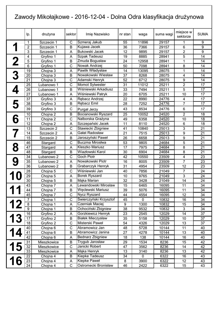 Zawody Mikołajkowe - 2016-12-04 - Dolna Odra klasyfikacja drużynowa 1 2 3 4 5 6 7 8 9 10 11 12 13 14 15 16 lp. drużyna sektor 1 2 3 4 5 6 19 20 21 25 26 27 37 38 39 10 11 12 13 14 15 46 47 48 34 35 36 28 29 30 43 44 45 7 8 9 16 17 18 40 41 42 31 32 33 22 23 24 Szczecin 1 Szczecin 1 Szczecin 1 Gryfino 1 Gryfino 1 Gryfino 1 Chojna 3 Chojna 3 Chojna 3 Lubanowo 1 Lubanowo 1 Lubanowo 1 Gryfino 3 Gryfino 3 Gryfino 3 Chojna 2 Chojna 2 Chojna 2 Szczecin 2 Szczecin 2 Szczecin 2 Stargard Stargard Stargard Lubanowo 2 Lubanowo 2 Lubanowo 2 Chojna 5 Chojna 5 Chojna 5 Chojna 7 Chojna 7 Chojna 7 Chojna 1 Chojna 1 Chojna 1 Gryfino 2 Gryfino 2 Gryfino 2 Chojna 6 Chojna 6 Chojna 6 Mieszkowice Mieszkowice Mieszkowice Chojna 4 Chojna 4 Chojna 4 C B A A B C A B C C B A A B C B C A C A B C A B C A B C A B A B C C A B A B C C B A B C A B A C Imię Nazwisko Szmeraj Jakub Kujawa Jacek Bukowski Jacek Szpak Tadeusz Żmuda Bogusław Nowak Andrzej Pawlik Władysław Nowakowski Wiesław Adamski Henryk Momot Sylwester Wiśniewski Arkadiusz Wiśniewski Patryk Rębacz Andrzej Rębacz Emil Purgal Jerzy Bocianowski Ryszard Nalborska Grażyna Szczepański Jacek Stawiecki Zbigniew Gałat Radosław Jaroszyński Paweł Buczma Mirosłwa Kleszko Mariusz Wiazłowski Karol Goch Piotr Nowakowski Piotr Grabarczyk Henryk Wiśniewski Jan Borek Ryszard Mąka Marian Lewandowski Mirosław Węclewski Mariusz Nycz Ryszard Świerczyński Krzysztof Czerniak Maciej Ochociński Zbigniew Gorzkiewicz Henryk Białek Mieczysław Misterski Paweł Abramowicz Jan Abramowicz Janina Bednarz Zbigniew Trygub Jarosław Janicki Robert Mąka Henryk Kiepke Tadeusz Kiepke Paweł Ostromecki Bronisław nr stan waga suma wagi miejsce w sektorze SUMA 55 36 12 19 24 50 14 37 52 31 33 20 22 28 43 25 49 11 41 21 26 53 17 30 42 16 31 40 10 32 15 39 44 45 9 38 23 35 54 48 27 18 29 47 13 34 8 46 11896 7366 9895 8885 12958 7098 13095 8268 6712 11012 7494 6705 8990 7252 8534 10052 6358 8110 10840 7515 6658 9805 7975 6904 10550 8005 4954 7856 9765 3428 6465 5076 4554 0 1300 9532 2545 5158 4326 5728 4278 138 1534 3562 3140 0 3900 2422 29157 29157 29157 28941 28941 28941 28075 28075 28075 25211 25211 25211 24776 24776 24776 24520 24520 24520 25013 25013 25013 24684 24684 24684 23509 23509 23509 21049 21049 21049 16095 16095 16095 10832 10832 10832 12029 12029 12029 10144 10144 10144 8236 8236 8236 6322 6322 6322 1 6 2 5 1 8 1 4 9 2 5 10 4 7 6 2 10 6 3 9 9 5 8 8 4 7 12 7 3 14 11 11 12 16 15 3 14 10 13 11 13 16 15 14 13 16 12 15 9 9 9 14 14 14 14 14 14 17 17 17 17 17 17 18 18 18 21 21 21 21 21 21 23 23 23 24 24 24 34 34 34 34 34 34 37 37 37 40 40 40 42 42 42 43 43 43