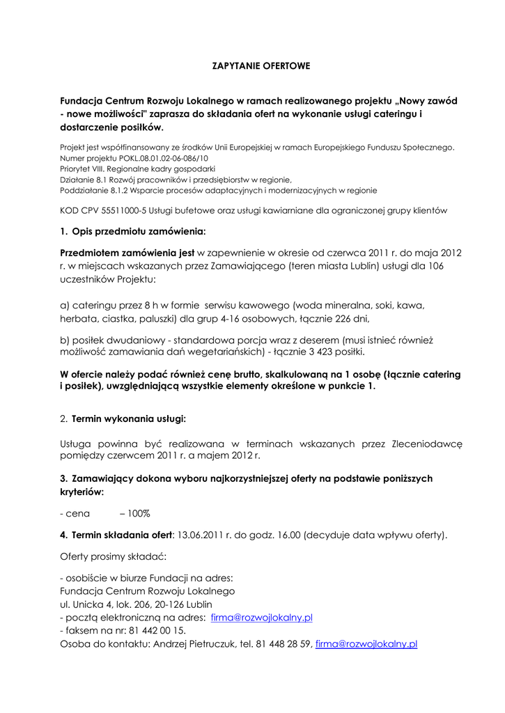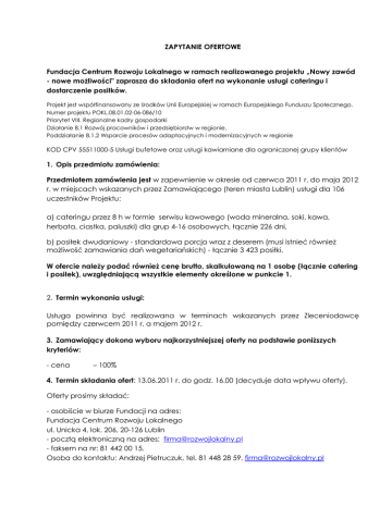 ZAPYTANIE OFERTOWE Fundacja Centrum Rozwoju Lokalnego w ramach realizowanego projektu „Nowy zawód - nowe możliwości" zaprasza do składania ofert na wykonanie usługi cateringu i dostarczenie posiłków. Projekt jest współfinansowany ze środków Unii Europejskiej w ramach Europejskiego Funduszu Społecznego. Numer projektu POKL.08.01.02-06-086/10 Priorytet VIII. Regionalne kadry gospodarki Działanie 8.1 Rozwój pracowników i przedsiębiorstw w regionie, Poddziałanie 8.1.2 Wsparcie procesów adaptacyjnych i modernizacyjnych w regionie KOD CPV 55511000-5 Usługi bufetowe oraz usługi kawiarniane dla ograniczonej grupy klientów 1. Opis przedmiotu zamówienia: Przedmiotem zamówienia jest w zapewnienie w okresie od czerwca 2011 r. do maja 2012 r. w miejscach wskazanych przez Zamawiającego (teren miasta Lublin) usługi dla 106 uczestników Projektu: a) cateringu przez 8 h w formie serwisu kawowego (woda mineralna, soki, kawa, herbata, ciastka, paluszki) dla grup 4-16 osobowych, łącznie 226 dni, b) posiłek dwudaniowy - standardowa porcja wraz z deserem (musi istnieć również możliwość zamawiania dań wegetariańskich) - łącznie 3 423 posiłki. W ofercie należy podać również cenę brutto, skalkulowaną na 1 osobę (łącznie catering i posiłek), uwzględniającą wszystkie elementy określone w punkcie 1. 2. Termin wykonania usługi: Usługa powinna być realizowana w terminach wskazanych przez Zleceniodawcę pomiędzy czerwcem 2011 r. a majem 2012 r. 3. Zamawiający dokona wyboru najkorzystniejszej oferty na podstawie poniższych kryteriów: - cena – 100% 4. Termin składania ofert: 13.06.2011 r. do godz. 16.00 (decyduje data wpływu oferty). Oferty prosimy składać: - osobiście w biurze Fundacji na adres: Fundacja Centrum Rozwoju Lokalnego ul. Unicka 4, lok. 206, 20-126 Lublin - pocztą elektroniczną na adres: [email protected] - faksem na nr: 81 442 00 15. Osoba do kontaktu: Andrzej Pietruczuk, tel. 81 448 28 59, [email protected]