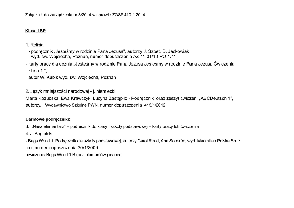 Załącznik do zarządzenia nr 8/2014 w sprawie ZGSP.410.1.2014 ! Klasa I SP ! 1. Religia - podręcznik „Jesteśmy w rodzinie Pana Jezusa", autorzy J. Szpet, D. Jackowiak wyd. św. Wojciecha, Poznań, numer dopuszczenia AZ-11-01/10-PO-1/11 - karty pracy dla ucznia „Jesteśmy w rodzinie Pana Jezusa Jesteśmy w rodzinie Pana Jezusa Ćwiczenia klasa 1 ", autor W. Kubik wyd. św. Wojciecha, Poznań ! 2. Język mniejszości narodowej - j. niemiecki Marta Kozubska, Ewa Krawczyk, Lucyna Zastąpiło - Podręcznik oraz zeszyt ćwiczeń „ABCDeutsch 1”, autorzy, Wydawnictwo Szkolne PWN, numer dopuszczenia 415/1/2012 ! Darmowe podręczniki: 3. „Nasz elementarz” – podręcznik do klasy I szkoły podstawowej + karty pracy lub ćwiczenia 4. J. Angielski - Bugs World 1. Podręcznik dla szkoły podstawowej, autorzy Carol Read, Ana Soberón, wyd. Macmillan Polska Sp. z o.o., numer dopuszczenia 30/1/2009 -ćwiczenia Bugs World 1 B (bez elementów pisania)