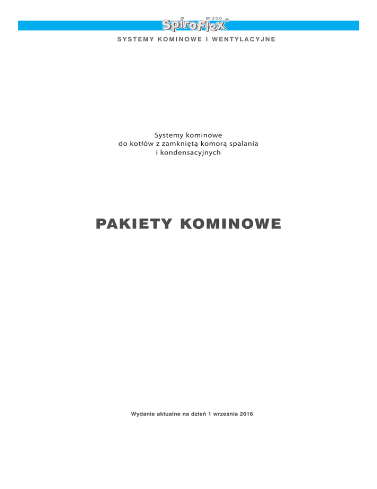 SYSTEMY KOMINOWE I WENTYLACYJNE Systemy kominowe do kotłów z zamkniętą komorą spalania i kondensacyjnych ADAPTERY PAKIETY KOMINOWE Wydanie aktualne na dzieƒ 1 wrzeÊnia 2016 39-300 Mielec, ul. Wojska Polskiego 6E tel. 17 7881770, 17 7881777; fax 17 7881771 www.spiroflex.com.pl SPIS TREÂCI 2. PAKIETY KOMINOWE . . . . . . . . . . . . . . . . . . . . . . . . . . . . . . . . . . . . . . . . . . . . . 33 2.1 Pakiety do kot∏ów ARISTON . . . . . . . . . . . . . . . . . . . . . . . . . . . . . . . . . . . 34 2.2 Pakiety do kot∏ów DE DIETRICH . . . . . . . . . . . . . . . . . . . . . . . . . . . 35 – 36 2.3 Pakiety do kot∏ów FERROLI . . . . . . . . . . . . . . . . . . . . . . . . . . . . . . . . . . 37 2.4 Pakiety do kot∏ów IMMERGAS . . . . . . . . . . . . . . . . . . . . . . . . . . . . . . . . 38 2.5 Pakiety do kot∏ów JUNKERS . . . . . . . . . . . . . . . . . . . . . . . . . . . . . . 39 – 40 2.6 Pakiety do kot∏ów SAUNIER DUVAL . . . . . . . . . . . . . . . . . . . . . . . . . . . 41 2.7 Pakiety do kot∏ów TERMET . . . . . . . . . . . . . . . . . . . . . . . . . . . . . . . . 42 – 43 2.8 Pakiety do kot∏ów VAILLANT . . . . . . . . . . . . . . . . . . . . . . . . . . . . . . . . . . . 44 2.9 Pakiety do kot∏ów VIESSMANN . . . . . . . . . . . . . . . . . . . . . . . . . . . . . . . . 45 2.10 Pakiety do kot∏ów WOLF . . . . . . . . . . . . . . . . . . . . . . . . . . . . . . . . . . . . . . . 46 PAKIETY KOMINOWE do kotłów z zamkniętą komorą spalania i kondensacyjnych 33 ARISTON TYP KOT¸A typ kotła: turbo Genus (kocioł turbo) Clas (kocioł turbo) BS (kocioł turbo) typ kotła: kondensacyjny Genius Premium (kocioł kondensacyjny) Clas Premium (kocioł kondensacyjny) KOMPLETACJA PAKIETU nazwa symbol* 1 adapter kolanowy biały | nierdzewny 2 rura dwuścienna 0,25 mb biała | nierdzewna SX-TD…/…RB0,25 | SX-TDN…/…R0,25 3 osłona biała | nierdzewna SX-TD…/…OSB | 4 kolano jednościenne 90O z podstawką nierdzewne 5 płyta przelotowa z kołnierzem | wywiewka z płytą dachową 1) SX-OKD…OS.. SX-TJN…KS90P SX-TJN…PP | SX-TDN…/…WPD.. * - w miejsce kropek należy wprowadzić wartość liczbową odpowienich średnic 1) opcja z wywiewką dostępna w przypadku zestawów do kotłów turbo ARISTON ZESTAW PRZYŁÑCZENIOWY W SZACHT KOMINOWY nazwa pakietu symbol typ kotła cena pakietu netto 1 60/100 zestaw przyłączeniowy w szacht AR biały SX-TD60/100PAKSZAR-B kondensacyjny 333,50 zł 2 60/100 zestaw przyłączeniowy w szacht AR nierdzewny SX-TDN60/100PAKSZAR-N kondensacyjny 333,60 zł 3 60/100 - 80/125 zestaw przyłączeniowy w szacht AR redukcyjny biały SX-TD80/125PAKSZARR-B kondensacyjny 396,20 zł 4 60/100 - 80/125 zestaw przyłączeniowy w szacht AR redukcyjny nierdzewny SX-TDN80/125PAKSZARR-N kondensacyjny 399,50 zł 5 60/100 zestaw przyłączeniowy w szacht AR z odskraplaczem biały SX-TD60/100PAKSZARO-B turbo 382,20 zł 6 60/100 zestaw przyłączeniowy w szacht AR z odskraplaczem nierdzewny SX-TDN60/100PAKSZARO-N turbo 382,00 zł 7 60/100 - 80/125 zestaw przyłączeniowy w szacht AR redukcyjny z odskraplaczem biały SX-TD80/125PAKSZARRO-B turbo 445,70 zł 8 60/100 - 80/125 zestaw przyłączeniowy w szacht AR redukcyjny z odskraplaczem nierdzewny SX-TDN80/125PAKSZARRO-N turbo 448,40 zł KOMPLETACJA PAKIETU symbol* nazwa 1 adapter kolanowy biały | nierdzewny 2 rura wylotowa dwuścienna biała | nierdzewna SX-TD…/...RWB | SX-TDN…/…RW SX-TD…/…OSB | SX-OKD...OS... 3 osłona biała | nierdzewna * - w miejsce kropek należy wprowadzić wartość liczbową odpowienich średnic ZESTAW WYLOTU BOCZNEGO nazwa pakietu 34 1 60/100 zestaw wylotu bocznego AR biały 2 60/100 zestaw wylotu bocznego AR nierdzewny 3 60/100 - 80/125 zestaw wylotu bocznego AR redukcyjny 4 60/100 - 80/125 zestaw wylotu bocznego AR redukcyjny 5 symbol typ kotła cena pakietu netto SX-TD60/100PAKBAR-B kondensacyjny 290,00 zł SX-TDN60/100PAKBAR-N kondensacyjny 289,90 zł biały SX-TD80/125PAKBARR-B kondensacyjny 357,70 zł nierdzewny SX-TDN80/125PAKBARR-N kondensacyjny 362,00 zł 60/100 zestaw wylotu bocznego AR z odskraplaczem biały SX-TD60/100PAKBARO-B turbo 329,80 zł 6 60/100 zestaw wylotu bocznego AR z odskraplaczem nierdzewny SX-TDN60/100PAKBARO-N turbo 331,70 zł 7 60/100 - 80/125 zestaw wylotu bocznego AR redukcyjny z odskraplaczem biały SX-TD80/125PAKBARRO-B turbo 399,90 zł 8 60/100 - 80/125 zestaw wylotu bocznego AR redukcyjny z odskraplaczem nierdzewny SX-TDN80/125PAKBARRO-N turbo 403,70 zł DE DIETRICH TYP KOT¸A typ kotła: turbo ZENA MS 24 BIC, MS 24 BIC FF (kocioł turbo) ZENA MS 24, MS 24 FF (kocioł turbo) ZENA MS 24 MI, MS 24 MI FF (kocioł turbo) MAINFOUR 240F, 18F, 24 (kocioł turbo) KOMPLETACJA PAKIETU symbol nazwa 1 adapter kolanowy z odskraplaczem biały | nierdzewny SX-TD.../…RB0,25 | SX-TDN…/…R0,25 2 rura dwuścienna 0,25 mb biała | nierdzewna 3 osłona biała | nierdzewna SX-TD…/…OSB | SX-OKD…OS ... O 4 kolano jednościenne 90 z podstawką nierdzewne SX-TJN…KS90P 5 wywiewka z płytą dachową ZESTAW PRZYŁÑCZENIOWY W SZACHT KOMINOWY nazwa pakietu symbol typ kotła cena pakietu netto 1 60/100 zestaw przyłączeniowy w szacht DD z odskraplaczem biały SX-TD60/100PAKSZDDO-B turbo 387,70 zł 2 60/100 zestaw przyłączeniowy w szacht DD z odskraplaczem nierdzewny SX-TDN60/100PAKSZDDO-N turbo 387,70 zł 3 60/100 - 80/125 zestaw przyłączeniowy w szacht DD redukcyjny z odskraplaczem biały SX-TD80/125PAKSZDDRO-B turbo 448,30 zł 4 60/100 - 80/125 zestaw przyłączeniowy w szacht DD redukcyjny z odskraplaczem nierdzewny SX-TDN80/125PAKSZDDRO-N turbo 450,40 zł DE DIETRICH SX-TDN…/…WPD KOMPLETACJA PAKIETU symbol nazwa 1 adapter kolanowy z odskraplaczem biały | nierdzewny 2 rura wylotowa dwuścienna biała | nierdzewna SX-TD…/...RWB | SX-TDN…/…RW 3 osłona biała | nierdzewna SX-TD…/…OSB | SX-OKD...OS.... ZESTAW WYLOTU BOCZNEGO nazwa pakietu symbol typ kotła cena pakietu netto 1 60/100 zestaw wylotu bocznego DD z ods