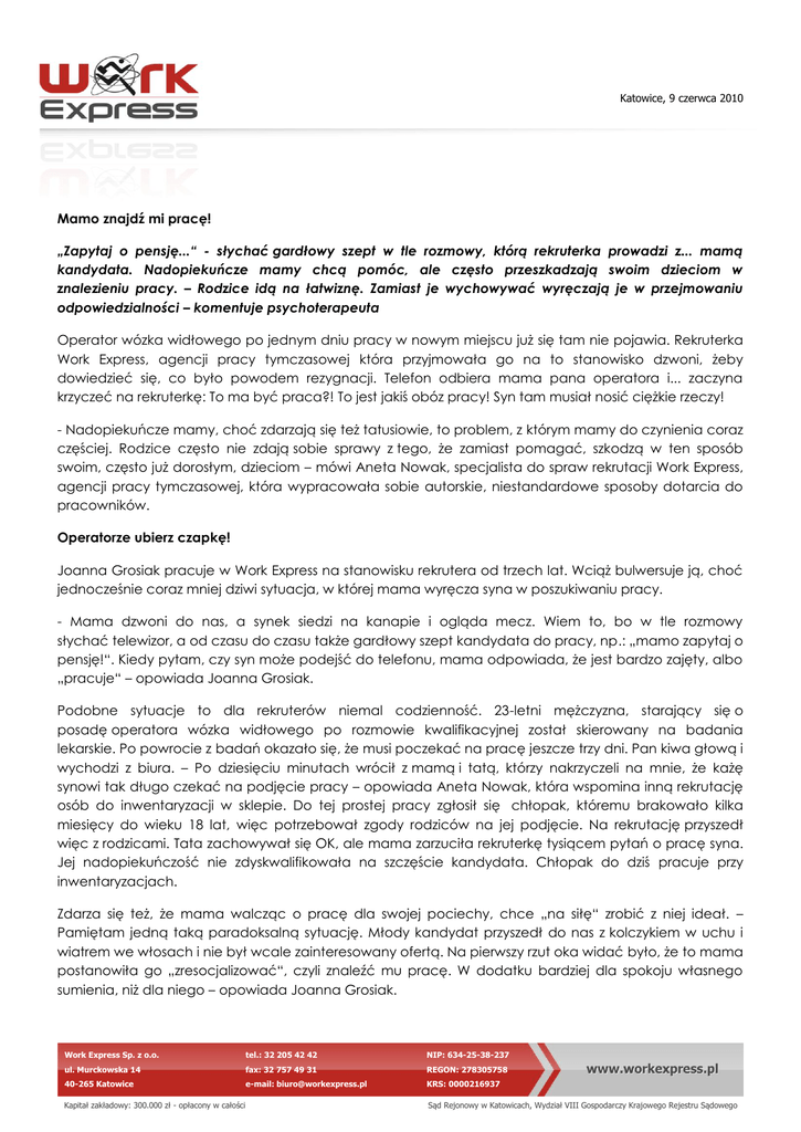 Katowice, 9 czerwca 2010 Mamo znajdź mi pracę! „Zapytaj o pensję...“ - słychać gardłowy szept w tle rozmowy, którą rekruterka prowadzi z... mamą kandydata. Nadopiekuńcze mamy chcą pomóc, ale często przeszkadzają swoim dzieciom w znalezieniu pracy. – Rodzice idą na łatwiznę. Zamiast je wychowywać wyręczają je w przejmowaniu odpowiedzialności – komentuje psychoterapeuta Operator wózka widłowego po jednym dniu pracy w nowym miejscu już się tam nie pojawia. Rekruterka Work Express, agencji pracy tymczasowej która przyjmowała go na to stanowisko dzwoni, żeby dowiedzieć się, co było powodem rezygnacji. Telefon odbiera mama pana operatora i... zaczyna krzyczeć na rekruterkę: To ma być praca?! To jest jakiś obóz pracy! Syn tam musiał nosić ciężkie rzeczy! - Nadopiekuńcze mamy, choć zdarzają się też tatusiowie, to problem, z którym mamy do czynienia coraz częściej. Rodzice często nie zdają sobie sprawy z tego, że zamiast pomagać, szkodzą w ten sposób swoim, często już dorosłym, dzieciom – mówi Aneta Nowak, specjalista do spraw rekrutacji Work Express, agencji pracy tymczasowej, która wypracowała sobie autorskie, niestandardowe sposoby dotarcia do pracowników. Operatorze ubierz czapkę! Joanna Grosiak pracuje w Work Express na stanowisku rekrutera od trzech lat. Wciąż bulwersuje ją, choć jednocześnie coraz mniej dziwi sytuacja, w której mama wyręcza syna w poszukiwaniu pracy. - Mama dzwoni do nas, a synek siedzi na kanapie i ogląda mecz. Wiem to, bo w tle rozmowy słychać telewizor, a od czasu do czasu także gardłowy szept kandydata do pracy, np.: „mamo zapytaj o pensję!“. Kiedy pytam, czy syn może podejść do telefonu, mama odpowiada, że jest bardzo zajęty, albo „pracuje“ – opowiada Joanna Grosiak. Podobne sytuacje to dla rekruterów niemal codzienność. 23-letni mężczyzna, starający się o posadę operatora wózka widłowego po rozmowie kwalifikacyjnej został skierowany na badania lekarskie. Po powrocie z badań okazało się, że musi poczekać na pracę jeszcze trzy dni. Pan kiwa głową i wychodzi z biura. – Po dziesięciu minutach wrócił z mamą i tatą, którzy nakrzyczeli na mnie, że każę synowi tak długo czekać na podjęcie pracy – opowiada Aneta Nowak, która wspomina inną rekrutację osób do inwentaryzacji w sklepie. Do tej prostej pracy zgłosił się chłopak, któremu brakowało kilka miesięcy do wieku 18 lat, więc potrzebował zgody rodziców na jej podjęcie. Na rekrutację przyszedł więc z rodzicami. Tata zachowywał się OK, ale mama zarzuciła rekruterkę tysiącem pytań o pracę syna. Jej nadopiekuńczość nie zdyskwalifikowała na szczęście kandydata. Chłopak do dziś pracuje przy inwentaryzacjach. Zdarza się też, że mama walcząc o pracę dla swojej pociechy, chce „na siłę“ zrobić z niej ideał. – Pamiętam jedną taką paradoksalną sytuację. Młody kandydat przyszedł do nas z kolczykiem w uchu i wiatrem we włosach i nie był wcale zainteresowany ofertą. Na pierwszy rzut oka widać było, że to mama postanowiła go „zresocjalizować“, czyli znaleźć mu pracę. W dodatku bardziej dla spokoju własnego sumienia, niż dla niego – opowiada Joanna Grosiak. Work Express Sp. z o.o. tel.: 32 205 42 42 NIP: 634-25-38-237 ul. Murckowska 14 fax: 32 757 49 31 REGON: 278305758 40-265 Katowice e-mail: [email protected] KRS: 0000216937 Kapitał zakładowy: 300.000 zł - opłacony w całości Sąd Rejonowy w Katowicach, Wydział VIII Gospodarczy Krajowego Rejestru Sądowego Katowice, 9 czerwca 2010 Skrajnym przykładem nadopiekuńczości rodziców są sytuacje, w których strofują oni swoje dzieci i w obecności rekrutera mówią np.: „Ubierz się“, “Załóż czapkę“, czy: „Słuchaj! Pani do Ciebie mówi!“. Kto komu pomaga? Zdarza się też, że rodzic pojawia się z dzieckiem w agencji rekrutacyjnej w charakterze zarówno szukającego pracy, jak i rekomendującego. Kilka dni temu w odpowiedzi na ogłoszenie o pracę w charakterze montera w biurze Work Express pojawiło się dwóch panów. Z początku rekruterka myślała, że to koledzy, ale szybko okazało się, że to ojciec z synem. Obaj z kwalifikacjami, tyle że syn dopiero zaczynał w branży. Panowie uparli się, żeby zostać na rozmowie razem. Problem w tym, że na pytania kierowane do syna odpowiadał tata. „No przecież to robiłeś“, wspierał kandydaturę swojego syna. Ostatecznie senior dostał inną propozycję lepszej pracy, a junior tę, po którą zgłosili się obaj panowie. – Syn z pewnością poradziłby sobie i gdyby nie tata, zrobiłby lepsze wrażenie jako kandydat do pracy – mówi Aneta Nowak. Innym razem do biura przyszła mama z córką. W czasie rozmowy to córka zaczęła rekomendować mamę, która była już starszą osobą i nie do końca przekonywała rekruterki co do tego, że nadaje się na stanowisko, o które zabiega. Córka zaczęła szczerze zachwalać mamę: że świetnie sobie radzi w nowych sytuacjach, obsługuje komputer, pracuje sprawnie pod presją czasu i stresu. – Takie szczere i otwarte polecenie jest oczywiście czynnikiem, który bardzo pozytywnie wpływa na ocenę kandydata – mówi Aneta Nowak. Osobnym problemem związanym z brakiem samodzielności rekrutowanych młodych ludzi jest brak dbałości o poziom dokumentów aplikacyjnych. – Często spotykamy się z sytuacją, że ktoś nie wie, co dokładnie jest napisane w jego własnym liście motywacyjnym, czy CV. Pamiętam rozmowę z parą, w której chłopak przyznał się ze śmiechem: nie wiem, bo to ona to pisała. Takie podejście do sprawy może nie dyskwalifikuje kandydata, ale z pewnością działa na jego niekorzyść, bo podważa jego wiarygodność – mówi Aneta Nowak. Rodzice wierzcie w dzieci, dzieci wierzcie w siebie! Rekruterki Work Express radzą: - Wiarygodność kandydata to jeden z najważniejszych faktorów, który biorą pod uwagę pracodawcy. Za