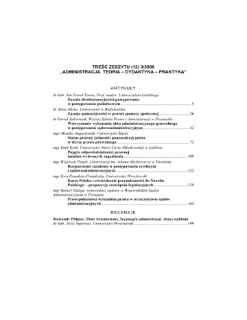 TREŚĆ ZESZYTU (12) 3/2008 „ADMINISTRACJA. TEORIA – DYDAKTYKA – PRAKTYKA” ARTYKUŁ Y dr hab. Jan Paweł Tarno, Prof. nadzw. Uniwersytetu Łódzkiego Zasada dwuinstancyjności postępowania w postępowaniu podatkowym.................................................................... 5 dr Alina Miruć, Uniwersytet w Białymstoku Zasada pomocniczości w prawie pomocy społecznej............................. 26 dr Paweł Zaborniak, Wyższa Szkoła Prawa i Administracji w Przemyślu Wstrzymanie wykonania aktu administracyjnego generalnego w postępowaniu sądowoadministracyjnym ............................................ 42 mgr Monika Augustyniak, Uniwersytet Śląski Status prawny jednostki pomocniczej gminy w sferze prawa prywatnego ..................................................................... 72 mgr Emil Kruk, Uniwersytet Marii Curie-Skłodowskiej w Lublinie Pojęcie odpowiedzialności prawnej (analiza wybranych zagadnień)............................................................. 109 mgr Wojciech Piątek, Uniwersytet im. Adama Mickiewicza w Poznaniu Rozpatrzenie zażalenia w postępowaniu cywilnym i sądowoadministracyjnym .................................................................... 122 mgr Ewa Prandota-Prandecka, Uniwersytet Wrocławski Karta Polaka i stwierdzenie przynależności do Narodu Polskiego – propozycje rozwiązań legislacyjnych................................ 139 mgr Robert Talaga, referendarz sądowy w Wojewódzkim Sądzie Administracyjnym w Poznaniu Prowspólnotowa wykładnia prawa w orzecznictwie sądów administracyjnych .................................................................................. 164 R EC ENZJ E Sławomir Pilipiec, Piotr Szreniawski, Socjologia administracji. Zarys wykładu dr hab. Jerzy Supernat, Uniwersytet Wrocławski................................................... 199 Spis treści S P R AWOZD AN I A Sprawozdanie z kolokwium habilitacyjnego doktora nauk prawnych Zbigniewa Czarnika dr Robert Sawuła, Wyższa Szkoła Prawa i Administracji w Przemyślu ................. 207 „10 lat reformy ustrojowej administracji publicznej w Polsce”. Ogólnopolska Konferencja Naukowa. Łańcut, 12-14 czerwca 2008 r. mgr Emil Kruk, Uniwersytet Marii Curie-Skłodowskiej w Lublinie; dr Jerzy Parchomiuk, Katolicki Uniwersytet Lubelski .......................................... 221 „Stosunek postępowania sądowoadministracyjnego do postępowania cywilnego”. II Letnie Warsztaty Doktoranckie, Gorzów Wielkopolski, 2-4 VII 2008 r. dr Robert Sawuła, Wyższa Szkoła Prawa i Administracji w Przemyślu ................. 227 GLOSY mgr Maciej Kobak, Wyższa Szkoła Prawa i Administracji w Przemyślu Glosa do wyroku Wojewódzkiego Sądu Administracyjnego we Wrocławiu z dnia 25 czerwca 2007 r., I SA/Wr 817/07 (niepubl.) ..................................................................... 232 4