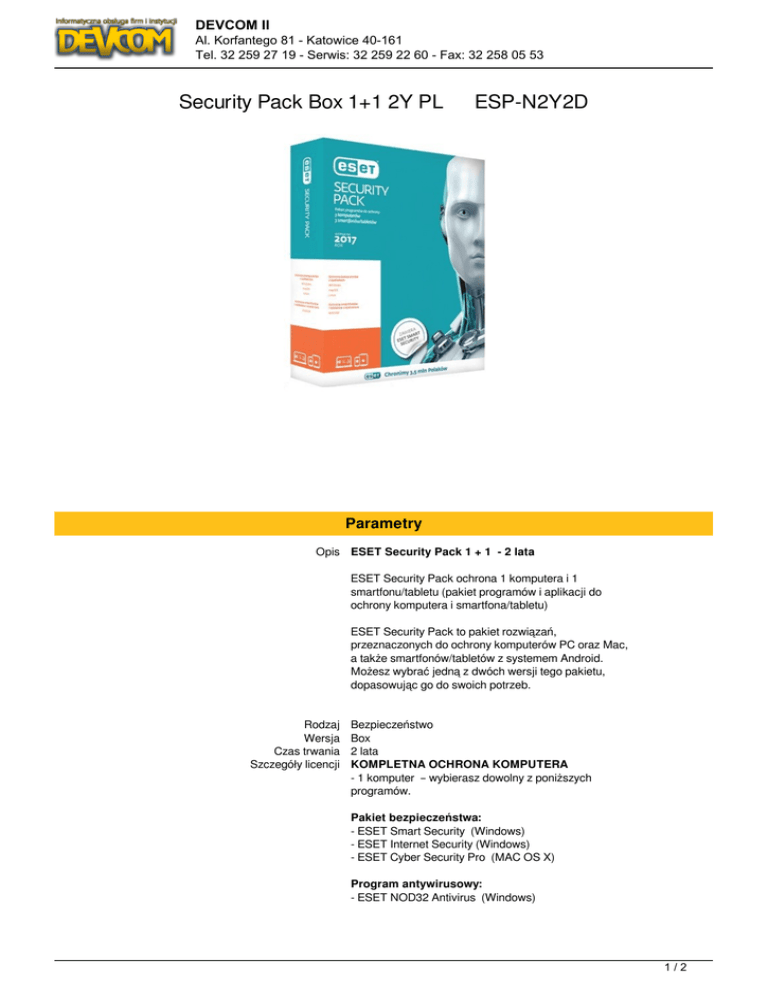 DEVCOM II Al. Korfantego 81 - Katowice 40-161 Tel. 32 259 27 19 - Serwis: 32 259 22 60 - Fax: 32 258 05 53 Security Pack Box 1+1 2Y PL ESP-N2Y2D Parametry Opis ESET Security Pack 1 + 1 - 2 lata ESET Security Pack ochrona 1 komputera i 1 smartfonu/tabletu (pakiet programów i aplikacji do ochrony komputera i smartfona/tabletu) ESET Security Pack to pakiet rozwiązań, przeznaczonych do ochrony komputerów PC oraz Mac, a także smartfonów/tabletów z systemem Android. Możesz wybrać jedną z dwóch wersji tego pakietu, dopasowując go do swoich potrzeb. Rodzaj Wersja Czas trwania Szczegóły licencji Bezpieczeństwo Box 2 lata KOMPLETNA OCHRONA KOMPUTERA - 1 komputer – wybierasz dowolny z poniższych programów. Pakiet bezpieczeństwa: - ESET Smart Security (Windows) - ESET Internet Security (Windows) - ESET Cyber Security Pro (MAC OS X) Program antywirusowy: - ESET NOD32 Antivirus (Windows) 1/2 DEVCOM II Al. Korfantego 81 - Katowice 40-161 Tel. 32 259 27 19 - Serwis: 32 259 22 60 - Fax: 32 258 05 53 - ESET NOD32 Antivirus (Linux) - ESET Cyber Security (MAC OS X) KOMPLETNA OCHRONA SMARTFONA/TABLETU - 1 urządzenie. Pakiet bezpieczeństwa: - ESET Mobile Security (Android) Rezygnując z kompletnej ochrony dla jednego smartfona/tabletu możesz zainstalować aplikację do kontroli rodzicielskiej. KONTROLA RODZICIELSKA SMARTFONÓW/TABLETÓW - Dowolna liczba smartfonów i tabletów w ramach jednej rodziny. - ESET Parental Control (Android) 2/2 Powered by TCPDF (www.tcpdf.org)