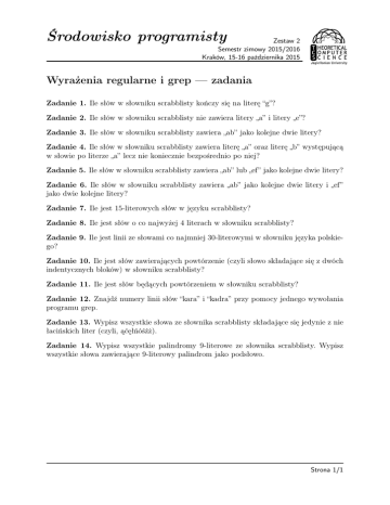 Środowisko programisty Zestaw 2 Semestr zimowy 2015/2016 Kraków, 15-16 października 2015 Wyrażenia regularne i grep — zadania Zadanie 1. Ile słów w słowniku scrabblisty kończy się na literę “g”? Zadanie 2. Ile słów w słowniku scrabblisty nie zawiera litery „a” i litery „e”? Zadanie 3. Ile słów w słowniku scrabblisty zawiera „ab” jako kolejne dwie litery? Zadanie 4. Ile słów w słowniku scrabblisty zawiera literę „a” oraz literę „b” występującą w słowie po literze „a” lecz nie koniecznie bezpośrednio po niej? Zadanie 5. Ile słów w słowniku scrabblisty zawiera „ab” lub „ef” jako kolejne dwie litery? Zadanie 6. Ile słów w słowniku scrabblisty zawiera „ab” jako kolejne dwie litery i „ef” jako dwie kolejne litery? Zadanie 7. Ile jest 15-literowych słów w języku scrabblisty? Zadanie 8. Ile jest słów o co najwyżej 4 literach w słowniku scrabblisty? Zadanie 9. Ile jest linii ze słowami co najmniej 30-literowymi w słowniku języka polskiego? Zadanie 10. Ile jest słów zawierających powtórzenie (czyli słowo składające się z dwóch indentycznych bloków) w słowniku scrabblisty? Zadanie 11. Ile jest słów będących powtórzeniem w słowniku scrabblisty? Zadanie 12. Znajdź numery linii słów “kara” i “kadra” przy pomocy jednego wywołania programu grep. Zadanie 13. Wypisz wszystkie słowa ze słownika scrabblisty składające się jedynie z nie łacińskich liter (czyli, ąćęłńóśźż). Zadanie 14. Wypisz wszystkie palindromy 9-literowe ze słownika scrabblisty. Wypisz wszystkie słowa zawierające 9-literowy palindrom jako podsłowo. Strona 1/1