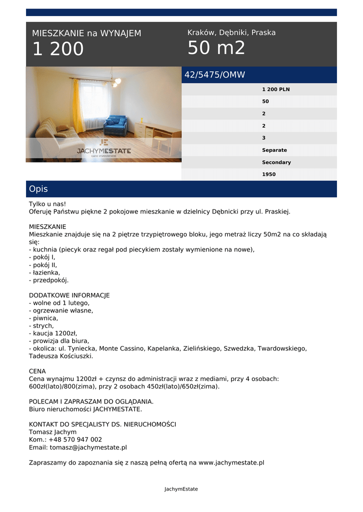 Kraków, Dębniki, Praska MIESZKANIE na WYNAJEM 50 m2 1 200 42/5475/OMW 1 200 PLN 50 2 2 3 Separate Secondary 1950 Opis Tylko u nas! Oferuję Państwu piękne 2 pokojowe mieszkanie w dzielnicy Dębnicki przy ul. Praskiej. MIESZKANIE Mieszkanie znajduje się na 2 piętrze trzypiętrowego bloku, jego metraż liczy 50m2 na co składają się: - kuchnia (piecyk oraz regał pod piecykiem zostały wymienione na nowe), - pokój I, - pokój II, - łazienka, - przedpokój. DODATKOWE INFORMACJE - wolne od 1 lutego, - ogrzewanie własne, - piwnica, - strych, - kaucja 1200zł, - prowizja dla biura, - okolica: ul. Tyniecka, Monte Cassino, Kapelanka, Zielińskiego, Szwedzka, Twardowskiego, Tadeusza Kościuszki. CENA Cena wynajmu 1200zł + czynsz do administracji wraz z mediami, przy 4 osobach: 600zł(lato)/800(zima), przy 2 osobach 450zł(lato)/650zł(zima). POLECAM I ZAPRASZAM DO OGLĄDANIA. Biuro nieruchomości JACHYMESTATE. KONTAKT DO SPECJALISTY DS. NIERUCHOMOŚCI Tomasz Jachym Kom.: +48 570 947 002 Email: [email protected] Zapraszamy do zapoznania się z naszą pełną ofertą na www.jachymestate.pl JachymEstate Tomasz Jachym tel. 570 947 002 email: [email protected] JachymEstate Powered by TCPDF (www.tcpdf.org)