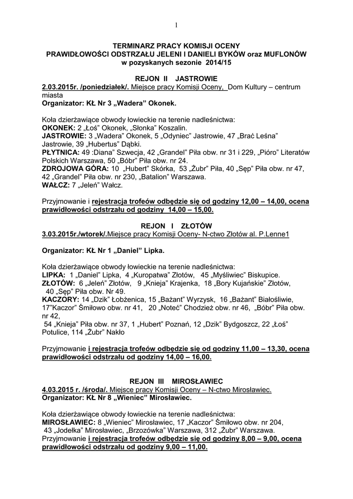 1 TERMINARZ PRACY KOMISJI OCENY PRAWIDŁOWOŚCI ODSTRZAŁU JELENI I DANIELI BYKÓW oraz MUFLONÓW w pozyskanych sezonie 2014/15 REJON II JASTROWIE 2.03.2015r. /poniedziałek/. Miejsce pracy Komisji Oceny, Dom Kultury – centrum miasta Organizator: KŁ Nr 3 „Wadera” Okonek. Koła dzierżawiące obwody łowieckie na terenie nadleśnictwa: OKONEK: 2 „Łoś” Okonek, „Słonka” Koszalin. JASTROWIE: 3 „Wadera” Okonek, 5 „Odyniec” Jastrowie, 47 „Brać Leśna” Jastrowie, 39 „Hubertus” Dąbki. PŁYTNICA: 49 :Diana” Szwecja, 42 „Grandel” Piła obw. nr 31 i 229, „Pióro” Literatów Polskich Warszawa, 50 „Bóbr” Piła obw. nr 24. ZDROJOWA GÓRA: 10 „Hubert” Skórka, 53 „Żubr” Piła, 40 „Sęp” Piła obw. nr 47, 42 „Grandel” Piła obw. nr 230, „Batalion” Warszawa. WAŁCZ: 7 „Jeleń” Wałcz. Przyjmowanie i rejestracja trofeów odbędzie się od godziny 12,00 – 14,00, ocena prawidłowości odstrzału od godziny 14,00 – 15,00. REJON I ZŁOTÓW 3.03.2015r./wtorek/.Miejsce pracy Komisji Oceny- N-ctwo Złotów al. P.Lenne1 Organizator: KŁ Nr 1 „Daniel” Lipka. Koła dzierżawiące obwody łowieckie na terenie nadleśnictwa: LIPKA: 1 „Daniel” Lipka, 4 „Kuropatwa” Złotów, 45 „Myśliwiec” Biskupice. ZŁOTÓW: 6 „Jeleń” Złotów, 9 „Knieja” Krajenka, 18 „Bory Kujańskie” Złotów, 40 „Sęp” Piła obw. Nr 49. KACZORY: 14 „Dzik” Łobżenica, 15 „Bażant” Wyrzysk, 16 „Bażant” Białośliwie, 17”Kaczor” Śmiłowo obw. nr 41, 20 „Noteć” Chodzież obw. nr 46, „Bóbr” Piła obw. nr 42, 54 „Knieja” Piła obw. nr 37, 1 „Hubert” Poznań, 12 „Dzik” Bydgoszcz, 22 „Łoś” Potulice, 114 „Żubr” Nakło Przyjmowanie i rejestracja trofeów odbędzie się od godziny 11,00 – 13,30, ocena prawidłowości odstrzału od godziny 14,00 – 16,00. REJON III MIROSŁAWIEC 4.03.2015 r. /środa/. Miejsce pracy Komisji Oceny – N-ctwo Mirosławiec. Organizator: KŁ Nr 8 „Wieniec” Mirosławiec. Koła dzierżawiące obwody łowieckie na terenie nadleśnictwa: MIROSŁAWIEC: 8 „Wieniec” Mirosławiec, 17 „Kaczor” Śmiłowo obw. nr 204, 43 „Jodełka” Mirosławiec, „Brzozówka” Warszawa, 312 „Żubr” Warszawa. Przyjmowanie i rejestracja trofeów odbędzie się od godziny 8,00 – 9,00, ocena prawidłowości odstrzału od godziny 9,00 – 11,00. 2 REJON IV CZŁOPA 4.03.2015r. /środa/. Miejsce pracy Komisji Oceny SALA NARAD w NADLEŚNICTWIE TUCZNO ul. Klasztorna 9 Organizator: KŁ nr 46 „Ponowa” Piła. Koła dzierżawiące obwody na terenie nadleśnictwa: TUCZNO:11 „Sokół” Wałcz, 12 „Darz Bór” Mielęcin obw. nr 234, 46 „Ponowa” PiłaKalina obw. nr 233, 51 „Róża” Piła, 52 „Rogacz” Piła, „Nemrod” Warszawa. przyjmowanie i rejestracja trofeów odbędzie się od 12,00 – 13,00 godz. CZŁOPA: 12 „Darz Bór” Mielęcin obw. nr 237, 13 „Żuraw” Człopa, „Ostęp” Warszawa, 52 Kujawskie Koło Łowieckie Inowrocław. przyjmowanie i rejestracja trofeów odbędzie się od 14,00 – 15,00 godz. 5.03.2015 r./ czwartek/. Miejsce pracy Komisji Oceny Nadleśnictwo KRZYŻ Organizator: KŁ nr 18 „Drop” Poznań. Koła dzierżawiące obwody na terenie nadleśnictwa: KRZYŻ: 25 „Leśnik” Dzierżążno Wielkie, 10 „Knieja” Poznań, 41 „Drawa” Wizany , 31 ”Kaczka” Poznań, 18 „Drop” Poznań. przyjmowanie i rejestracja trofeów odbędzie się od 8,00 – 9,00 godz. 5.03.2015 r./ czwartek/. Miejsce pracy Komisji Oceny Nadleśnictwo TRZCIANKA Organizator: KŁ nr 22 „Knieja” Trzcianka. Koła dzierżawiące obwody na terenie nadleśnictwa: TRZCIANKA: 21 „Dzik” Trzcianka, 22 „Knieja” Trzcianka, 46 „Ponowa” Piła-Kalina obw. nr 43, 54 „Knieja” Piła obw. nr 66, „Trop” Piła, 82 „Jeleń” Poznań, 339 „Sokół” Warszawa. przyjmowanie i rejestracja trofeów odbędzie się od 12,00 – 13,00 godz. UWAGA: Ocena prawidłowości odstrzału będzie przeprowadzona dla obwodów z terenu poszczególnych Nadleśnictw, bezpośrednio po zakończeniu przyjęcia i ich rejestracji. 3 REJON V PODANIN 6.03.2015 r. /piątek/. Miejsce pracy Komisji Oceny – Nadleśnictwo Podanin Organizator: KŁ nr 29 „Daniel” Podanin. SARBIA: 24 „Jeleń” Ujście, 30 „Dzik” Czarnków obw. nr 68, 31 „Kruk” Czarnków. PODANIN: 19 „Ponowa” Margonin, 20 „Noteć” Chodzież obw. nr 50, 23 „Ostoja” Chodzież, 29 „Daniel” Podanin, 34 „Szarak” Budzyń. Przyjmowanie i rejestracja trofeów odbędzie się od godziny 11,00 – 13,00, ocena prawidłowości odstrzału od godziny 13,00 – 15,00. REJON VI DUROWO 10.03.2015r. /wtorek/ Miejsce pracy Komisji Oceny – Dom Łowiecki KŁ 58 „ODYNIEC” w MIEŚCISKU Organizator: KŁ nr 58 „Odyniec” Mieścisko. DUROWO: 26 „Zając” Wapno, 27 „Darz Bór” Gołańcz, 28 „Szarak” Wągrowiec, 32 „Jeleń” Wągrowiec, 33 „Cyranka” Wągrowiec, 57 „Borsuk” Skoki, 58 „Odyniec” Mieścisko, 7 „Przylesie” przy AR Poznań, 11 „Darzbór” Poznań, 16 „Dzik” Poznań, 19 „Łoś” Poznań obw. nr 90 i 105, 87 „Drop” Poznań, 58 „Olszyna” Rogoźno, 34 „Jeleń” Swarzędz, 83 „Szarak” Poznań. „Watacha” Czerniejewo obw. nr 152. Przyjmowanie i rejestracja trofeów odbędzie się od godziny 10,00 – 12,00, ocena prawidłowości odstrzału od godziny 12,00 – 14,00. REJON VII POTRZEBOWICE 11.03.2014r. /środa/. Miejsce Pracy Komisji Oceny – N-ctwo Potrzebowice. Organizator: KŁ nr 37 „Puszcza Nadnotecka” Drawsko. Koła dzierżawiące obwody łowieckie na terenie nadleśnictwa: KRUCZ:, 35 „Słonka” Goraj, 38 „Darz Bór” Połajewo, 26 „Leśnik” Poznań, 29 „Jaźwiec” Poznań, 39 „Bielik” Kruteczek. POTRZEBOWICE: 30 „Dzik” Czarnków obw. nr 77, 36 „Puszcza” Potrzebowice, 37 „Puszcza Nadnotecka” Drawsko, 3 „Złota Kielnia” Poznań,. Przyjmowanie i rejestracja trofeów odbędzie się od godziny 10