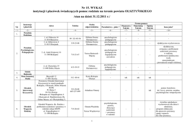 Nr 15. WYKAZ instytucji i placówek świadczących pomoc rodzinie na terenie powiatu OLSZTYŃSKIEGO /stan na dzień 31.12.2011 r./ Lp. -11. Instytucje i placówki -2Poradnia Rodzinna Telefon Osoba odpowiedzialna Poradnictwo - jakie ? -3- -4- -5- -6- Finansowa Tak/nie -7- - - - - - - - - Elżbieta Dorota Hermanowicz Elżbieta Dorota Hermanowicz -psychologiczne -pedagogiczne -psychologiczne -pedagogiczne - - - - - - - dydaktyczno-wychowawcza 1. ul. Północna 14 11-010 Barczewo 2. ul. Klikowicza 4 11-015 Olsztynek 2. 3. 4. 5. 6. Poradnia PsychologicznoPedagogiczna Szkoła Rodzenia Dom Samotnej Matki Ośrodek Interwencji Kryzysowej Ośrodek Wsparcia Rodziny Forma pomocy Materialna Opieka Tak/nie Tak/nie - 8-9- Adres 3. ul. Armii Krajowej 16 11-300 Biskupiec 89 521-05-56 519-23-08 - - - psychologiczne, pedagogiczne, logopedyczne - - - - - - - - - - 512 -05-61 Kuria Biskupia Olsztyn - tak tak tak 523-28-08 665-237-899 Arkadiusz Paturej - - - tak 715-21-67 4. ul. Olsztyńska 19 11-040 Dobre Miasto 615-19-35 Elżbieta Hermanowicz - - Ośrodek Wsparcia dla Rodzin z problemem uzależnień i przemocy w rodzinie sekcja MOPS ul. Niepodległości 4 11-300 Biskupiec - 10 - -dydaktyczna, -związana z problemami uzależnień, przemocy w rodzinie, -problemami dydaktycznowych. emocjonalnymi, - prowadzenie terapii rodzinnej Teresa Bartoszek Majsiej Brąswałd 12 11-001 Dywity Powiatowy Ośrodek Interwencji Kryzysowej (w trzech punktachBiskupiec, Olsztynek, Dobre Miasto) PCPR Pl. Bema 5 10-516 Olsztyn - Biskupiec ul. Niepodległości 4 - Olsztynek ul. Sienkiewicza 26, - Dobre Miasto, ul. Olsztyńskiej 3, Inna jaka? Danuta Plucińska 715-26-62 Teresa Więckiewicz 1 -psychologiczne -pedagogiczne -logopedyczne -zawodowe -psychologiczne, -prawne, -dotyczące uzależnień i przemocy w rodzinie - - - pomoc hostelowa– do 3 m-cy, prawna, socjalna, psychologiczna i terapeutyczna -świetlice opiekuńczowychowawcze dla dzieci i młodzieży, -program edukacyjny dla sprawców przemocy -grupy wsparcia dla ofiar przemocy, AA-Grupa Wsparcia ul. Kajki 20 11-320 Jeziorany Grupa Wsparcia – osoby współuzależnione ul. Kajki 20 11-320 Jeziorany 1. Poradnia Terapii Uzależnienie i Współuzależnienia od alkoholu ul. Olsztyńska 3 11-040 Dobre Miasto 7. Poradnie Uzależnień: dot. alkoholu 089 718 14 80 Czesław Siedlecki Grupa wsparcia - - - - 089 718 14 80 Elżbieta Kołecka Grupa samopomocowa - - - - Danuta Werner - profilaktyka, -diagnozowanie leczenia 089 616 82 39 2. Ośrodek Profilaktyki i Pomocy Rodzinie ul. Olsztyńska 3 11-040 Dobre Miasto 089 616-29-99 3. Gminna Komisja Rozwiązywania Problemów Alkoholowych ul. Olsztyńska 3 11-040 Dobre Miasto 089 616-19-99 4. Poradnia Zdrowia Psychicznego ul. Armii Krajowej 8 11-300 Biskupiec 5. Punkt Konsultacyjno-Doradczy ul. Słowackiego 5 11–010 Barczewo 6. Gminna Komisja Rozwiązywania Problemów Alkoholowych ul. Słowackiego 5 11–010 Barczewo Zespół Interdyscyplinarny Józef Gryganiec Józef Gryganiec psychologiczne, prawne z profilaktyki uzależnień, przemocy w rodzinie, edukacja dot. uzależnień przyjmowanie zgłoszeń, doradztwo, wsparcie i motywowanie podjęcia leczenia 715-20-23 wew. 323 Tomasz Źysko -medyczne i terapeutyczne związane z problemem uzależnień, problemami zdrowia psychicznego 514-97-47 Jarosław Złotkowski - psychologiczna, - psychiatryczne, - terapeutyczne, - prawne 514-97-98 Tomasz Michałowski 2 - -poradnictwo terapia, -edukacja, -informacja - - grupy wsparcia dla współuzależnionych i DDA, konsultacje poradnictwo - - -terapia uzależnień oraz zaburzeń zdrowia psychicznego - - - - - - - -udzielanie wsparcie emocjonalnego, psychiczne, - - dotyczące przemocy w rodzinie, - poradnictwo dotyczące narkotyków - - przyjmowanie zgłoszeń - konsultacje - doradztwo - wsparcie związane z nadużywaniem alkoholu i przemocą w rodzinie Małgorzata Biadała -poradnictwo dotyczące uzależnień od alkoholu, -przemocy w rodzinie, -narkotyków nie nie nie - 716-32-26 Agnieszka Jeziorek -profilaktyczne -diagnozowanie - - - -profilaktyka -koordynacja i poradnictwo dotyczące uzależnienia od alkoholu 512-21-85 socjalno-pedagogiczne w zakresie uzależnień, Teresa Chrostowska przemocy, podjęcia leczenia nie - - - 512-92-10 523-77-64 -poradnictwo dotyczące używania alkoholu, -przemocy w rodzinie -narkotyków - - - przyjmowanie zgłoszeń -doradztwo -wsparcie związane z nadużywaniem alkoholi i przemocą w rodzinie 512-92-10 523-77-64 poradnictwo prawne i Daria Żyro psychologiczne Marta Suprynowicz dotyczące przemocy w Martyna rodzinie, używania Maciejewska alkoholu i narkotyków - - - - 616-98-83 Wanda Cieciuch - poradnictwo specjalistyczne, uzależnienia od alkoholu, przemocy w rodzinie, narkotyków - - - - 512-01-60 524-76-45 Teresa Kozicka -profilaktyczne -diagnozowanie - - - -konsultacje terapeutyczne -R. Brzozowski tel.5120123 7. Gminna Komisja Rozwiązywania Problemów Alkoholowych 11-036 Gietrzwałd 524-19-09 8. Gminna Komisja Rozwiązywania Problemów Alkoholowych 11-311 Kolno 9. Gminna Komisja Rozwiązywania Problemów Alkoholowych Purda 12A 11–030 Purda 10. Gminna Komisja Rozwiązywania Problemów Alkoholowych Ul. Lipowa 11 11–042 Jonkowo 11. Punkt InformacyjnoKonsultacyjny dla osób i rodzin dotkniętych przemocą, uzależnionych od alkoholu i narkotyków oraz członków ich rodzin, ul. Lipowa 11 11-042 Jonkowo 12. Punkt InformacyjnoKonsultacyjny Profilaktyki i Rozwiązywania Problemów Uzależnień oraz Przemocy w Rodzinie Gminna Komisja Rozwiązywania Problemów Alkoholowych Urząd Gminy w Świątkach 11-008 Świątki 13. Gminna Komisja Rozwiązywania Problemów Alkoholowych ul. Olsztyńska 32 11-001 Dywity Jan Żakowicz Daria Żyro 3 8. - dot. przemocy w rodzinie 9. - dot. narkotyków 10. dot. innych uzależnień 14. Gminna Komisja Rozwiązywania Problemów Alkoholowych ul. Niepodległości 4 11-300 Biskupiec 1. Punkt Konsultacyjno-Doradczy ul. Słowackiego 5 11-010 Barczewo Punkt Informacyjno-Konsultacyjny Profilaktyki i Ro